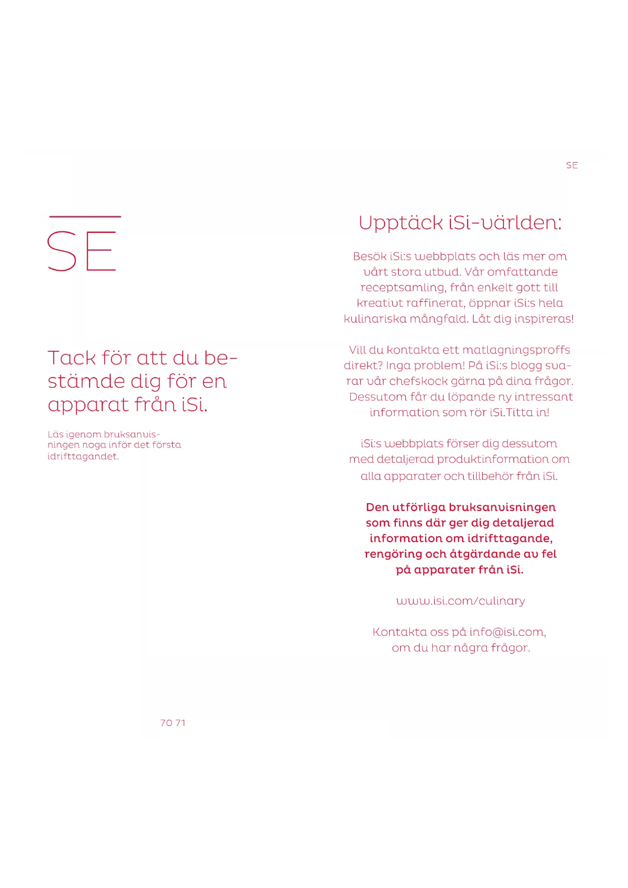 ——— „Druk laten ontsnappen“. Apparaat naar iSi of een servicepunt opsturen. Service. Vervangingsonderdelen zijn afzonderlijk verkrijgbaar tegen geringe kosten. Als u een vervangingsonderdeel wilt bestellen, neemt u contact op met de leverancier van uw iSi-apparaat. In Oostenrijk kunt u vervan- gingsonderdelen ook per e-mail bestellen via info@isi.com. Moet uw iSi-apparaat worden gerepareerd? Stuurt u dan altijd het complete apparaat op. Vervangingsonderdelen kunt u gedetailleerd terugvinden op de technische tekening. NL70 71 Upptäck iSi-världen: Besök iSi:s webbplats och läs mer om vårt stora utbud. Vår omfattande receptsamling, från enkelt gott till kreativt raffinerat, öppnar iSi:s hela kulinariska mångfald. Låt dig inspireras! Vill du kontakta ett matlagningsproffs direkt? Inga problem! På iSi:s blogg sva- rar vår chefskock gärna på dina frågor. Dessutom får du löpande ny intressant information som rör iSi.Titta in! iSi:s webbplats förser dig dessutom med detaljerad produktinformation om alla apparater och tillbehör från iSi. Den utförliga bruksanvisningen som finns där ger dig detaljerad information om idrifttagande, rengöring och åtgärdande av fel på apparater från iSi. www.isi.com/culinary Kontakta oss på info@isi.com, om du har några frågor.