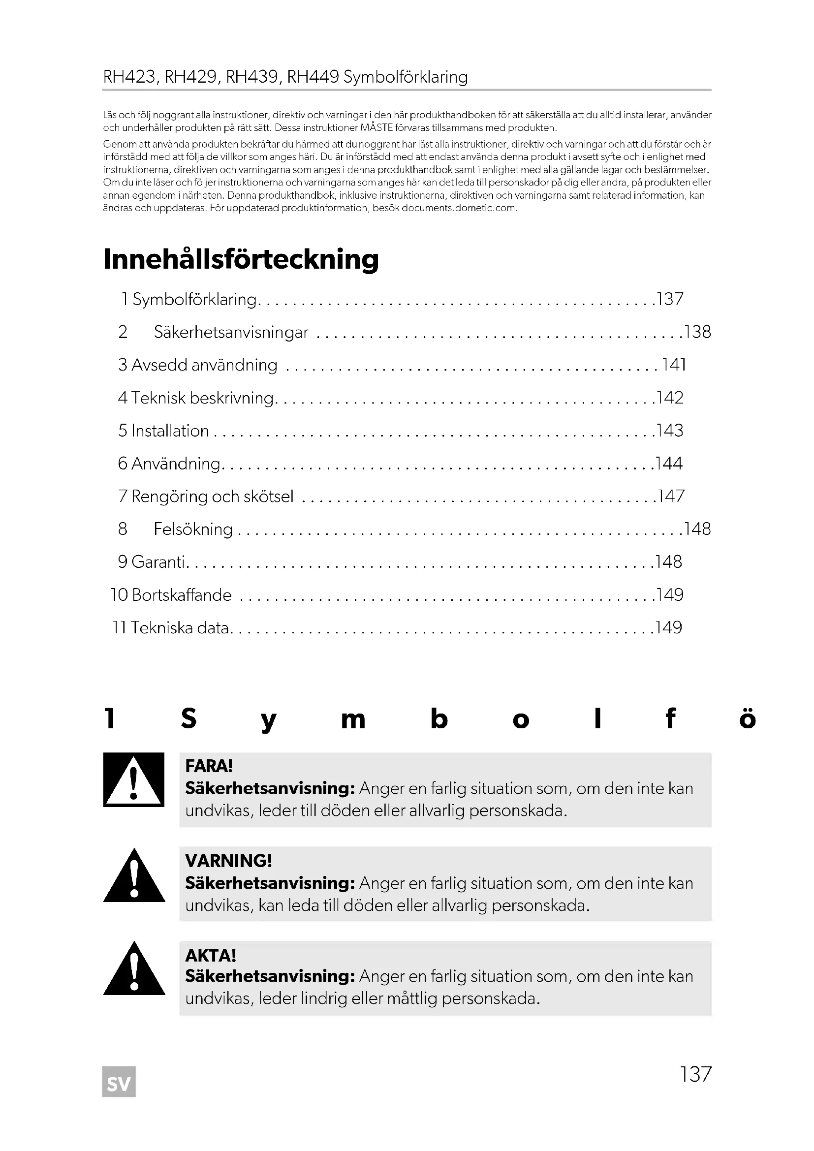 - Läs och följ noggrant alla instruktioner, direktiv och varningar i den här produkthandboken för att säkerställa att du alltid installerar, använder och underhåller produkten på rätt sätt. Dessa instruktioner MÅSTE förvaras tillsammans med produkten. Genom att använda produkten bekräftar du härmed att du noggrant har läst alla instruktioner, direktiv och varningar och att du förstår och är införstådd med att följa de villkor som anges häri. Du är införstådd med att endast använda denna produkt i avsett syfte och i enlighet med instruktionerna, direktiven och varningarna som anges i denna produkthandbok samt i enlighet med alla gällande lagar och bestämmelser. Om du inte läser och följer instruktionerna och varningarna som anges här kan det leda till personskador på dig eller andra, på produkten eller annan egendom i närheten. Denna produkthandbok, inklusive instruktionerna, direktiven och varningarna samt relaterad information, kan ändras och uppdateras. För uppdaterad produktinformation, besök documents.dometic.com. Innehållsförteckning 1 Symbolförklaring p. 137