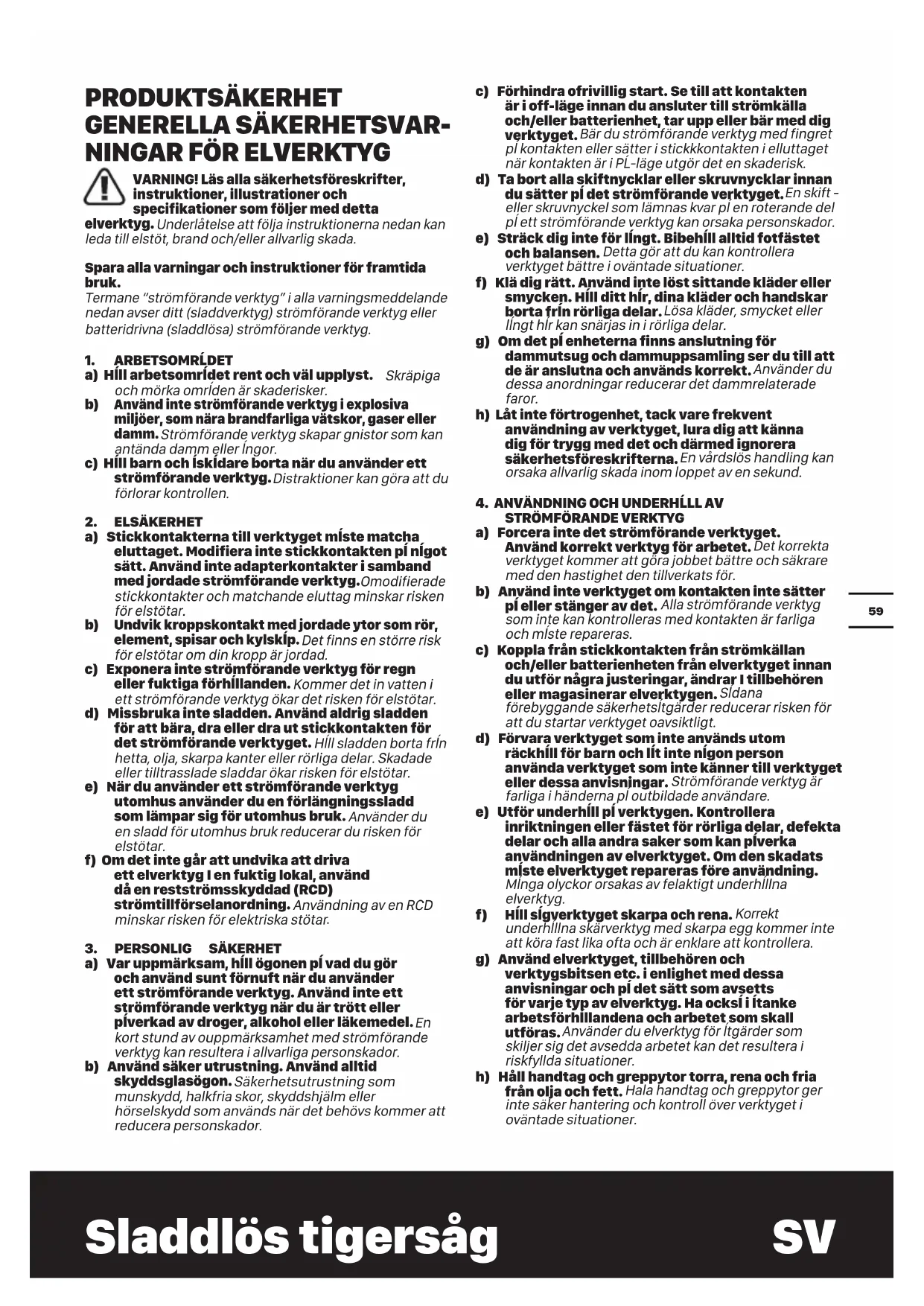 Hĺll sĺgverktyget skarpa och rena. Korrekt underhĺllna skärverktyg med skarpa egg kommer inte att köra fast lika ofta och är enklare att kontrollera. g) Använd elverktyget, tillbehören och verktygsbitsen etc. i enlighet med dessa anvisningar och pĺ det sätt som avsetts för varje typ av elverktyg. Ha ocksĺ i ĺtanke arbetsförhĺllandena och arbetet som skall utföras. Använder du elverktyg för ĺtgärder som skiljer sig det avsedda arbetet kan det resultera i riskfyllda situationer. h) Håll handtag och greppytor torra, rena och fria från olja och fett. Hala handtag och greppytor ger inte säker hantering och kontroll över verktyget i oväntade situationer.Sladdlös tigersåg SV