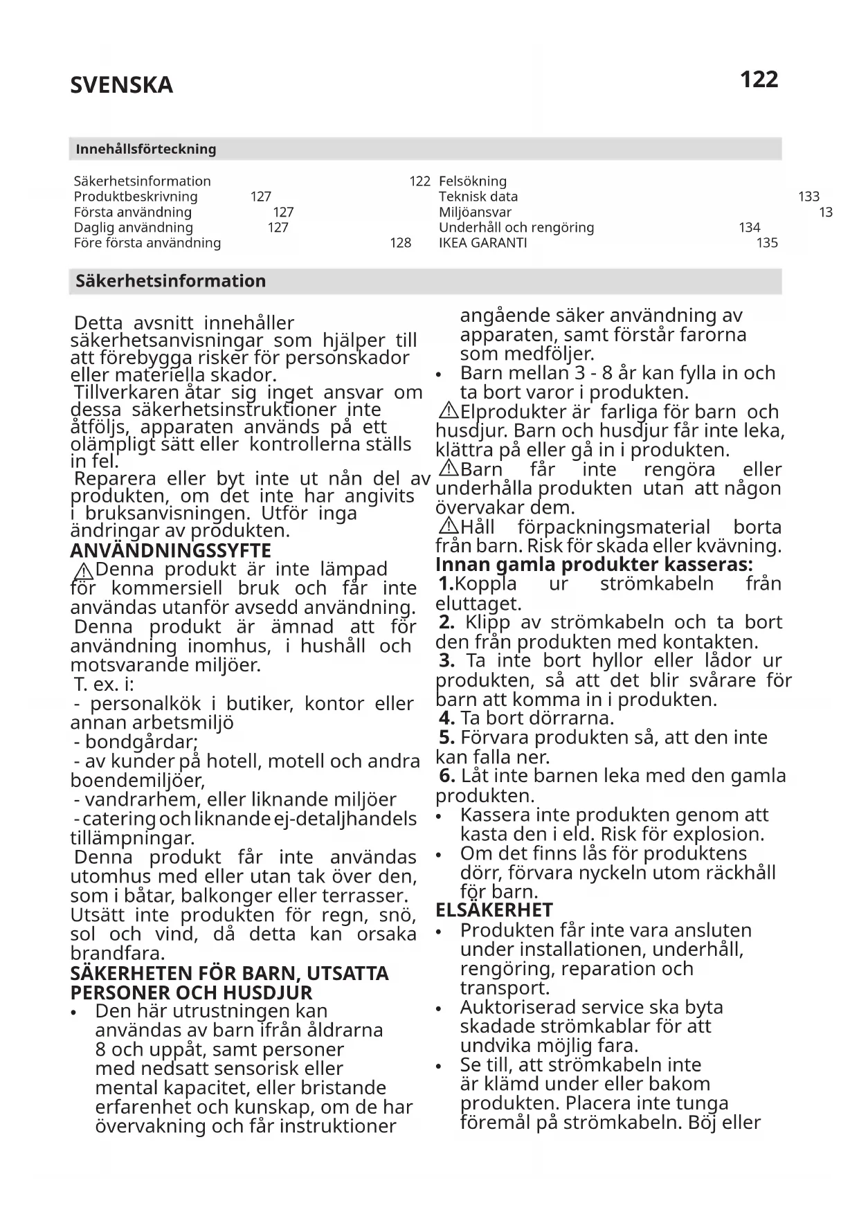 Säkerhetsinformation 122 Produktbeskrivning 127 Första användning 127 Daglig användning 127 Före första användning 128 Innehållsförteckning Felsökning 129 Teknisk data 133 Miljöansvar 133 Underhåll och rengöring 134 IKEA GARANTI 135 Säkerhetsinformation Detta avsnitt innehåller säkerhetsanvisningar som hjälper till att förebygga risker för personskador eller materiella skador. Tillverkaren åtar sig inget ansvar om dessa säkerhetsinstruktioner inte åtföljs, apparaten används på ett olämpligt sätt eller kontrollerna ställs in fel. Reparera eller byt inte ut nån del av produkten, om det inte har angivits i bruksanvisningen. Utför inga ändringar av produkten. ANVÄNDNINGSSYFTE