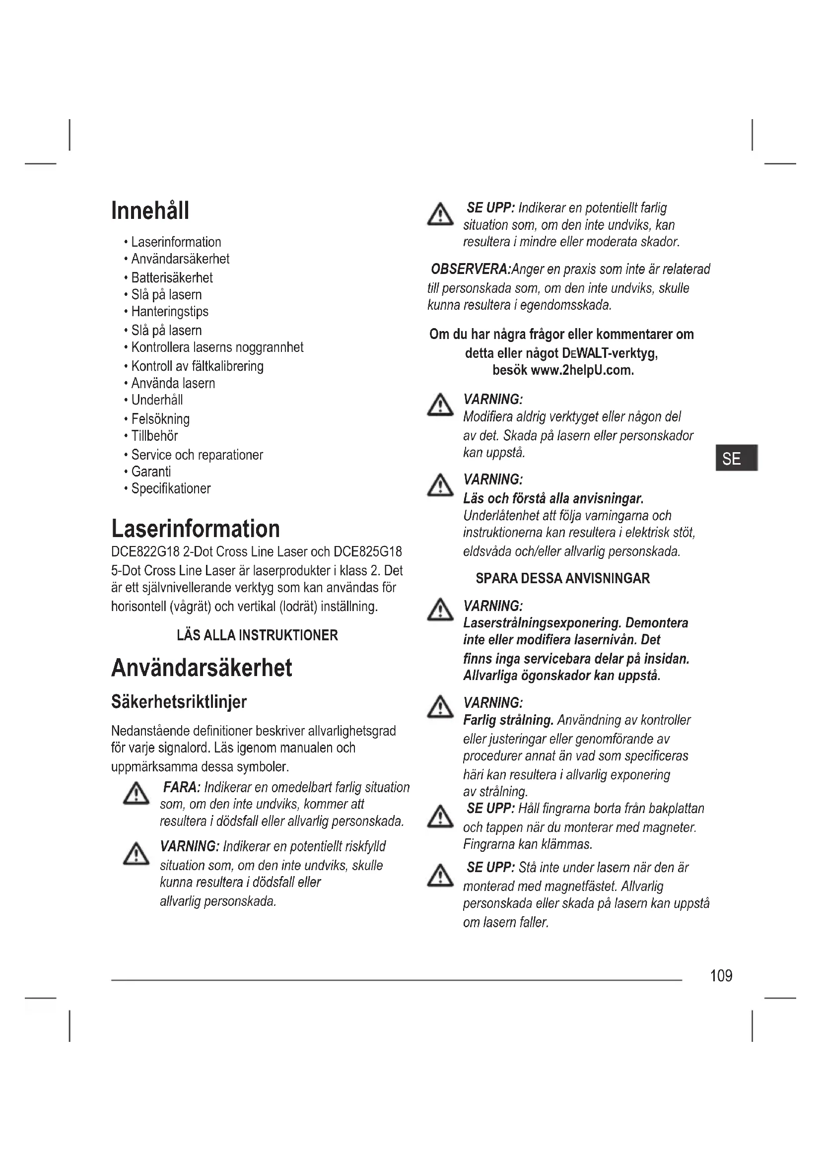 Användarsäkerhet Säkerhetsriktlinjer Nedanstående denitioner beskriver allvarlighetsgrad för varje signalord. Läs igenom manualen och uppmärksamma dessa symboler. FARA: Indikerar en omedelbart farlig situation som, om den inte undviks, kommer att resultera i dödsfall eller allvarlig personskada. VARNING: Indikerar en potentiellt riskfylld situation som, om den inte undviks, skulle kunna resultera i dödsfall eller allvarlig personskada. SE UPP: Indikerar en potentiellt farlig situation som, om den inte undviks, kan resultera i mindre eller moderata skador. OBSERVERA:Anger en praxis som inte är relaterad till personskada som, om den inte undviks, skulle kunna resultera i egendomsskada. Om du har några frågor eller kommentarer om detta eller något DEWALT-verktyg, besök www.2helpU.com. VARNING: Modiera aldrig verktyget eller någon del av det. Skada på lasern eller personskador kan uppstå. VARNING: Läs och förstå alla anvisningar. Underlåtenhet att följa varningarna och instruktionerna kan resultera i elektrisk stöt, eldsvåda och/eller allvarlig personskada.