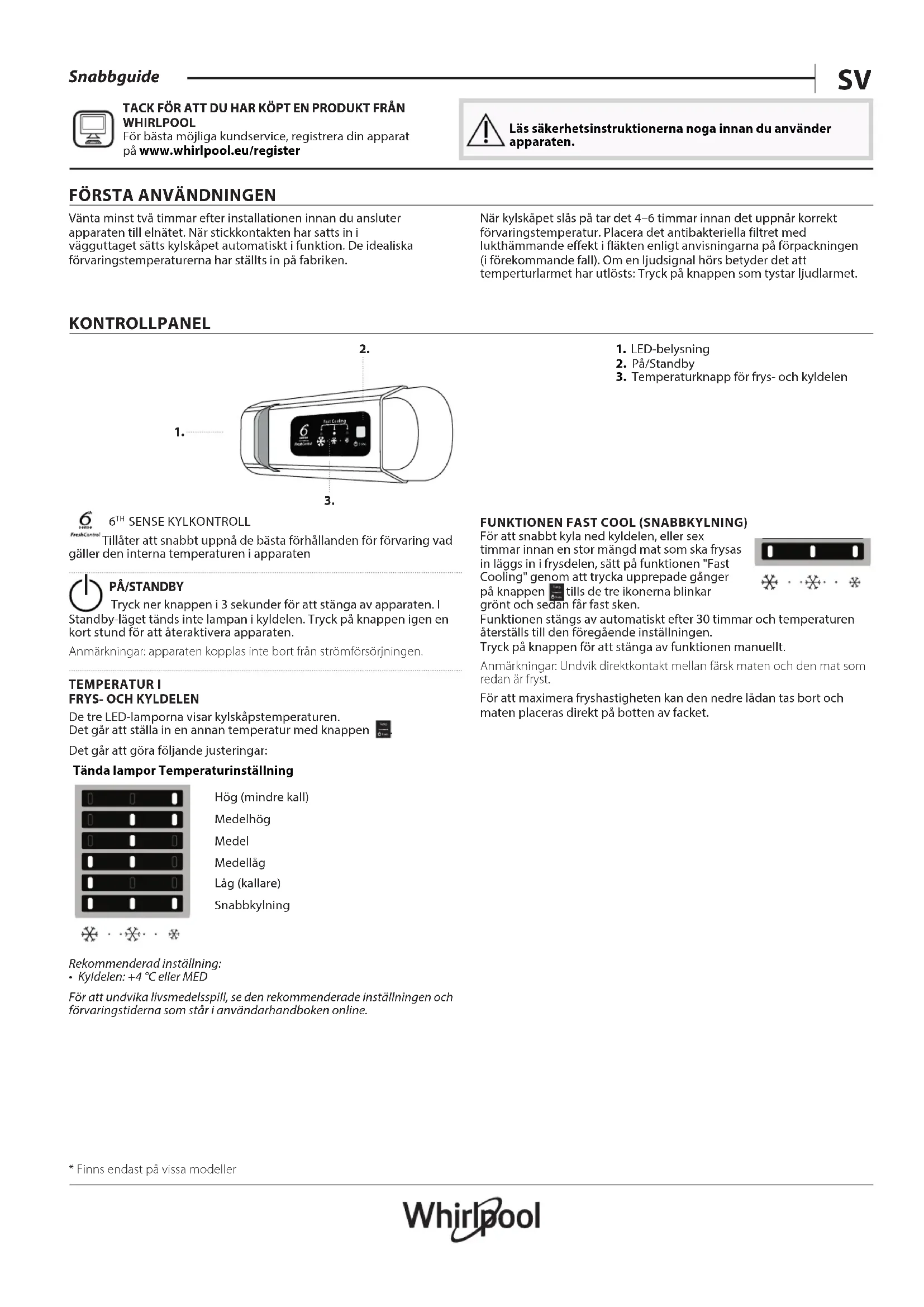 SENSE KYLKONTROLL Tillåter att snabbt uppnå de bästa förhållanden för förvaring vad gäller den interna temperaturen i apparaten PÅ/STANDBY Tryck ner knappen i 3 sekunder för att stänga av apparaten. I Standby-läget tänds inte lampan i kyldelen. Tryck på knappen igen en kort stund för att återaktivera apparaten. Anmärkningar: apparaten kopplas inte bort från strömförsörjningen. TEMPERATUR I