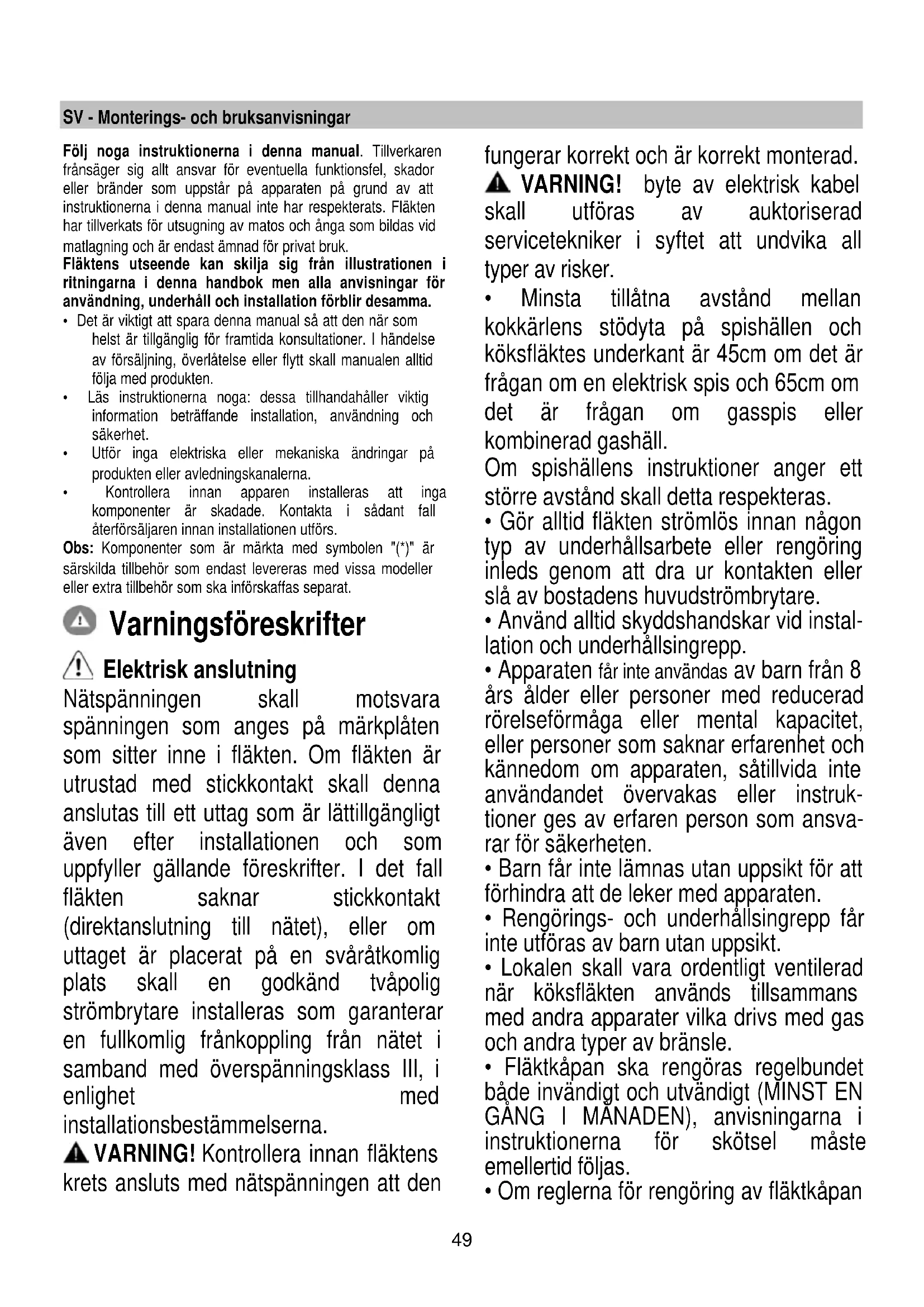 Για την αντικατάσταση τους, απευθυνθείτε στην υπηρεσία τεχνικής βοήθειας49 SV - Monterings- och bruksanvisningar Följ noga instruktionerna i denna manual. Tillverkaren frånsäger sig allt ansvar för eventuella funktionsfel, skador eller bränder som uppstår på apparaten på grund av att instruktionerna i denna manual inte har respekterats. Fläkten har tillverkats för utsugning av matos och ånga som bildas vid matlagning och är endast ämnad för privat bruk. Fläktens utseende kan skilja sig från illustrationen i ritningarna i denna handbok men alla anvisningar för användning, underhåll och installation förblir desamma.
