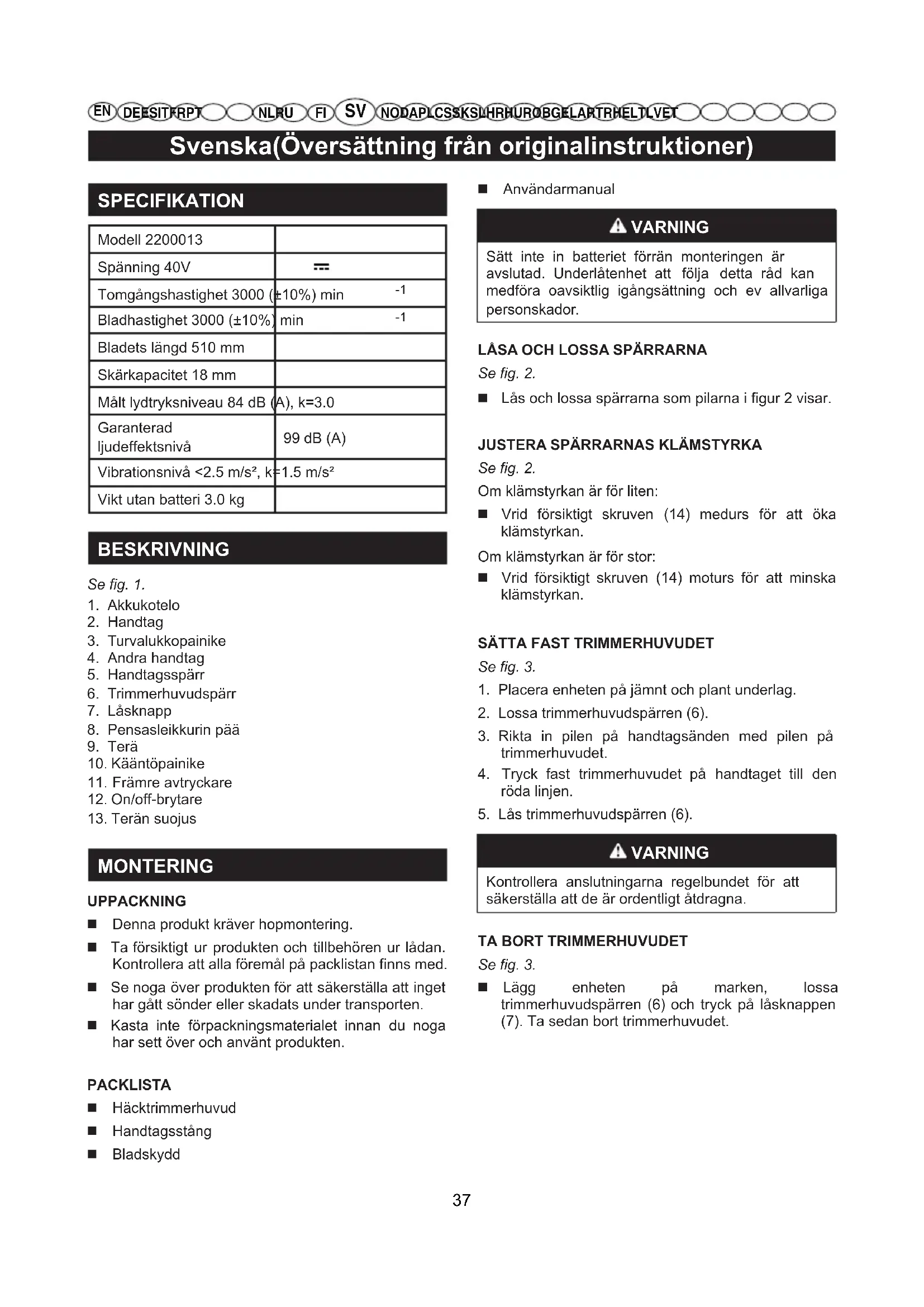 MONTERING UPPACKNING Denna produkt kräver hopmontering. Ta försiktigt ur produkten och tillbehören ur lådan. Kontrollera att alla föremål på packlistan finns med. Se noga över produkten för att säkerställa att inget har gått sönder eller skadats under transporten. Kasta inte förpackningsmaterialet innan du noga har sett över och använt produkten. PACKLISTA Häcktrimmerhuvud Handtagsstång Bladskydd Användarmanual VARNING Sätt inte in batteriet förrän monteringen är avslutad. Underlåtenhet att följa detta råd kan medföra oavsiktlig igångsättning och ev allvarliga personskador.