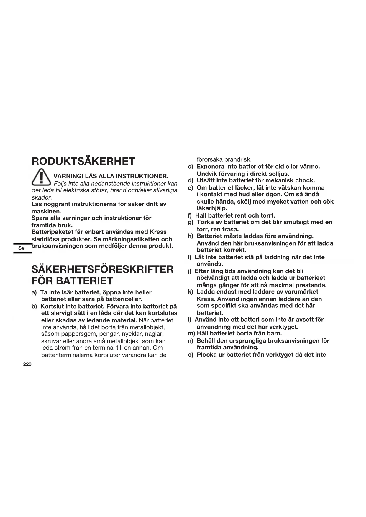 används. j) Efter lång tids användning kan det bli nödvändigt att ladda och ladda ur batterieet många gånger för att nå maximal prestanda. k) Ladda endast med laddare av varumärket Kress. Använd ingen annan laddare än den som specifikt ska användas med det här batteriet. l) Använd inte ett batteri som inte är avsett för användning med det här verktyget. m) Håll batteriet borta från barn. n) Behåll den ursprungliga bruksanvisningen för framtida användning. o) Plocka ur batteriet från verktyget då det inte221