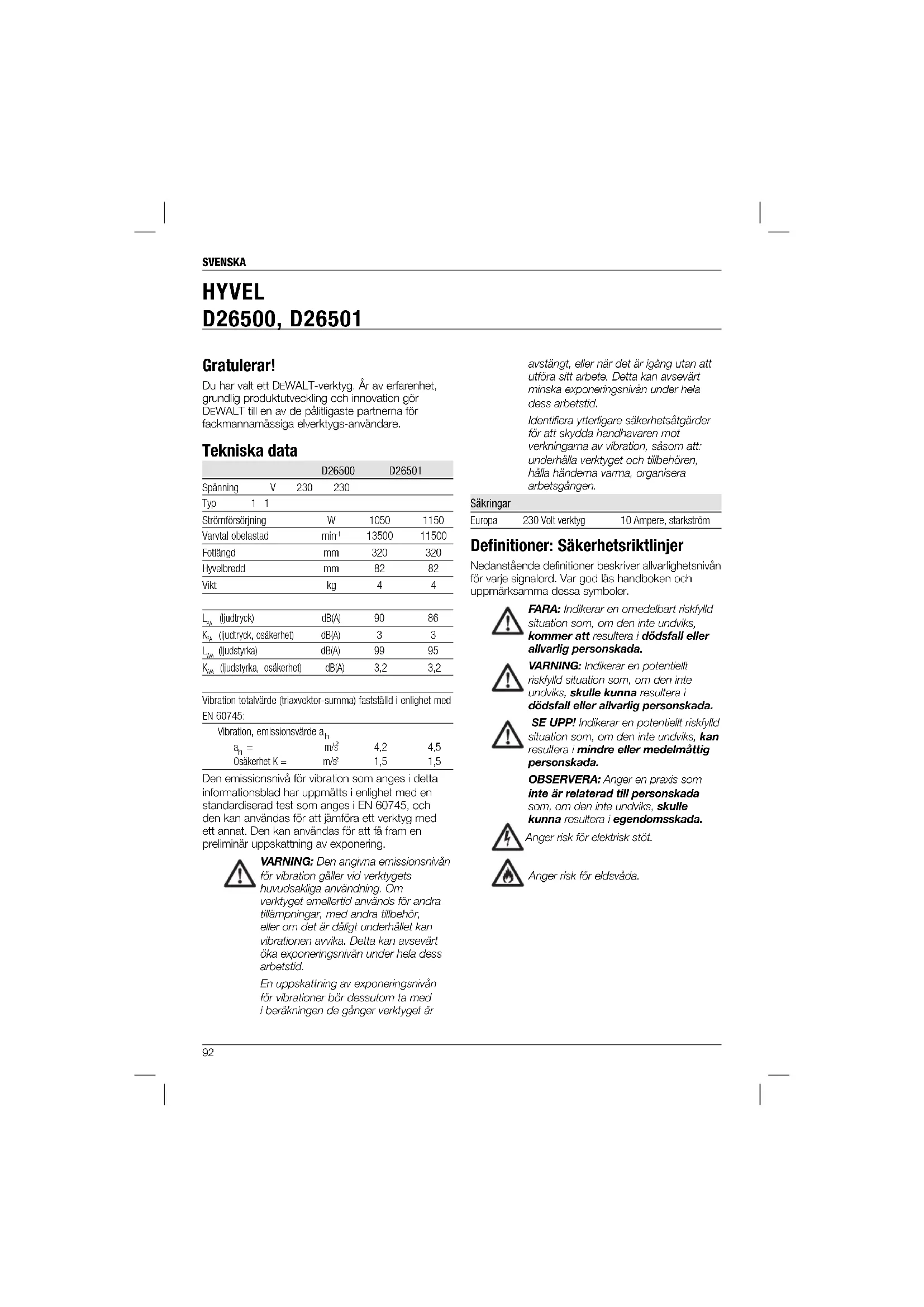 Din D26500/D26501 hyvel är konstruerad för profes- sionell hyvling av trä. ANVÄND INTE under våta förhållanden eller i närheten av lättantändliga vätskor eller gaser. Dessa hyvlar är professionella arbetsverktyg. LÅT INTE barn komma i kontakt med verktyget. Övervakning krävs när oerfarna handhavare använder detta verktyg. Elektrisk Säkerhet Den elektriska motorn har konstruerats för endast en spänning. Kontrollera alltid att strömförsörjningen motsvarar spänningen på klassificeringsplattan. Ditt DEWALT-verktyg är dubbel-isolerad i enlighet med EN 60745; därför behövs ingen jordningstråd. Om starkströmssladden är skadad måste den bytas ut mot en speciellt preparerad sladd som finns att få genom DEWALTs serviceorganisation. Användning av Förlängningssladd Om en förlängningssladd behövs, använd en godkänd 3-kärnig förlängningssladd, som är lämplig för detta verktygs strömbehov (se tekniska data). Minsta ledningsstorlek är 1,5 mm