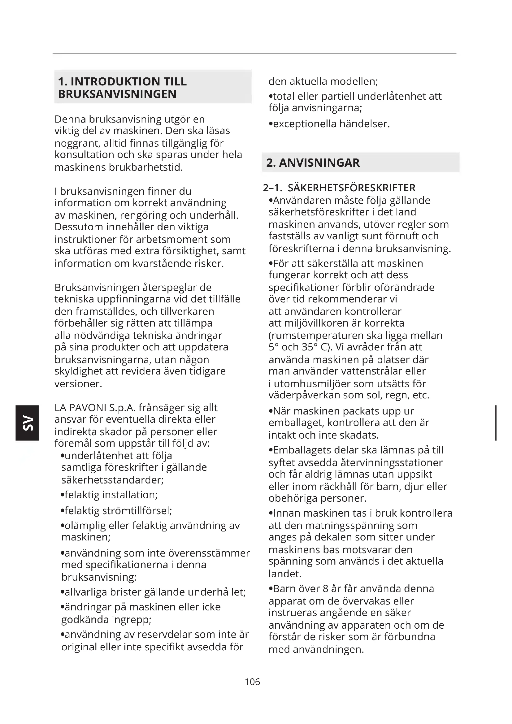 BRUKSANVISNINGEN Denna bruksanvisning utgör en viktig del av maskinen. Den ska läsas noggrant, alltid nnas tillgänglig för konsultation och ska sparas under hela maskinens brukbarhetstid. I bruksanvisningen nner du information om korrekt användning av maskinen, rengöring och underhåll. Dessutom innehåller den viktiga instruktioner för arbetsmoment som ska utföras med extra försiktighet, samt information om kvarstående risker. Bruksanvisningen återspeglar de tekniska uppnningarna vid det tillfälle den framställdes, och tillverkaren förbehåller sig rätten att tillämpa alla nödvändiga tekniska ändringar på sina produkter och att uppdatera bruksanvisningarna, utan någon skyldighet att revidera även tidigare versioner. LA PAVONI S.p.A. frånsäger sig allt ansvar för eventuella direkta eller indirekta skador på personer eller föremål som uppstår till följd av: