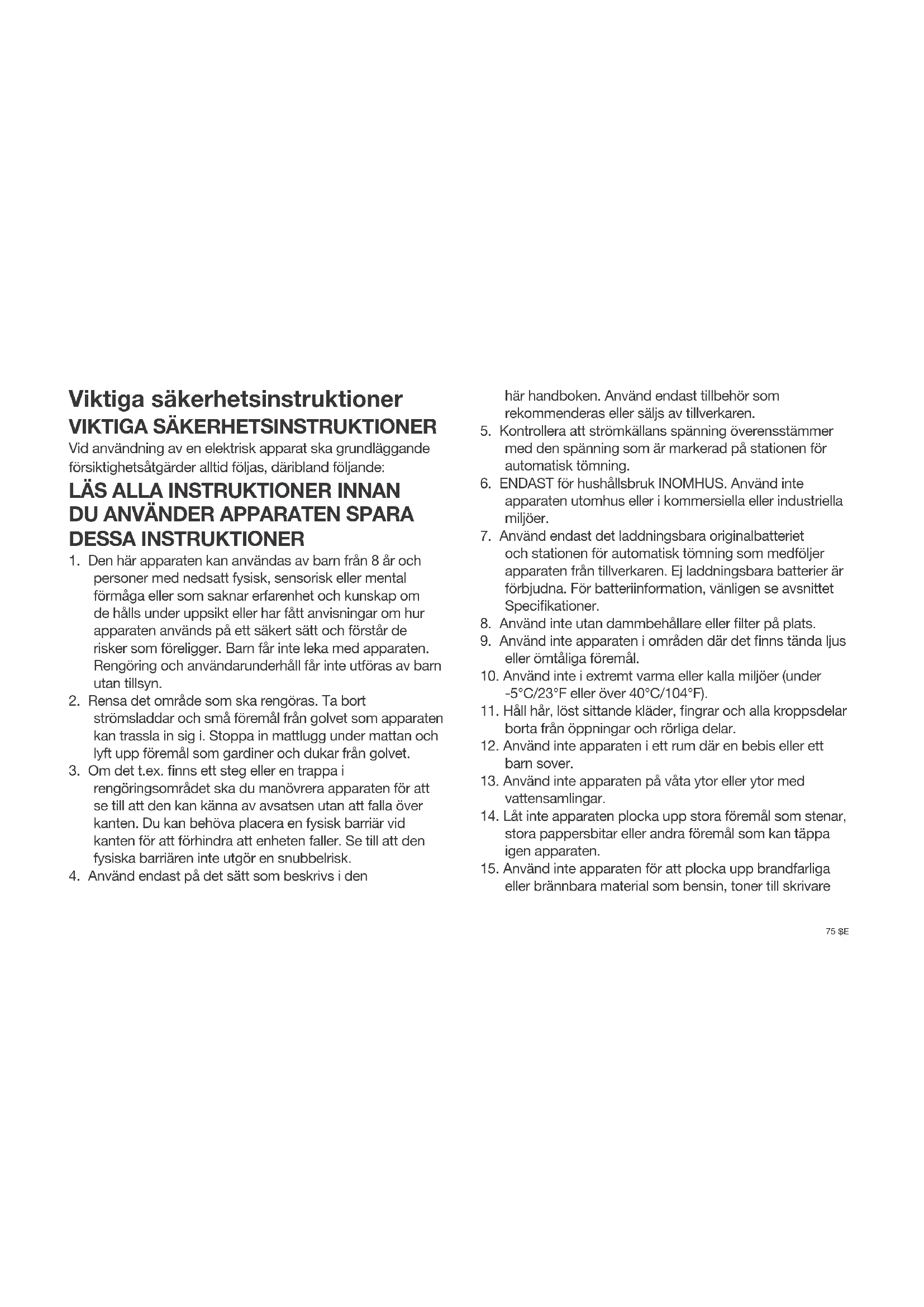 och stationen för automatisk tömning som medföljer apparaten från tillverkaren. Ej laddningsbara batterier är förbjudna. För batteriinformation, vänligen se avsnittet Specikationer.