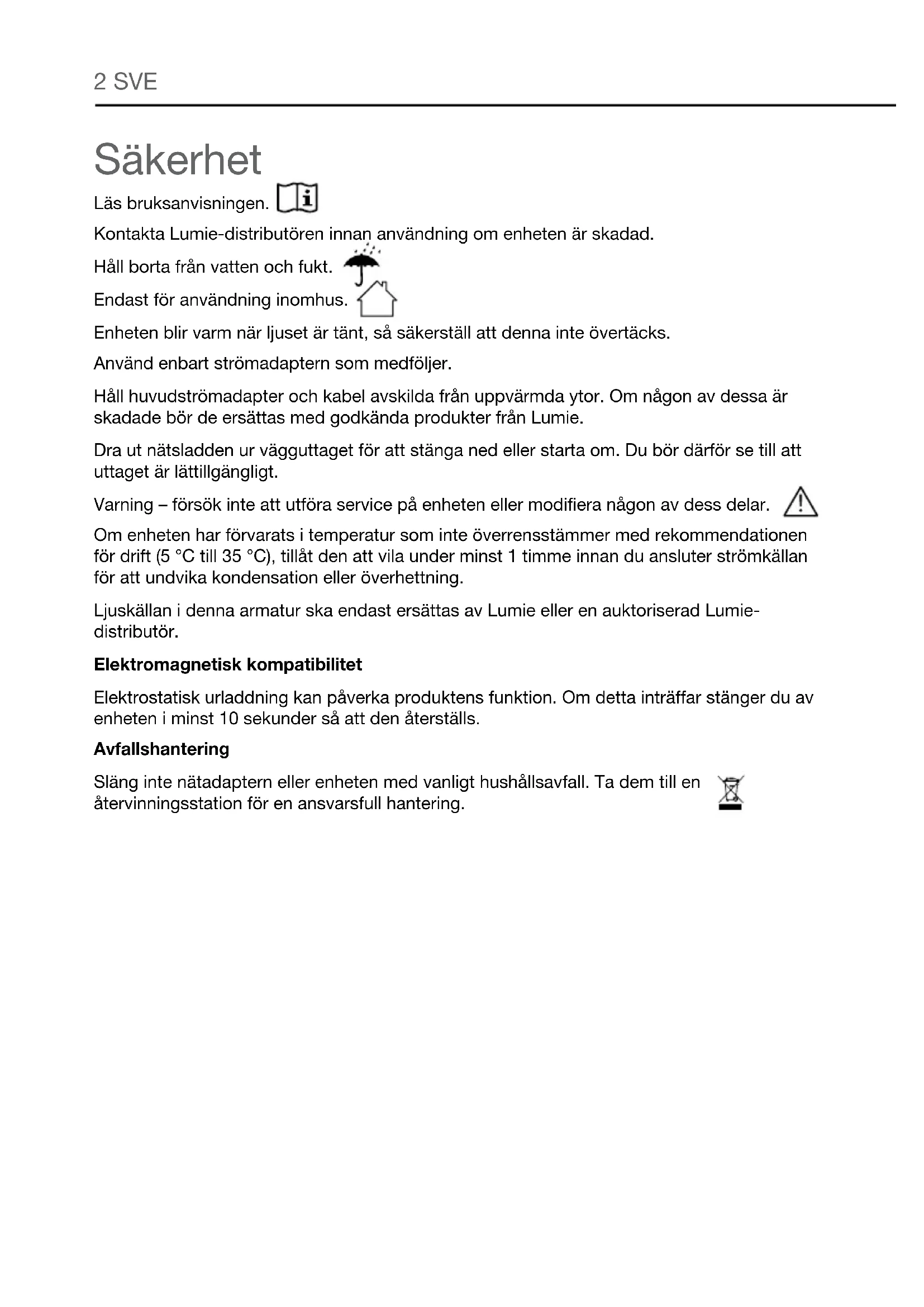 - POL 11 Opis techniczny Może ulec zmianie bez powiadomienia. Lumie Sunrise Alarm Ten produkt zapewnia źródło światła o klasie efektywności energetycznej G. Zdejmowany element: Zasilacz sieciowy (w zestawie) Moc wejściowa: 100–240 Vac, 50/60 Hz, maks.0,5 A; Moc wyjściowa: 5 V ⎓ 1 A (5 W) Warunki pracy: Temperatura: 5°C do 35°C Wilgotność względna: 15% do 93% (bez kondensacji) Ciśnienie atmosferyczne: 70 kPa do 106 kPa Warunki przechowywania/transportu: Temperatura: -25°C do +70°C Wilgotność względna: 15% do 93% (bez kondensacji) Ciśnienie atmosferyczne: 25 kPa do 106 kPa Deklaracja zgodności UE Zgodność z normami obowiązującymi w Wielkiej Brytanii Sprzęt elektryczny klasy III Zasilanie prądem zmiennym (AC)12 POL Kontakt z nami W przypadku sugestii, które mogą pomóc nam w udoskonaleniu naszych produktów lub usług, lub w razie jakichkolwiek problemów i pytań, skontaktuj się z nami, wysyłając wiadomość e-mail pod adres info@lumie.com. Outside In (Cambridge) Limited, 3 The Links, Trafalgar Way, Bar Hill, Cambridge, CB23 8UD, UK. Lumie jest zastrzeżonym znakiem towarowym: Firma Outside In (Cambridge) Limited zarejestrowana w Anglii i Walii. Numer rejestracji: 2647359. Nr VAT: GB 880 9837 71 (UK) NL 826301381B01 (EU)sunrise alarm SVE2 SVE Säkerhet Läs bruksanvisningen. Kontakta Lumie-distributören innan användning om enheten är skadad. Håll borta från vatten och fukt. Endast för användning inomhus. Enheten blir varm när ljuset är tänt, så säkerställ att denna inte övertäcks. Använd enbart strömadaptern som medföljer. Håll huvudströmadapter och kabel avskilda från uppvärmda ytor. Om någon av dessa är skadade bör de ersättas med godkända produkter från Lumie. Dra ut nätsladden ur vägguttaget för att stänga ned eller starta om. Du bör därför se till att uttaget är lättillgängligt. Varning – försök inte att utföra service på enheten eller modifiera någon av dess delar. Om enheten har förvarats i temperatur som inte överrensstämmer med rekommendationen för drift (5 °C till 35 °C), tillåt den att vila under minst 1 timme innan du ansluter strömkällan för att undvika kondensation eller överhettning. Ljuskällan i denna armatur ska endast ersättas av Lumie eller en auktoriserad Lumie- distributör. Elektromagnetisk kompatibilitet Elektrostatisk urladdning kan påverka produktens funktion. Om detta inträffar stänger du av enheten i minst 10 sekunder så att den återställs. Avfallshantering Släng inte nätadaptern eller enheten med vanligt hushållsavfall. Ta dem till en återvinningsstation för en ansvarsfull hantering.SVE 3 Kom igång Den bästa placeringen för din Sunrise Alarm är på ett sängbord i närheten av ett vägguttag. Anslut strömkabeln till uttaget på baksidan av enheten.