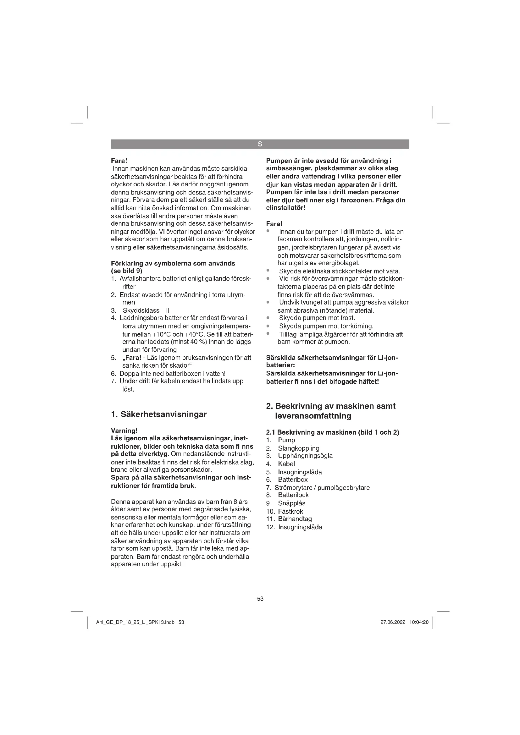 | S e4kerhet | Anv e4nd handskar och skyddsglas f6gon, doppa inte pumpen i vatten |