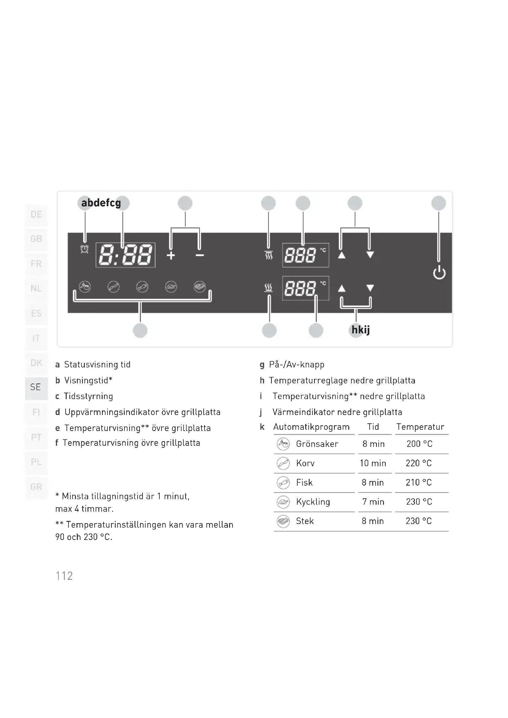 - Minsta tillagningstid är 1 minut, max4timmar. ** Temperaturinställningen kan vara mellan 90 och 230°C. a b d e fc g hk ij g På-/Av-knapp h Temperaturreglage nedre grillplatta i Temperaturvisning** nedre grillplatta j Värmeindikator nedre grillplatta