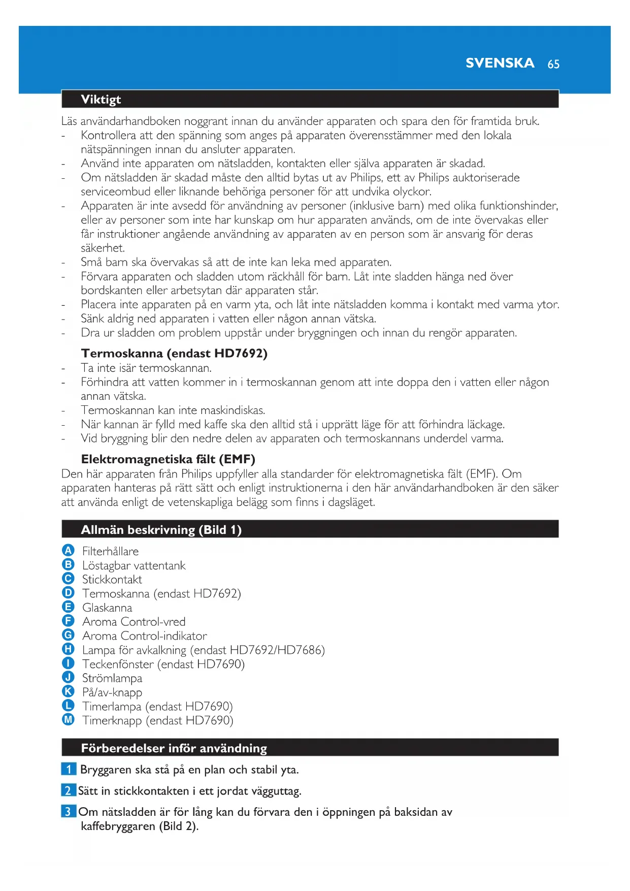 PORTUGUÊS 63Garantia e assistência Se precisar de informações ou se tiver algum problema, visite o site da Philips em www.philips.pt ou contacte o Centro de Atendimento ao Cliente Philips do seu país (encontrará o número de telefone no folheto da garantia mundial). Se não existir um Centro de Atendimento ao Cliente no seu país, dirija-se ao distribuidor Philips local ou contacte o Departamento de Assistência da Philips Domestic Appliances and Personal Care BV. PORTUGUÊS6465 Viktigt Läs användarhandboken noggrant innan du använder apparaten och spara den för framtida bruk. Kontrollera att den spänning som anges på apparaten överensstämmer med den lokala nätspänningen innan du ansluter apparaten. Använd inte apparaten om nätsladden, kontakten eller själva apparaten är skadad. Om nätsladden är skadad måste den alltid bytas ut av Philips, ett av Philips auktoriserade serviceombud eller liknande behöriga personer för att undvika olyckor. Apparaten är inte avsedd för användning av personer (inklusive barn) med olika funktionshinder, eller av personer som inte har kunskap om hur apparaten används, om de inte övervakas eller får instruktioner angående användning av apparaten av en person som är ansvarig för deras säkerhet. Små barn ska övervakas så att de inte kan leka med apparaten. Förvara apparaten och sladden utom räckhåll för barn. Låt inte sladden hänga ned över bordskanten eller arbetsytan där apparaten står. Placera inte apparaten på en varm yta, och låt inte nätsladden komma i kontakt med varma ytor. Sänk aldrig ned apparaten i vatten eller någon annan vätska. Dra ur sladden om problem uppstår under bryggningen och innan du rengör apparaten.