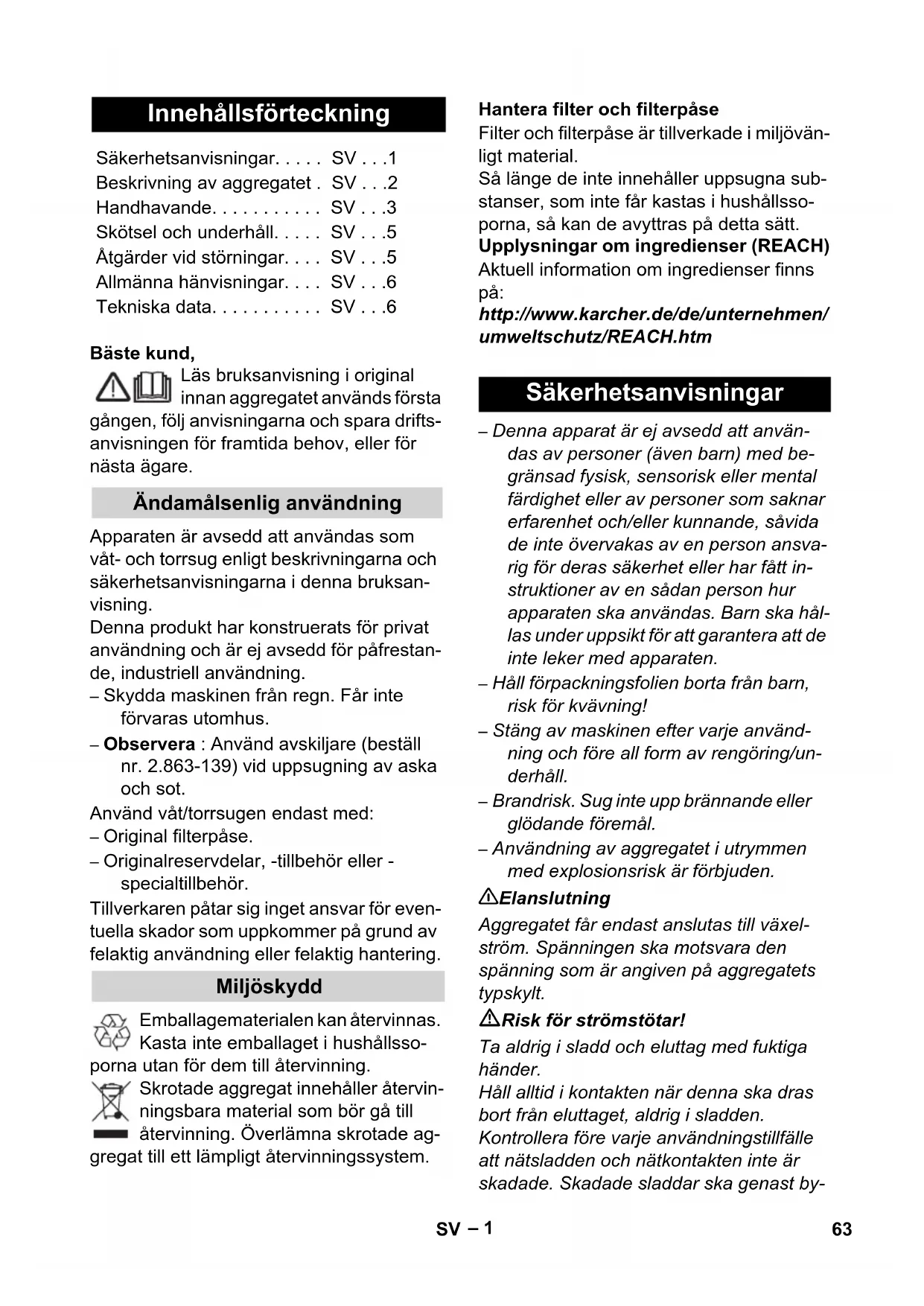 - Feilretting Innrulling av strømkabel fungerer ikke Det kommer ut vann Avtagende sugeeffekt J 1 61NO– 6 De garantibestemmelser som er utgitt av vår distribusjonsavdeling, gjelder i alle land. Eventuelle feil på maskinen blir repa- rert gratis i garantitiden, dersom disse kan føres tilbake til material- eller produksjons- feil. Ved behov for garantireparasjoner henvender du deg til din forhandler eller nærmeste autoriserte serviceforhandler. (Se adresse på baksiden) Våre KÄRCHER-avdelinger hjelper deg gjerne ved feil eller om du har spørsmål. (Se adresse på baksiden) Et utvalg av de vanligste reservedelene fin- ner du bak i denne bruksanvisningen. Reservedeler og tilbehør får du hos din for- handler eller ved en KÄRCHER-avdeling. (Se adresse på baksiden) De tekniske data finner du på utfoldet klaff. Under finner du forklaring på symbolene brukt der. Det tas forbehold om tekniske endrin- ger! Generelle merknader Garanti Kundetjeneste Bestilling av reservedeler og spesi- altilbehør Tekniske data Spenning Effekt P nominell Effekt P maks Maks. tilkoblingseffekt for appa- rat-stikkontakten Strømsikring (trege) Beholder, volum Vannopptak med håndtak Vannopptak med gulvdyse Nettledning Lydtrykksnivå (EN 60704-2-1) Vekt (uten tilbehør) 62 NO– 1 Bäste kund, Läs bruksanvisning i original innan aggregatet används första gången, följ anvisningarna och spara drifts- anvisningen för framtida behov, eller för nästa ägare. Apparaten är avsedd att användas som våt- och torrsug enligt beskrivningarna och säkerhetsanvisningarna i denna bruksan- visning. Denna produkt har konstruerats för privat användning och är ej avsedd för påfrestan- de, industriell användning. – Skydda maskinen från regn. Får inte förvaras utomhus. – Observera : Använd avskiljare (beställ nr. 2.863-139) vid uppsugning av aska och sot. Använd våt/torrsugen endast med: – Original filterpåse. – Originalreservdelar, -tillbehör eller - specialtillbehör. Tillverkaren påtar sig inget ansvar för even- tuella skador som uppkommer på grund av felaktig användning eller felaktig hantering. Emballagematerialen kan återvinnas. Kasta inte emballaget i hushållsso- porna utan för dem till återvinning. Skrotade aggregat innehåller återvin- ningsbara material som bör gå till återvinning. Överlämna skrotade ag- gregat till ett lämpligt återvinningssystem. Filter och filterpåse är tillverkade i miljövän- ligt material. Så länge de inte innehåller uppsugna sub- stanser, som inte får kastas i hushållsso- porna, så kan de avyttras på detta sätt. Upplysningar om ingredienser (REACH) Aktuell information om ingredienser finns på: http://www.karcher.de/de/unternehmen/ umweltschutz/REACH.htm – Denna apparat är ej avsedd att använ- das av personer (även barn) med be- gränsad fysisk, sensorisk eller mental färdighet eller av personer som saknar erfarenhet och/eller kunnande, såvida de inte övervakas av en person ansva- rig för deras säkerhet eller har fått in- struktioner av en sådan person hur apparaten ska användas. Barn ska hål- las under uppsikt för att garantera att de inte leker med apparaten. – Håll förpackningsfolien borta från barn, risk för kvävning! – Stäng av maskinen efter varje använd- ning och före all form av rengöring/un- derhåll. – Brandrisk. Sug inte upp brännande eller glödande föremål. – Användning av aggregatet i utrymmen med explosionsrisk är förbjuden. 몇 Elanslutning Aggregatet får endast anslutas till växel- ström. Spänningen ska motsvara den spänning som är angiven på aggregatets typskylt. Risk för strömstötar! Ta aldrig i sladd och eluttag med fuktiga händer. Håll alltid i kontakten när denna ska dras bort från eluttaget, aldrig i sladden. Kontrollera före varje användningstillfälle att nätsladden och nätkontakten inte är skadade. Skadade sladdar ska genast by- Innehållsförteckning Säkerhetsanvisningar