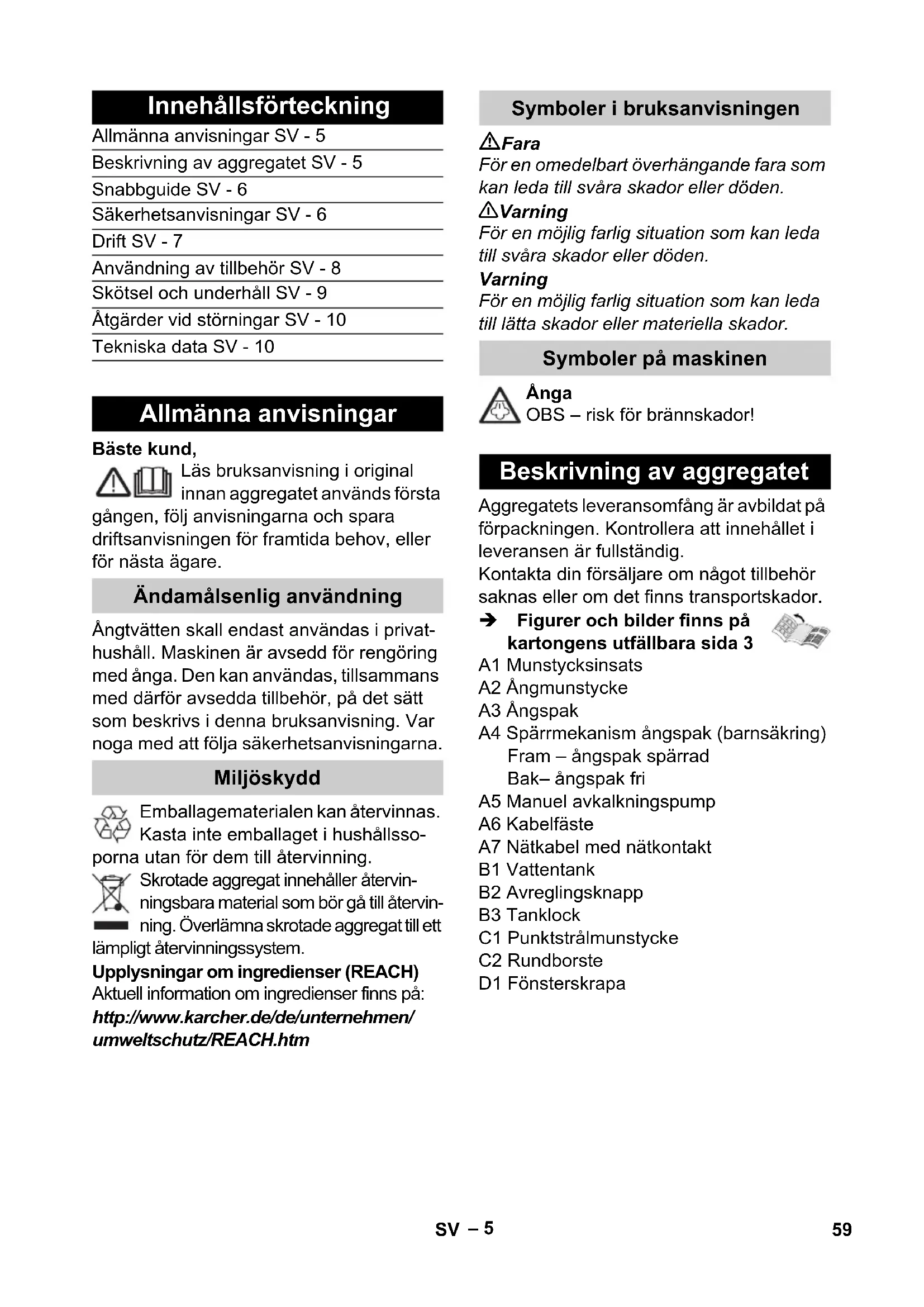 Beskyttelsesklasse I Beskyttelsesklasse IPX4 Effektspesifikasjoner Varmeeffekt 1600 W Mål Vanntank 0,25 l Vekt (uten tilbehør) 1,2 kg Bredde 190 mm Lengde 100 mm Høyde 280 mm Tilleggsutstyr Bestillingsnummer Rundbørstesett 2.863-058 4 rundbørster for punktstråledyse Rundbørstesett med børste- hår av messing 2.863-061 for fjerning av hardnakket smuss. Perfekt for robuste overflater. Rundbørste med skraper 2.863-140 Rundbørste med to rekker varmebestandige børster og en skraper. Ikke egnet for ømfintli- ge flater. Avkalker-sticks 6.295-047 58 NO– 5 Bäste kund, Läs bruksanvisning i original innan aggregatet används första gången, följ anvisningarna och spara driftsanvisningen för framtida behov, eller för nästa ägare. Ångtvätten skall endast användas i privat- hushåll. Maskinen är avsedd för rengöring med ånga. Den kan användas, tillsammans med därför avsedda tillbehör, på det sätt som beskrivs i denna bruksanvisning. Var noga med att följa säkerhetsanvisningarna. Emballagematerialen kan återvinnas. Kasta inte emballaget i hushållsso- porna utan för dem till återvinning. Skrotade aggregat innehåller återvin- ningsbara material som bör gå till återvin- ning. Överlämna skrotade aggregat till ett lämpligt återvinningssystem. Upplysningar om ingredienser (REACH) Aktuell information om ingredienser finns på: http://www.karcher.de/de/unternehmen/ umweltschutz/REACH.htm Fara För en omedelbart överhängande fara som kan leda till svåra skador eller döden. 몇 Varning För en möjlig farlig situation som kan leda till svåra skador eller döden. Varning För en möjlig farlig situation som kan leda till lätta skador eller materiella skador. Ånga OBS – risk för brännskador! Aggregatets leveransomfång är avbildat på förpackningen. Kontrollera att innehållet i leveransen är fullständig. Kontakta din försäljare om något tillbehör saknas eller om det finns transportskador. Î Figurer och bilder finns på kartongens utfällbara sida 3 Innehållsförteckning Allmänna anvisningar SV - 5 Beskrivning av aggregatet SV - 5 Snabbguide SV - 6 Säkerhetsanvisningar SV - 6 Drift SV - 7 Användning av tillbehör SV - 8 Skötsel och underhåll SV - 9 Åtgärder vid störningar SV - 10 Tekniska data SV - 10 Allmänna anvisningar Ändamålsenlig användning Miljöskydd Symboler i bruksanvisningen Symboler på maskinen Beskrivning av aggregatet A1 Munstycksinsats A2 Ångmunstycke A3 Ångspak A4 Spärrmekanism ångspak (barnsäkring) Fram – ångspak spärrad Bak– ångspak fri A5 Manuel avkalkningspump A6 Kabelfäste A7 Nätkabel med nätkontakt B1 Vattentank B2 Avreglingsknapp B3 Tanklock C1 Punktstrålmunstycke C2 Rundborste D1 Fönsterskrapa 59SV– 6 Î Figurer och bilder finns på kartongens utfällbara sida 4 1 Avlägsna vattentanken. 2 Ta bort tanklock. 3 Fyll på vattentanken, stäng tanklocket. 4 Sätt fast vattentanken. 5 Stick i nätkontakten. Ångtvättaggregatet är klart att använ- das efter cirka 15 sekunder. 6 Skjut låsningen bakåt, tryck ned ång- reglaget. Fara Användning av aggregatet i utrymmen med explosionsrisk är förbjuden. Om apparaten ska användas inom risk- områden måste respektive säkerhets- föreskrifter beaktas. Använd inte apparaten i bassänger där det finns vatten. Apparaten får inte användas till rengö- ring av elektriska apparater, t.ex. bak- ugn, spiskåpa, mikrougn, TV apparat, lampa, fön, elektriskt element etc. Kontrollera att apparaten och dess till- behör är i bra skick före användning. Om det finns brister får apparaten inte användas. Var speciellt uppmärksam på nätsladd, säkerhetsklaff och ångs- lang. Skadad nätsladd ska genast bytas ut av auktoriserad kundservice/utbildad elek- triker. Byt genast ut skadad ångslang. Endast ångslang som rekommenderas av till- verkaren får användas (beställnings- nummer, se reservdelslistan). Ta aldrig i nätkabeln och nätuttaget med fuktiga händer. Använd inte ångan på föremål som innehåller hälsovådliga ämnen (t.ex. asbest). Rör aldrig vid ångstrålen med handen på kort avstånd, och rikta den inte heller mot människor eller djur (risk för skåll- ning). 몇 Varning Aggregatet får endast anslutas till ett nätuttag som installerats av en elektri- ker enligt IEC 60364. Aggregatet får endast anslutas till väx- elström. Spänningen ska motsvara den spänning som är angiven på aggrega- tets typskylt. I fuktiga utrymmen, ex. badrum, ska ap- paraten bara anslutas till eluttag som är kopplade till jordfelsbrytare. Olämpliga förlängningssladdar kan vara farliga. Använd endast stänkvat- tenskyddade förlängningssladdar, med ett tvärsnitt på minst 3x1 mm². När nätkontakt och förlängningssladd sätts ihop får anslutningen inte ligga i vatten. När anslutningar på nät- eller förläng- ningssladd byts ut måste stänkvatten- skyddet och den mekaniska fastheten garanteras. Användaren ska använda aggregatet i enlighet med gällande bestämmelser. Användaren ska ta hänsyn till lokala för- utsättningar och kontrollera att ingen uppehåller sig i närheten vid arbete med aggregatet. Denna apparat är ej avsedd att använ- das av personer (även barn) med be- gränsad fysisk, sensorisk eller mental färdighet eller av personer som saknar erfarenhet och/eller kunnande, såvida de inte övervakas av en person ansva- rig för deras säkerhet eller har fått in- struktioner av en sådan person hur apparaten ska användas. Barn ska hål- las under uppsikt för att garantera att de inte leker med apparaten. Lämna aldrig aggregatet utan uppsikt så länge det är i drift. Var försiktig vid rengöring av kaklade väggar med eluttag. Varning Beakta att nät- och förlängningskabeln inte skadas av överkörning, klämning, sönderdragning eller liknande. Skydda nätkabeln från värme, olja och vassa kanter. Snabbguide Säkerhetsanvisningar 60 SV– 7 Häll aldrig lösningsmedel, vätskor som innehåller lösningsm