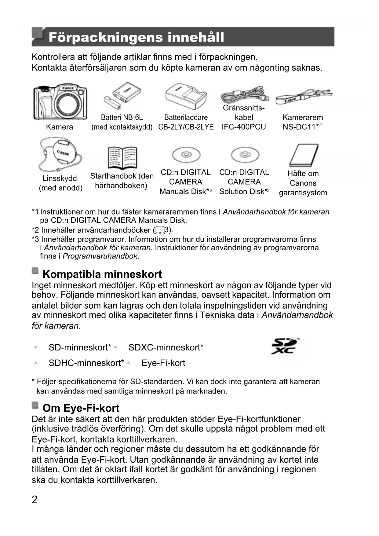 Häfte om Canons garantisystem *1 Instruktioner om hur du fäster kameraremmen nns i Användarhandbok för kameran på CD:n DIGITAL CAMERA Manuals Disk. *2 Innehåller användarhandböcker (= 3). *3 Innehåller programvaror. Information om hur du installerar programvarorna nns i Användarhandbok för kameran. Instruktioner för användning av programvarorna nns i Programvaruhandbok. Kompatibla minneskort Inget minneskort medföljer. Köp ett minneskort av någon av följande typer vid behov. Följande minneskort kan användas, oavsett kapacitet. Information om antalet bilder som kan lagras och den totala inspelningstiden vid användning av minneskort med olika kapaciteter nns i Tekniska data i Användarhandbok för kameran.