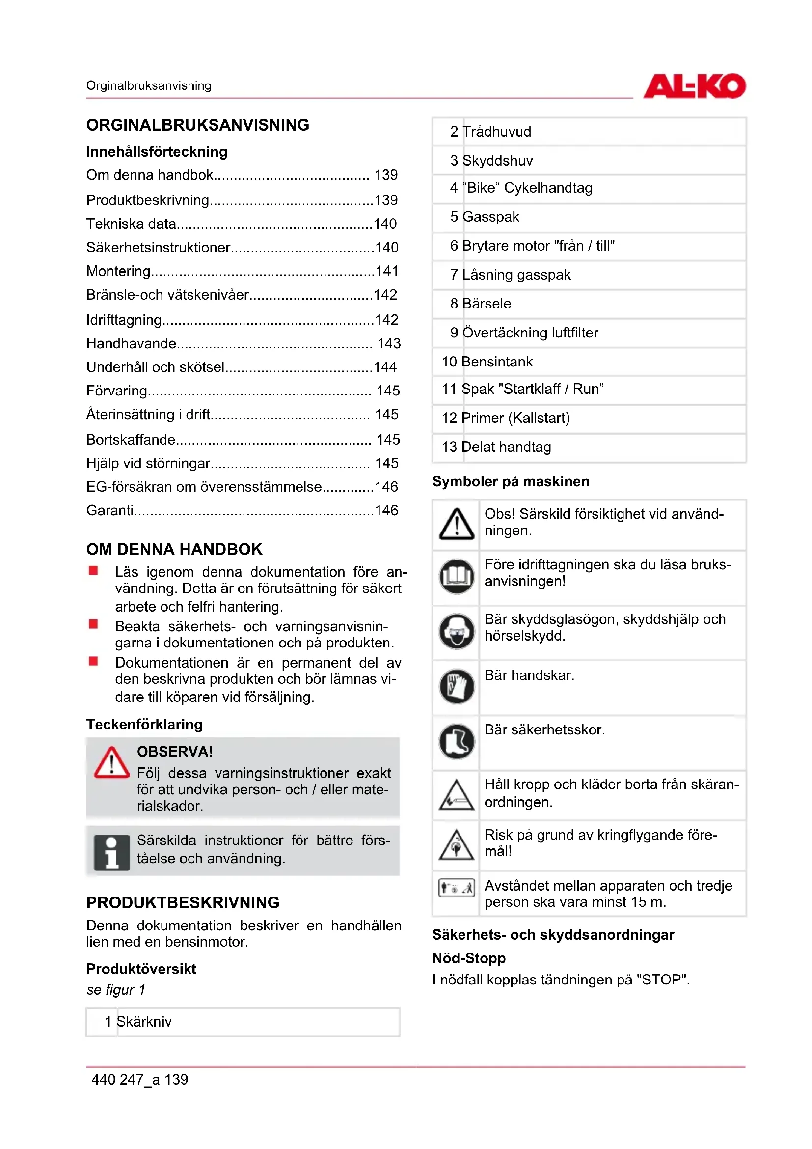 - Härmed försäkrar vi att denna produkt, i det utförande den tillverkats i, motsvarar de harmoniserade kraven för EU-direktiv, EU-säkerhetsstandarder och de produktspecifika standarderna. Produkt Tillverkare Företrädare röjsåg Typ BC 4535 II AL-KO Geräte GmbH Ichenhauser Str. 14 D-89359 Kötz Anton Eberle Ichenhauser Str. 14 D-89359 Kötz Seriennummer EU-direktiv Harmoniserade normer G 230 2305 Kötz, 01.06.2012 2006/42/EG 2004/108/EG 2000/14/EG (13) 2002/88/EG ISO 11806:2009-01 ISO 14982:1998-09 Antonio De Filippo Managing Director Ljudeffektnivå uppmätt: 109 dB(A) garanterad: 113 dB(A) Överensstämmelsevärdering 2000 /14/EG bilaga V GARANTI Eventuella material- eller tillverkningsfel åtgärdas av oss under den lagstadgade garantitiden genom reparation eller ersättningsprodukt, efter vårt gottfinnande. Garantitiden bestäms av gällande lag i det land där produkten köptes. Vår garantiförsäkran gäller enbart om: den här bruksanvisningen beaktas produkten hanteras fackmässigt originalreservdelar används Garantin upphör att gälla vid: egenmäktiga reparationsförsök egenmäktiga tekniska förändringar icke avsedd användning Garantin gäller inte för: lackskador som beror på normal användning slitdelar som är märkta med en ram [xxx xxx (x)] på reservdelskortet förbränningsmotorer (här gäller respektive motortillverkares garantibestämmelser) Garantitiden inleds i och med den första slutkundens köp av produkten. Datum på inköpsbeviset gäller. Kontakta återförsäljaren eller närmaste auktoriserade serviceställe under uppvisande av denna förklaring och inköpsbeviset i original. Köparens lagstadgade anspråk gentemot försäljaren berörs inte av denna förklaring.Original bruksanvisning 440 247_a 147 ORIGINAL BRUKSANVISNING Innhold Om denne håndboken p. 147