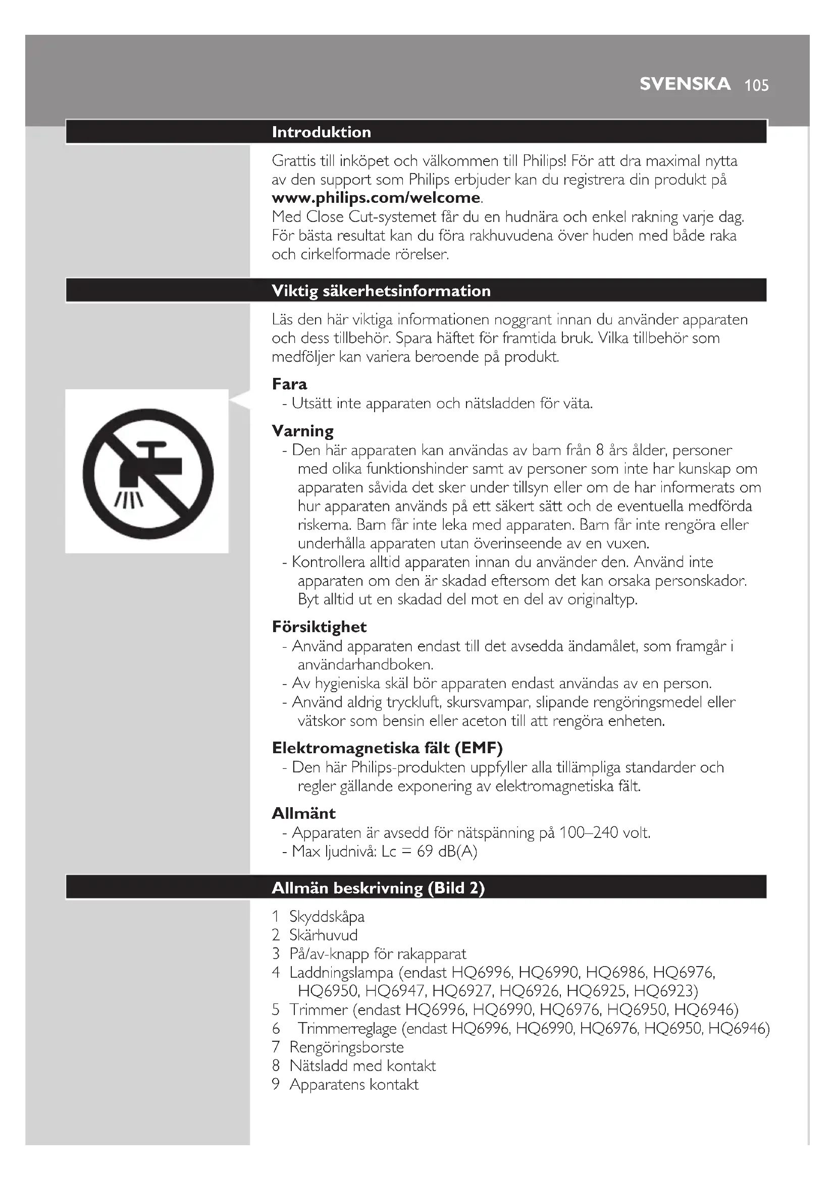 SVENSKA 111Återvinning - Den här symbolen innebär att produkten omfattas av EU-direktivet 2012/19/EU. - Den här symbolen innebär att produkten innehåller ett inbyggt laddningsbart batteri som omfattas av EU-direktivet 2006/66/EG och inte får slängas bland hushållssoporna. Vi rekommenderar att du lämnar in produkten till en ofciell återvinningsstation eller ett Philips-serviceombud så att en yrkesperson kan ta ut det laddningsbara batteriet. - Hitta närmaste återvinningsstation för elektriska och elektroniska produkter och laddningsbara batterier. Följ de lokala bestämmelserna och släng aldrig produkten eller de laddningsbara batterierna bland normalt hushållsavfall. Korrekt kassering av gamla produkter och laddningsbara batterier bidrar till att förhindra negativ påverkan på miljö och hälsa. Ta ut det laddningsbara batteriet Ta endast ur det laddningsbara batteriet när du ska slänga rakapparaten. Se till att batteriet är helt urladdat när du tar ur det. 1 Stäng av rakapparaten. Dra ut stickkontakten ur vägguttaget och sladdkontakten ur rakapparaten. 2 Låt rakapparaten gå tills motorn stannar. 3 Lossa skruvarna på rakapparatens baksida och öppna den. 4 Skär av batteriskenorna med en kniv och dra loss batteriet från den limmade remsan. Batteriskenorna i metall är mycket vassa. Anslut inte rakapparaten till elnätet när du har tagit ur batteriet. Garanti och support Om du behöver information eller support kan du gå till www.philips.com/ support eller läsa garantibroschyren. Garantibegränsningar Rakhuvudena (knivar och skydd) omfattas inte av de internationella garantivillkoren eftersom de utsätts för slitage. SVENSKA112Felsökning I det här kapitlet sammanfattas de vanligaste problemen som kan uppstå med apparaten. Om du inte kan lösa problemet med hjälp av informationen nedan kan du gå till www.philips.com/support och läsa svaren på vanliga frågor. Du kan även kontakta kundtjänst i ditt land. Problem Möjlig orsak Lösning Försämrat rakningsresultat. Rakhuvudena är smutsiga. Du har inte rengjort rakapparaten ordentligt eller så har du inte rengjort den på länge. Rengör rakapparaten ordentligt innan du fortsätter rakningen. Läs mer i kapitlet Rengöring och underhåll. Långa hårstrån sitter fast i rakhuvudena. Rengör knivarna och skydden med den medföljande rengöringsborsten. Läs mer i kapitlet “Rengöring och underhåll”, avsnittet “Varje månad: rakhuvuden”. Rakhuvudena är skadade eller slitna. Byt ut rakhuvudena vartannat år så får du bäst rakresultat. Se kapitlet Byten. Rakapparaten fungerar inte när jag trycker på/av- knappen uppåt. Det laddningsbara batteriet är urladdat. Ladda batteriet. Se kapitlet Laddning. Rakapparaten är inte ansluten till elnätet. Sätt in stickkontakten i vägguttaget. Hudirritation. Huden måste få tid att vänja sig vid Philips-rakapparaten. Hudirritation under de första 2-3 veckornas användning är normalt. Efter den tiden upphör hudirritationen vanligen. SVENSKA 113114 Giriş Ürünümüzü satın aldığınız için teşekkür ederiz. Philips’e hoş geldiniz! Philips’in sunduğu destekten faydalanabilmek için lütfen ürününüzü şu adresten kaydedin: www.philips.com/welcome. Yakın Kesim sistemi sayesinde her gün pürüzsüz ve kolay bir tıraş sağlar. En iyi sonucu elde etmek için tıraş başlıklarını cildinizin üzerinde hem düz hem de dairesel şekilde hareket ettirin. Önemli güvenlik bilgileri Cihazı ve aksesuarlarını kullanmadan önce bu önemli bilgileri dikkatlice okuyun ve gelecekte başvurmak üzere saklayın. Cihazla birlikte verilen aksesuarlar ürünlere göre farklılık gösterebilir. Tehlike - Cihaz ve elektrik kordonunun ıslanmamasına özen gösterin. Uyarı - Bu cihazın 8 yaşın üzerindeki çocuklar ve ziksel, motor ya da zihinsel becerileri gelişmemiş veya bilgi ve tecrübe açısından eksik kişiler tarafından kullanımı sadece bu kişilerin nezaretinden sorumlu kişilerin bulunması veya cihazın güvenli kullanım talimatlarının bu kişilere sağlanması ve olası tehlikelerin anlatılması durumunda mümkündür. Çocuklar cihazla oynamamalıdır. Temizlik ve kullanıcı bakımı herhangi bir gözetim olmadan çocuklar tarafından yapılmamalıdır. - Kullanmadan önce her zaman cihazı kontrol edin. Hasarlıysa yaralanmalara sebep olabileceğinden, cihazı kullanmayın. Hasarlı parçayı mutlaka orijinaliyle değiştirin. Dikkat - Bu cihazı yalnızca kullanım amacına uygun olarak, kullanım kılavuzunda gösterildiği gibi kullanın. - Hijyenik nedenlerden dolayı cihaz sadece bir kişi tarafından kullanılmalıdır. - Cihazı temizlemek için asla basınçlı hava, ovalama bezleri, benzin veya aseton gibi aşındırıcı temizlik ürünleri veya zarar verici sıvılar kullanmayın. Elektromanyetik alanlar (EMF) - Bu Philips cihazı, elektromanyetik alanlara maruz kalmaya ilişkin geçerli tüm standartlara ve düzenlemelere uygundur. Genel - Cihaz 100 ile 240 volt arasındaki şebeke gerilimlerine uygundur. - Maksimum gürültü düzeyi: Lc = 69dB(A) Genel açıklamalar (Şek. 2) 1 Koruma kapağı 2 Tıraş ünitesi 3 Tıraş makinesi açma/kapama sürgüsü 4 Şarj ışığı (sadece HQ6996, HQ6990, HQ6986, HQ6976, HQ6950, HQ6947, HQ6927, HQ6926, HQ6925, HQ6923) 5 Düzeltici (sadece HQ6996, HQ6990, HQ6976, HQ6950, HQ6946)