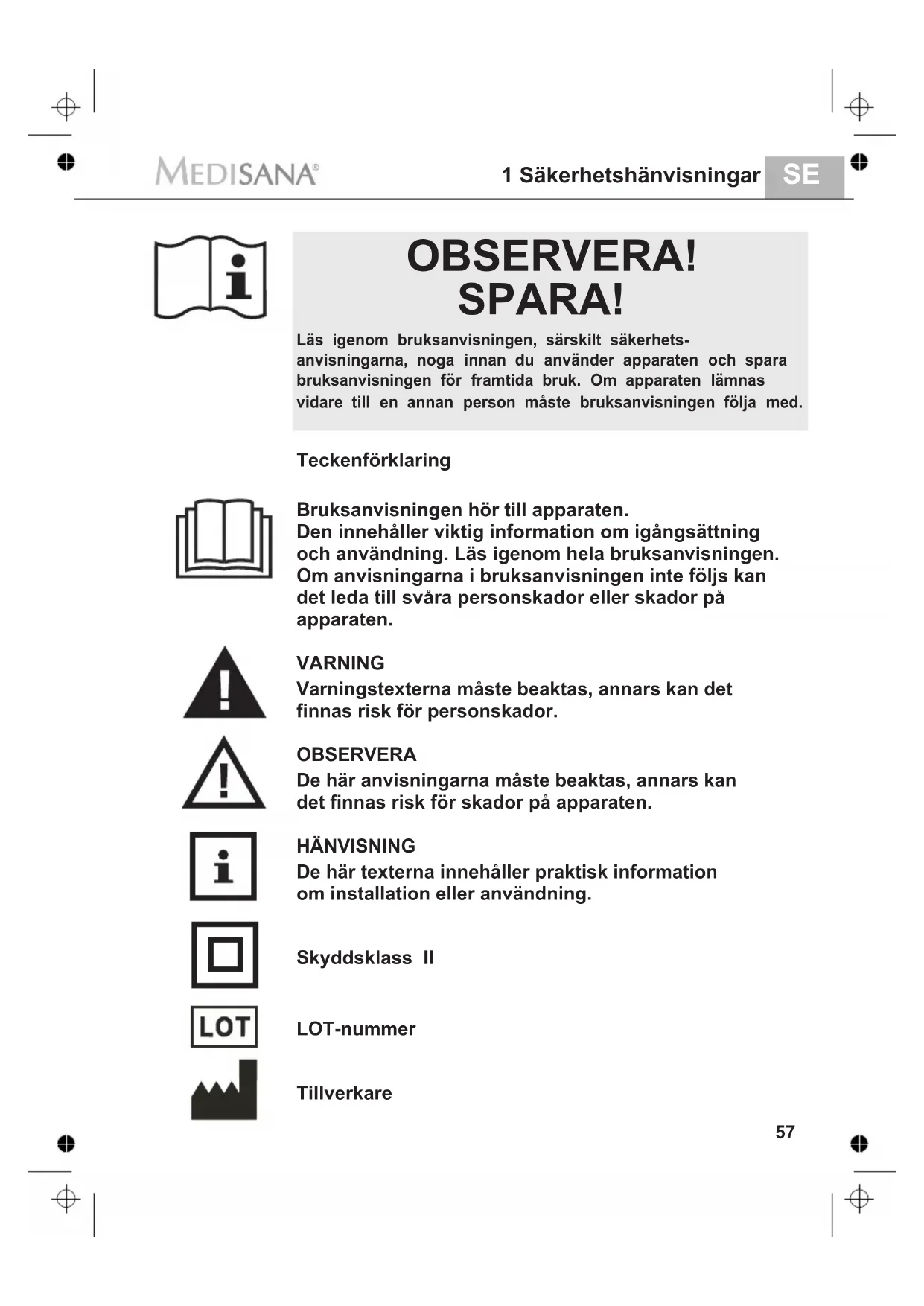 - Om nätkabeln ar skadad fär den endast bytas ut av MEDISANA, auktoriserade äterförsäljare eller motsvarande behörig person.