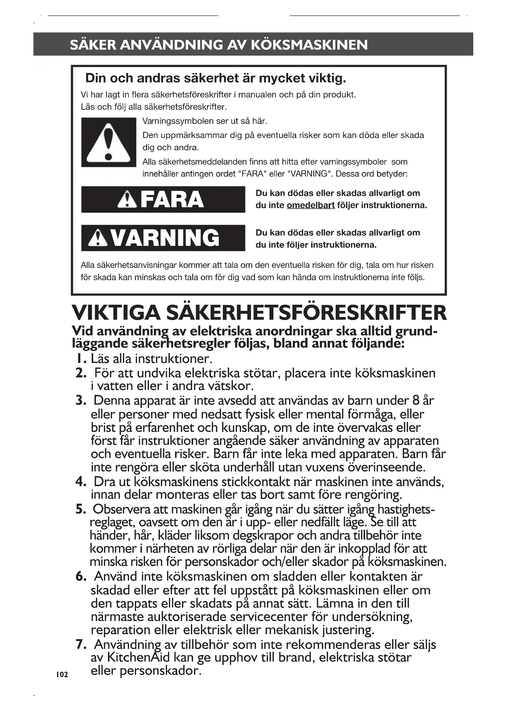 KitchenAids garanti för köksmaskiner ............................................................ 112 Servicecenter .................................................................................................. 112 Kundtjänst ....................................................................................................... 112 InnehållsförtecknIng W10648168A_09_SV.indd 101 1/29/14 3:20 PM102 SÄKER ANVÄNDNING AV KÖKSMASKINENSÄKER ANVÄNDNING AV KÖKSMASKINEN Din och andras säkerhet är mycket viktig. Vi har lagt in era säkerhetsföreskrifter i manualen och på din produkt. Läs och följ alla säkerhetsföreskrifter. Varningssymbolen ser ut så här. Den uppmärksammar dig på eventuella risker som kan döda eller skada dig och andra. Alla säkerhetsmeddelanden nns att hitta efter varningssymboler som innehåller antingen ordet "FARA" eller "VARNING". Dessa ord betyder: Du kan dödas eller skadas allvarligt om du inte omedelbart följer instruktionerna. Du kan dödas eller skadas allvarligt om du inte följer instruktionerna. Alla säkerhetsanvisningar kommer att tala om den eventuella risken för dig, tala om hur risken för skada kan minskas och tala om för dig vad som kan hända om instruktionerna inte följs. FARA VARNING