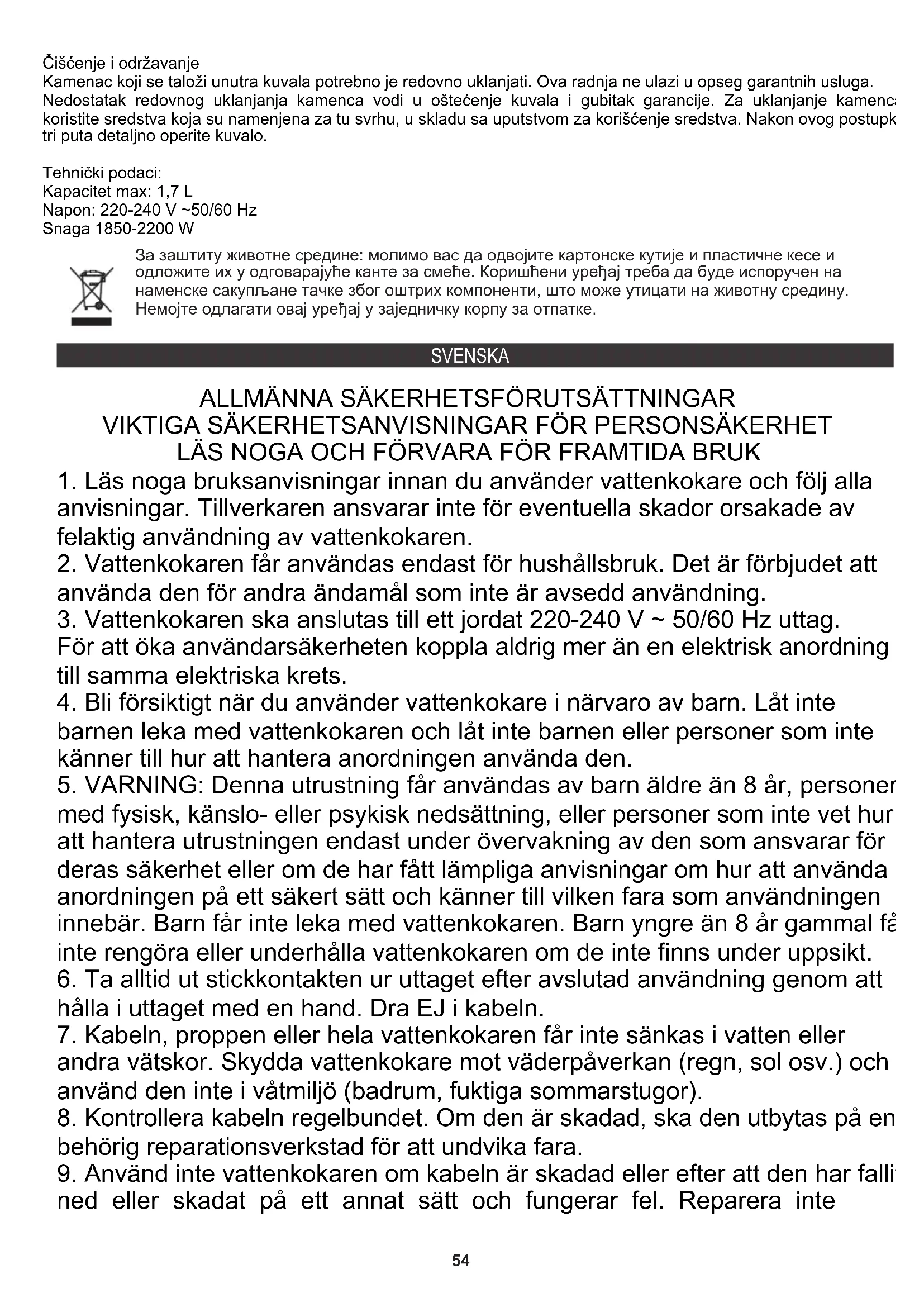 hålla i uttaget med en hand. Dra EJ i kabeln. За заштиту животне средине: молимо вас да одвојите картонске кутије и пластичне кесе и одложите их у одговарајуће канте за смеће. Коришћени уређај треба да буде испоручен на наменске сакупљане тачке због оштрих компоненти, што може утицати на животну средину. Немојте одлагати овај уређај у заједничку корпу за отпатке. Čišćenje i održavanje Kamenac koji se taloži unutra kuvala potrebno je redovno uklanjati. Ova radnja ne ulazi u opseg garantnih usluga. Nedostatak redovnog uklanjanja kamenca vodi u oštećenje kuvala i gubitak garancije. Za uklanjanje kamenca koristite sredstva koja su namenjena za tu svrhu, u skladu sa uputstvom za korišćenje sredstva. Nakon ovog postupka tri puta detaljno operite kuvalo. Snaga 1850-2200 W Napon: 220-240 V ~50/60 Hz Tehnički podaci: Kapacitet max: 1,7 L SVENSKA55