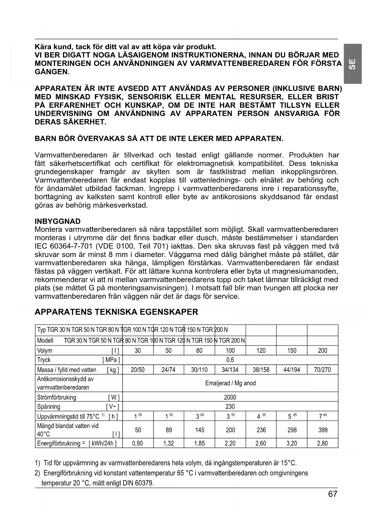 Kära kund, tack för ditt val av att köpa vår produkt. VI BER DIGATT NOGA LÄSAIGENOM INSTRUKTIONERNA, INNAN DU BÖRJAR MED MONTERINGEN OCH ANVÄNDNINGEN AV VARMVATTENBEREDAREN FÖR FÖRSTA GÅNGEN. APPARATEN ÄR INTE AVSEDD ATT ANVÄNDAS AV PERSONER (INKLUSIVE BARN) MED MINSKAD FYSISK, SENSORISK ELLER MENTAL RESURSER, ELLER BRIST PÅ ERFARENHET OCH KUNSKAP, OM DE INTE HAR BESTÄMT TILLSYN ELLER UNDERVISNING OM ANVÄNDNING AV APPARATEN PERSON ANSVARIGA FÖR DERAS SÄKERHET. BARN BÖR ÖVERVAKAS SÅ ATT DE INTE LEKER MED APPARATEN. Varmvattenberedaren är tillverkad och testad enligt gällande normer. Produkten har fått säkerhetscertifl kat och certifl kat för elektromagnetisk kompatibilitet. Dess tekniska grundegenskaper framgår av skylten som är fastklistrad mellan inkopplingsrören. Varmvattenberedaren får endast kopplas till vattenlednings- och elnätet av behörig och för ändamålet utbildad fackman. Ingrepp i varmvattenberedarens inre i reparationssyfte, borttagning av kalksten samt kontroll eller byte av antikorosions skyddsanod får endast göras av behörig märkesverkstad. INBYGGNAD Montera varmvattenberedaren så nära tappstället som möjligt. Skall varmvattenberedaren monteras i utrymme där det fi nns badkar eller dusch, måste bestämmelser i standarden IEC 60364-7-701 (VDE 0100, Teil 701) iakttas. Den ska skruvas fast på väggen med två skruvar som är minst 8 mm i diameter. Väggarna med dålig bärighet måste på stället, där varmvattenberedaren ska hänga, lämpligen förstärkas. Varmvattenberedaren får endast fästas på väggen vertikalt. För att lättare kunna kontrolera eller byta ut magnesiumanoden, rekommenderar vi att ni mellan varmvattenberedarens topp och taket lämnar tillräckligt med plats (se måttet G på monteringsanvisningen). I motsatt fall blir man tvungen att plocka ner varmvattenberedaren från väggen när det är dags för service.