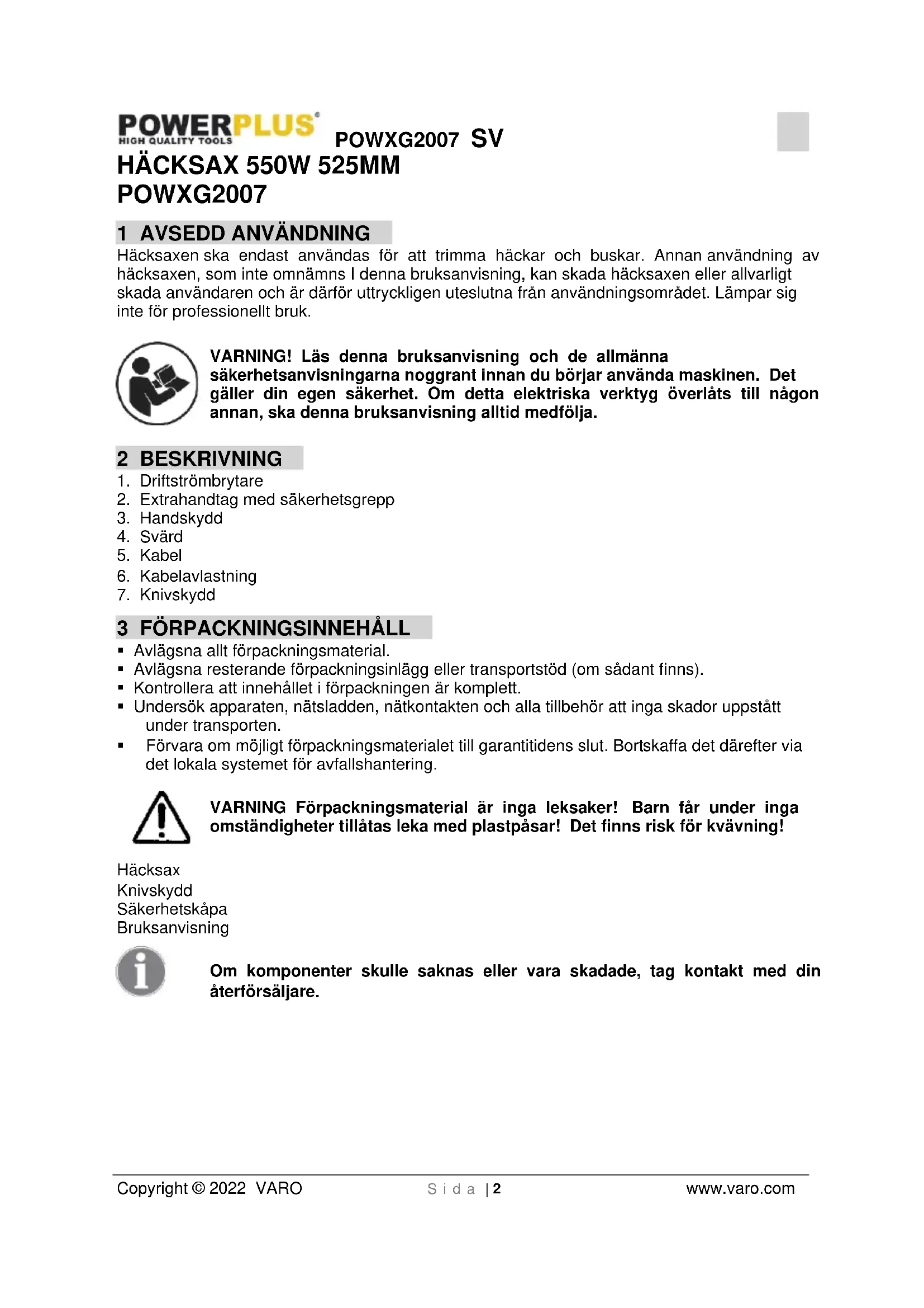 - Använd endast originalreservdelar och originaltillbehör. 9 TEKNISKA DATA Typ POWXG2007 Spänning 230-240 V ~ 50 Hz Ingångseffekt 550 W Svärdlängd 525 mm Klipplängd 450 mm Klippkapacitet 16 mm Obelastad hastighet 1400/min 10 BULLER Bulleremissionsvärden uppmätta enligt tillämplig standard. (K=3) Ljudtrycksnivå LpA 89 dB(A) Ljudeffektnivå LwA 100 dB(A) OBS! Bär hörselskydd när ljudtrycket överstiger 85 dB(A). aw (Vibration) 3,2 m/s² K = 1,5 m/s²POWXG2007 SV Copyright © 2022 VARO S i d a | 7 www.varo.com 11 GARANTI