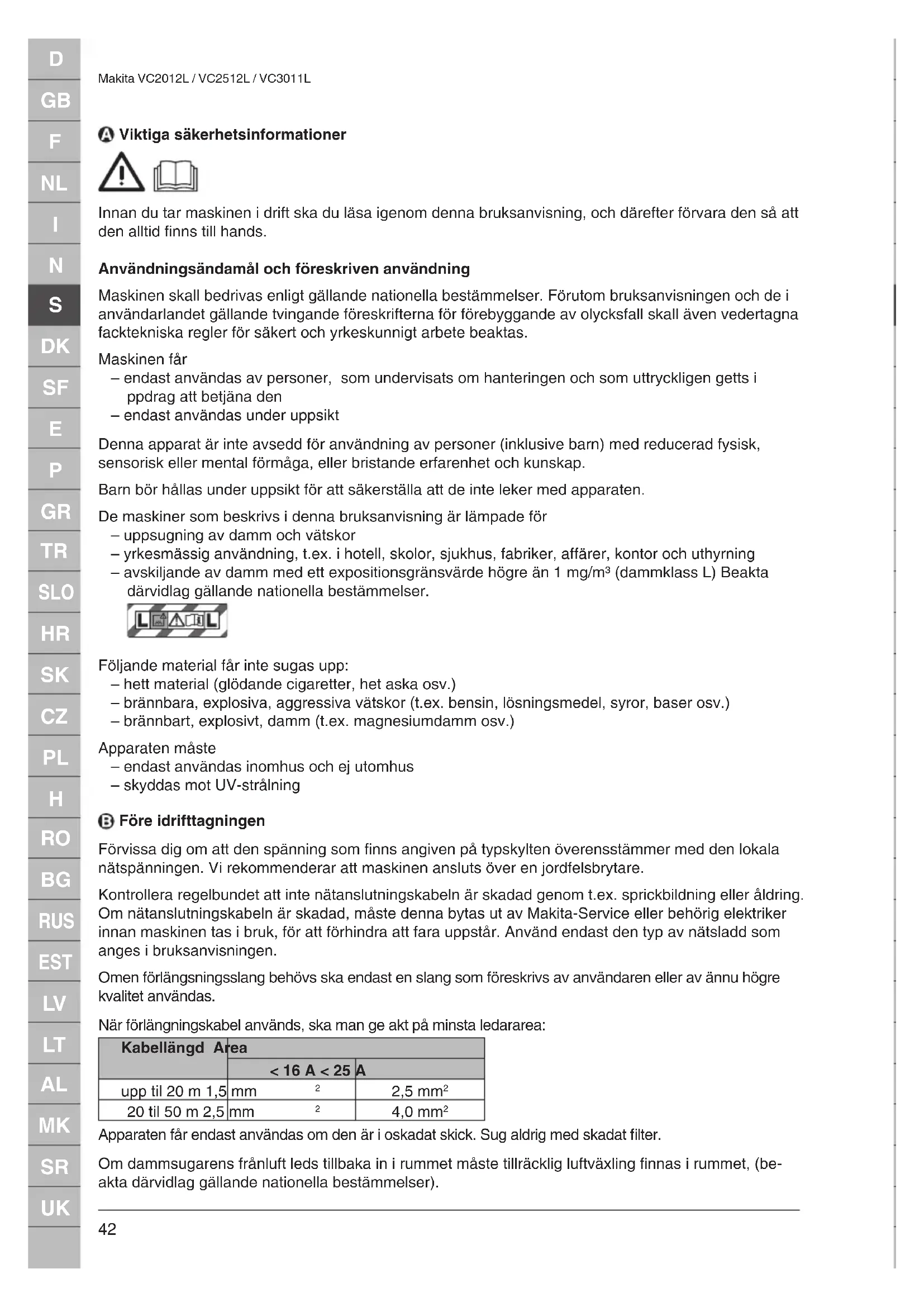 Makita VC2012L / VC2512L / VC3011L Viktiga säkerhetsinformationer Innan du tar maskinen i drift ska du läsa igenom denna bruksanvisning, och därefter förvara den så att den alltid finns till hands. Användningsändamål och föreskriven användning Maskinen skall bedrivas enligt gällande nationella bestämmelser. Förutom bruksanvisningen och de i användarlandet gällande tvingande föreskrifterna för förebyggande av olycksfall skall även vedertagna facktekniska regler för säkert och yrkeskunnigt arbete beaktas. Maskinen får – endast användas av personer, som undervisats om hanteringen och som uttryckligen getts i ppdrag att betjäna den – endast användas under uppsikt Denna apparat är inte avsedd för användning av personer (inklusive barn) med reducerad fysisk, sensorisk eller mental förmåga, eller bristande erfarenhet och kunskap. Barn bör hållas under uppsikt för att säkerställa att de inte leker med apparaten. De maskiner som beskrivs i denna bruksanvisning är lämpade för – uppsugning av damm och vätskor – yrkesmässig användning, t.ex. i hotell, skolor, sjukhus, fabriker, affärer, kontor och uthyrning – avskiljande av damm med ett expositionsgränsvärde högre än 1 mg/m³ (dammklass L) Beakta därvidlag gällande nationella bestämmelser. Följande material får inte sugas upp: – hett material (glödande cigaretter, het aska osv.) – brännbara, explosiva, aggressiva vätskor (t.ex. bensin, lösningsmedel, syror, baser osv.) – brännbart, explosivt, damm (t.ex. magnesiumdamm osv.) Apparaten måste – endast användas inomhus och ej utomhus – skyddas mot UV-strålning Före idrifttagningen Förvissa dig om att den spänning som finns angiven på typskylten överensstämmer med den lokala nätspänningen. Vi rekommenderar att maskinen ansluts över en jordfelsbrytare. Kontrollera regelbundet att inte nätanslutningskabeln är skadad genom t.ex. sprickbildning eller åldring. Om nätanslutningskabeln är skadad, måste denna bytas ut av Makita-Service eller behörig elektriker innan maskinen tas i bruk, för att förhindra att fara uppstår. Använd endast den typ av nätsladd som anges i bruksanvisningen. Omen förlängsningsslang behövs ska endast en slang som föreskrivs av användaren eller av ännu högre kvalitet användas. När förlängningskabel används, ska man ge akt på minsta ledararea: Kabellängd Area < 16 A < 25 A upp til 20 m 1,5 mm