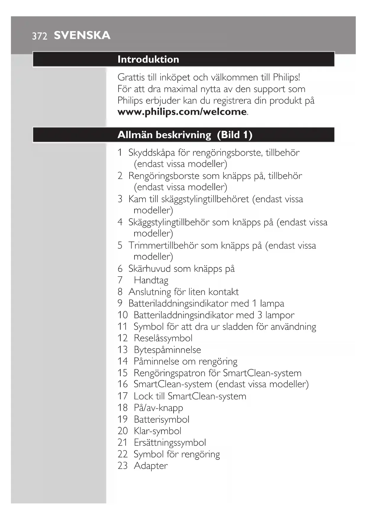 SVENSKA380Rakning Period för hudanpassning Första gångerna du rakar dig kanske du inte får det resultat du önskat dig, och huden kan till och med bli lite irriterad. Det här är normalt. Både huden och skäggväxten behöver anpassa sig till ett nytt raksystem. Vi rekommenderar att du rakar dig regelbundet (minst 3 gånger i veckan) med den här rakapparaten under en 3-veckorsperiod för att huden ska vänja sig vid den nya rakapparaten. Obs! Den här apparaten kan endast användas utan sladd. 1 Slå på apparaten. 2 För rakhuvudena över huden med cirkelformade rörelser. Obs! Gör inte raka rörelser. 3 Rengör rakhuvudet efter användning (se kapitlet Rengöring och underhåll). Våtrakning Du kan också använda den här rakapparaten i duschen eller på ett vått ansikte med raklödder eller rakgel. Om du vill raka dig med raklödder eller rakgel följer du stegen nedan: 1 Fukta huden med lite vatten. 2 Stryk raklödder eller rakgel på huden. SVENSKA 3813 Skölj skärhuvudet under kranen för att se till att skärhuvudet glider jämnt över huden. 4 Slå på apparaten. 5 För rakhuvudena över huden med cirkelformade rörelser. Obs! Skölj rakapparaten under kranen regelbundet för att se till att den fortsätter att glida jämnt över huden. 6 Torka ansiktet och rengör rakapparaten noggrant efter användningen (se kapitlet Rengöring och underhåll). Obs! Se till att du sköljer bort allt skum eller rakgel från rakapparaten. Med hjälp av tillbehör som knäpps på Obs! De medföljande tillbehören kan variera för olika produkter. Rutan visar de tillbehör som har levererats med apparaten. Ta bort eller sätta fast tillbehör som knäpps på 1 Se till att apparaten är avstängd. 2 Dra av tillbehöret från apparaten. Obs! Vrid inte tillbehöret när du drar av det från apparaten. 3 Sätt tillbehörets kant i spåret överst på apparaten. Tryck sedan tillbehöret nedåt så att det fästs i apparaten (ett klickljud hörs). SVENSKA382Använda trimmertillbehöret Du kan ansa polisonger och mustasch med trimmertillbehöret. 1 Kontrollera att apparaten är avstängd. 2 Sätt trimmerns kant i spåret överst på rakapparaten. Tryck sedan trimmern nedåt så att den fästs i apparaten (ett klickljud hörs). 3 Slå på apparaten. 4 Du kan nu börja trimma. 5 Rengör tillbehöret efter användning (se kapitlet Rengöring och underhåll). Använda skäggstylingtillbehöret 1 Kontrollera att apparaten är avstängd. 2 Sätt tillbehörets kant i spåret överst på apparaten. Tryck sedan tillbehöret nedåt så att det fästs i apparaten (ett klickljud hörs). Använda skäggstylingtillbehöret med kammen Du kan använda skäggstylingtillbehöret med kammen för att forma skägget med en fast inställning, men också med olika längdinställningar. För en bekvämare rakning kan du även använda tillbehöret för att förtrimma långa hårstrån innan du rakar dig. Hårlängdsinställningarna på skäggstylingtillbehöret motsvarar hårlängden du får efter klippningen och sträcker sig från 1 till 5 mm. 1 För in kammen rakt i skårorna på båda sidor av tillbehöret (ett klickljud hörs). 2 Tryck på längdväljaren och skjut den åt vänster eller höger för att välja den önskade hårlängdsinställningen.