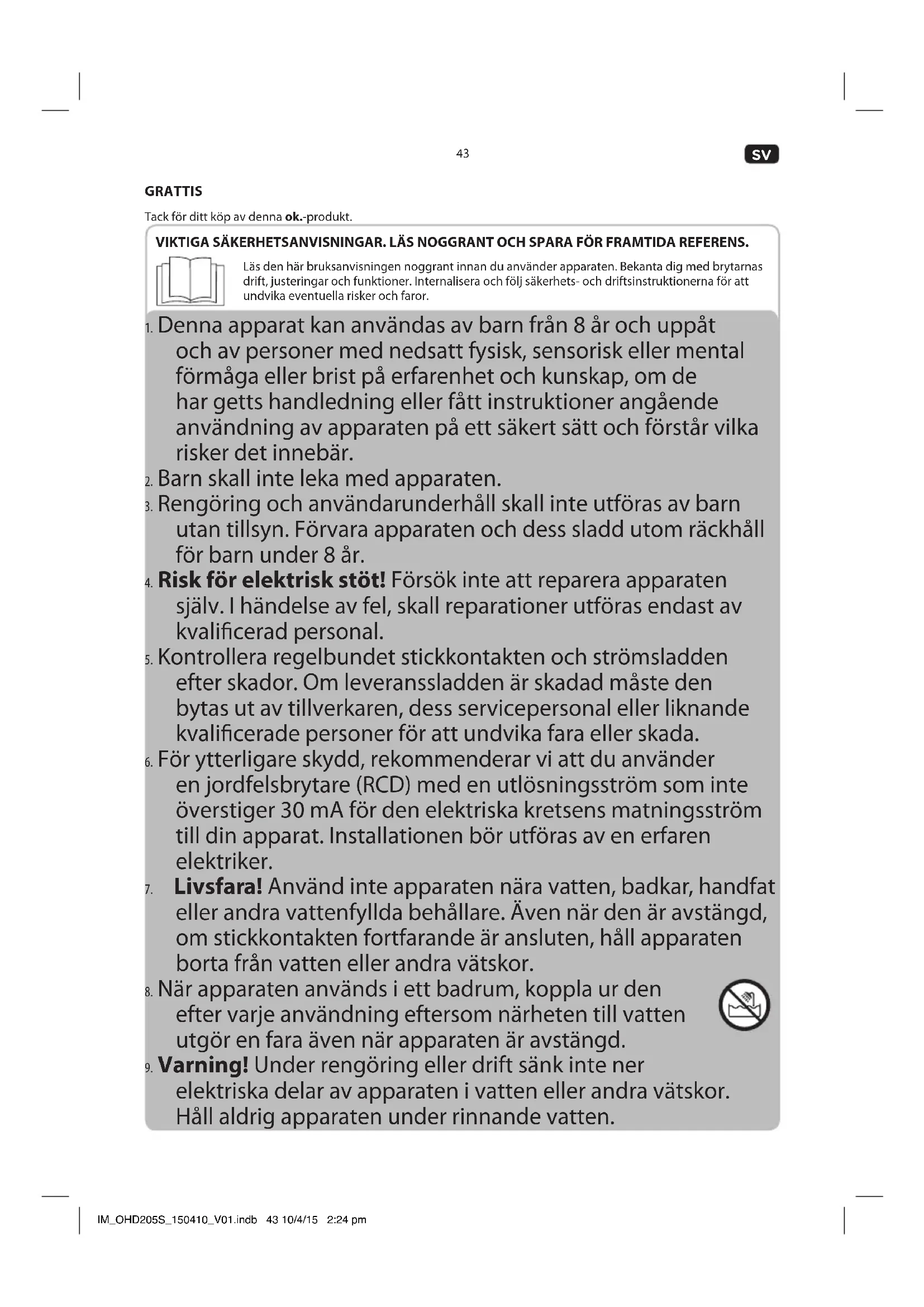 - Livsfara! Använd inte apparaten nara vatten, badkar, handfat ell er andra vattenfyllda behällare. Åven nar den ar avstängd, om stickkontakten fortfarande ar ansluten, hall apparaten borta frän vatten erler andra vätskor.