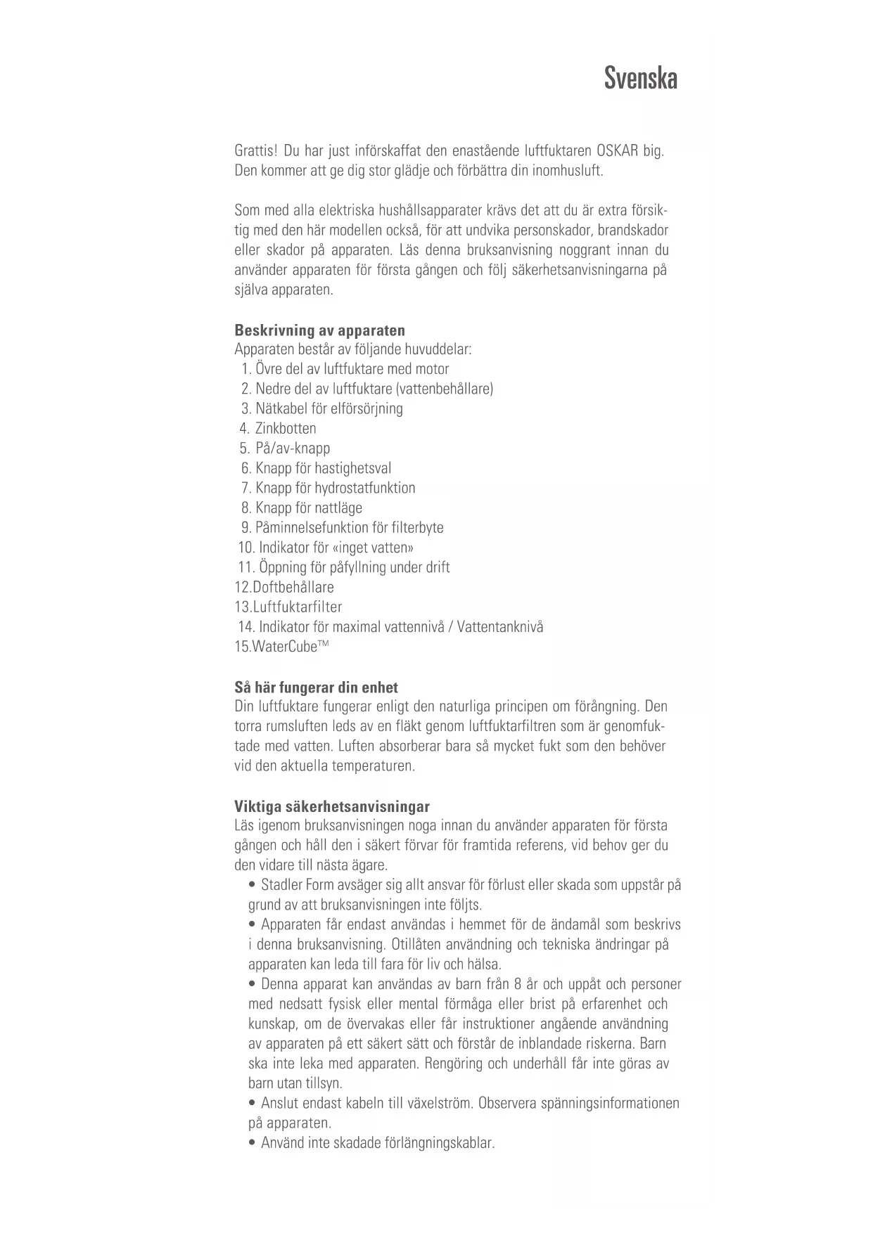 - För en hygienisk och optimal drift av luftfuktaren måste filtren bytas ut varannan till var tredje månad. Om du fortsätter att använda filtren under längre tid än så, kan dels fuktighetsutflödet sjunka kraftigt och dels kan filtrens antimikrobiella verkan inte längre garanteras. Luftfuktarfiltren kan erhållas från den återförsäljare där du köpte Oskar big. Water Cube™ – optimal hygien för din luftfuktare Water Cube™ (15) från Stadler Form sörjer för en optimal hygien i din luftfuk- tare. Användningen av Water Cubes leder till en felfri drift för luftfuktaren och förlänger enhetens livslängd. Water Cube verkar även när enheten är avstängd och håller luftfuktaren fräsch under en säsong. Vi rekommenderar att Water Cube byts ut i början av varje luftfuktarsäsong. Reparationer