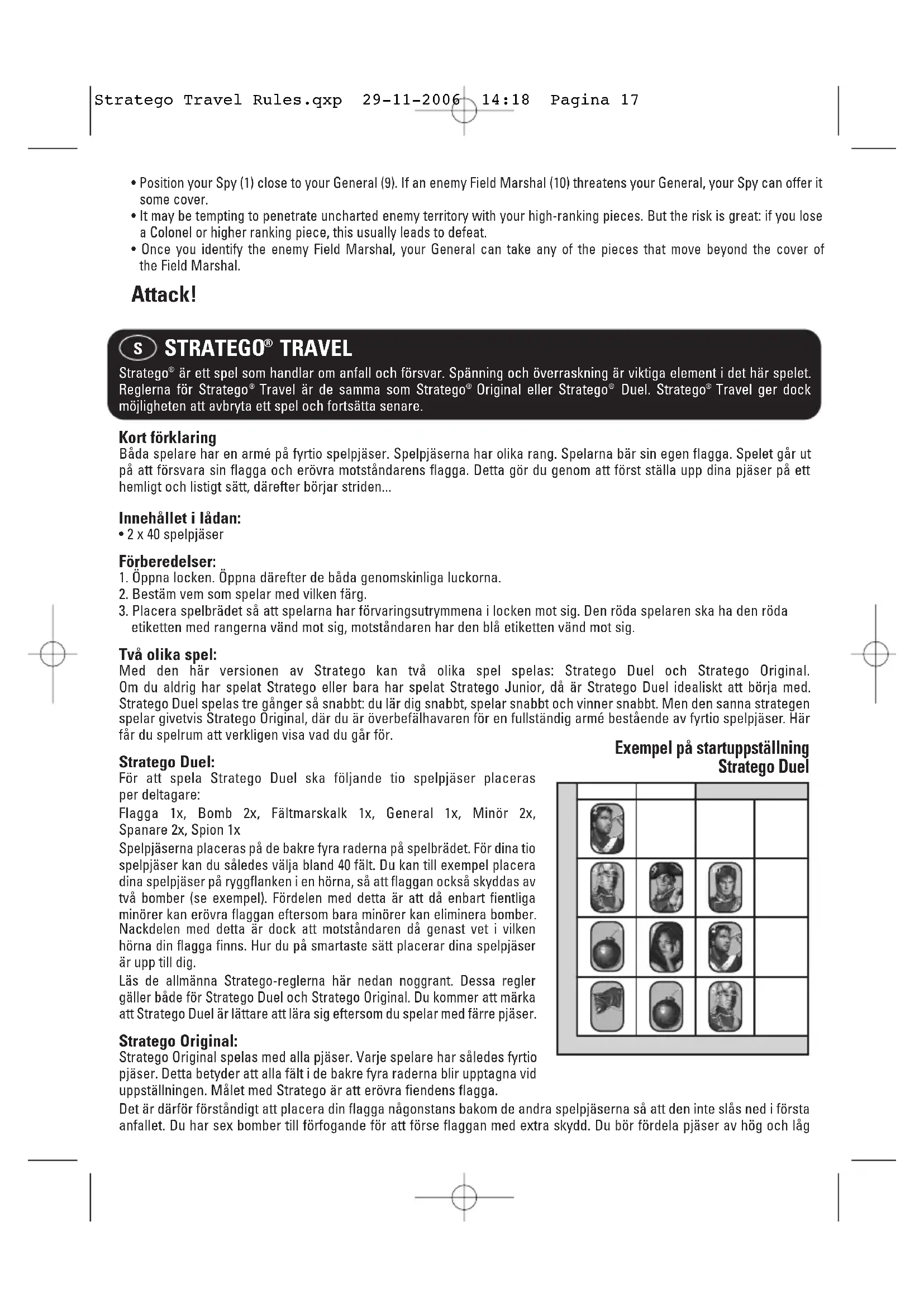 Exempel på startuppställning Stratego Duel Stratego Travel Rules.qxp 29-11-2006 14:18 Pagina 17rang väl över fältet så att det inte blir allt för lätt för fienden att tränga igenom. Men din uppställning måste också ge egna anfallsmöjligheter… Exempel på startuppställning Stratego Original. Allmänna spelregler: Kort förklaring: Placera spelbrädet på bordet. Spelarna lottar om vem som spelar med rött, den röda spelaren får nämligen börja. Varje spelare har en armé på tio (Stratego Duel) eller fyrtio (Stratego Original) spelpjäser, varav en är flaggan. Målet är att erövra fiendens flagga och försvara den egna flaggan. Du börjar med att göra din hemliga uppställning. Detta gör du genom att placera pjäserna på din hälft av spelbrädet, så att motspelaren inte kan se vilken rang som placeras var. Spelpjäserna placeras alltså med bilden mot dig och med baksidan mot motspelaren. Spelpjäserna har en viss rangordning: ju högre nummer desto högre är rangen. Om en spelpjäs med hög rang anfaller en spelpjäs med en lägre rang, vinner den högre rangen och pjäsen med den lägre rangen måste avlägsnas från spelbrädet. Flaggan kan erövras av alla fiendens spelpjäser som kan flyttas. Spelpjäserna och uppställningen: På spelpjäserna finns en bild och ett nummer. Numret anger hur hög rang pjäsen har. Marskalken har den högsta rangen och nummer 10, generalen har nummer 9 osv. ned till spionen som har nummer 1. Bara bomberna och flaggan är utan nummer eftersom de har en annan funktion. Du placerar spelpjäserna på de bakre fyra raderna på spelbrädet. Pjäserna ska placeras med baksidan mot motståndaren så att han eller hon inte kan se vilken rang de olika pjäserna har. De två mittersta raderna (med de två sjöarna) lämnas tomma. Vid uppställningen får inga spelpjäser placeras på dessa två rader. Själva uppställningen utgör en viktig del av spelet. Vinst eller förlust kan bero på uppställningen. I slutet av dessa spelinstruktioner finns några bra tips att tänka på. Spelets förlopp: Röd börjar. Därefter turar spelarna om och placerar en pjäs. Du flyttar en pjäs till ett tomt fält eller där en fiende står. I det senare fallet innebär detta anfall. Bara en pjäs får flyttas åt gången! Flyttning: Du kan flytta en pjäs ett fält åt vänster, höger, framåt eller bakåt. Spanaren (nummer 2) utgör ett undantag från den här regeln; förklaring av detta följer senare. Endast en pjäs kan stå på ett fält; pjäserna kan inte hoppa över varandra och får inte heller flyttas diagonalt. Spelpjäserna får inte placeras i de två sjöarna i mitten av spelbrädet. De kan heller inte hoppa över sjöarna. Det är inte tillåtet att oavbrutet gå fram och tillbaka mellan två fält med samma pjäs. Detta får göras högst tre gånger. Det är viktigt att komma ihåg vilken spelare som började med att flytta fram och tillbaka. Denna spelare måste nämligen upphöra först och detta kan ha stora konsekvenser genom att en viktig spelpjäs går förlorad. Den här regeln heter två-fältsregeln. Stratego Travel Rules.qxp 29-11-2006 14:18 Pagina 18Det är inte heller tillåtet att hela tiden följa en eller flera spelpjäser. Om detta sker (och över fler än två fält) då måste anfallaren upphöra med detta. Bomberna och flaggan får inte flyttas och de ska stå kvar på samma plats under hela spelets gång. För spanarna (2) gäller särskilda regler. Spanarna kan röra sig obegränsat över de tomma fälten. Men naturligtvis måste de göra detta i rak linje. Det vill säga åt vänster, åt höger, framåt och bakåt. Så långt de vill gå förutsatt att fältet är fritt, men de får inte röra sig över de egna eller fiendens pjäser. Dessutom kan de inte gå över sjöarna. Spanarna är de enda pjäserna som kan anfalla från långt avstånd. Anfall När du står direkt framför, vid sidan om eller bakom en av motståndarens pjäser kan du anfalla denna pjäs. Anfall går till så här: du tar din pjäs och stöter till den fientliga pjäsen och säger vilken rang (eller nummer) som din pjäs har. Din motståndare säger då rangen (eller numret) på sin pjäs. Pjäsen med lägsta rang stupar och tas bort från spelbrädet. Om den anfallande pjäsen vinner, intar den, den stupand pjäsens plats. Om den anfallande pjäsen vinner, förblir denna i position. Om du anfaller en pjäs av samma rang stupar båda pjäserna. Du är inte på något sätt förpliktigad att anfalla. Så som tidigare nämndes kan en spanare anfalla från längre avstånd. De mellanliggande fälten måste dock vara fria och anfallet kan bara göras i rak linje. En spanare (2) kan på så sätt eliminera en spion (1) från långt avstånd. Rang: Marskalken (10) slår en general (9) och alla av lägre rang. Generalen (9) slår korpralen (8) och alla av lägre rang. Detta fortsätter till spionen (1) som har lägsta rang. Gällande rangordning finns återgiven i början av spelreglerna. De anges med namn och rang. Det är roligare att lära sig namnen på varje rang men numret räcker givetvis också, till exempel "min 8:a vinner över din 5:a", men det låter bättre att säga "min korpral slår din löjtnant". Bomber och minörer (3). Varje pjäs som anfaller en bomb stupar. Bomben blir dock kvar. Det finns ett undantag för den här regeln och det gäller minören. Om en minör anfaller en bomb oskadliggörs bomben. Bomben tas bort från spelbrädet och minören intar då bombens plats. Spionen (1). Spionen är en förförisk dam; hon har lägsta rang. Varje spelpjäs som anfaller henne vinner. Men hon har dock en särskild egenskap som gör henne till en förrädisk intrigmakerska. Om spionen anfaller marskalken (10) då slår hon marskalken! Detta gäller bara när det är spionen som anfaller. Om marskalken anfaller henne, då vinner marskalken och spionen tas bort från spelbrädet. Flaggan kan erövras av samliga pjäser. Även av 
