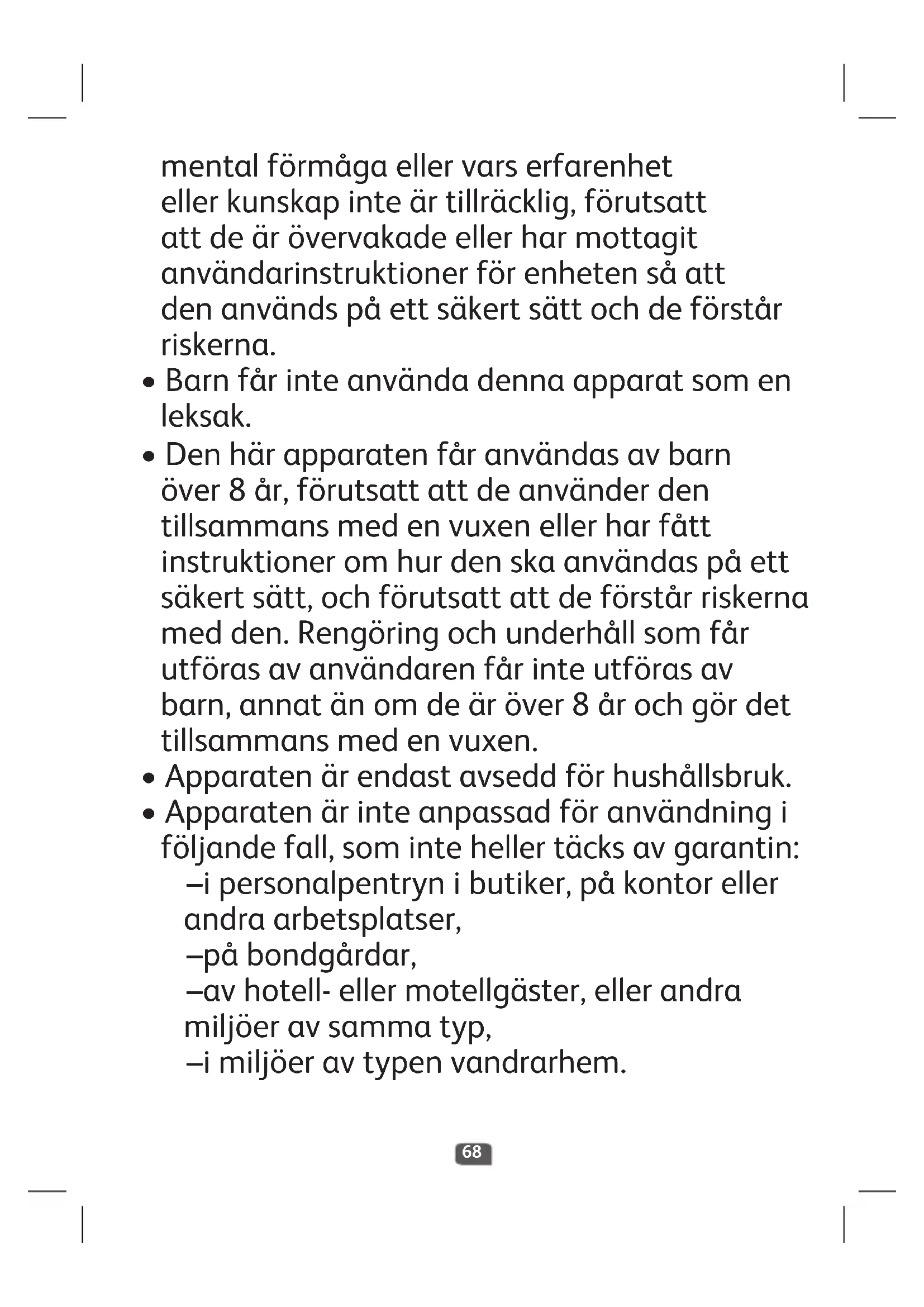- Apparatenärinteanpassadföranvändningi följandefall,somintehellertäcksavgarantin: – ipersonalpentrynibutiker,påkontoreller andraarbetsplatser, – påbondgårdar, – avhotell-ellermotellgäster,ellerandra miljöeravsammatyp, – imiljöeravtypenvandrarhem. mentalförmågaellervarserfarenhet ellerkunskapinteärtillräcklig,förutsatt attdeärövervakadeellerharmottagit användarinstruktionerförenhetensåatt denanvändspåettsäkertsättochdeförstår riskerna.