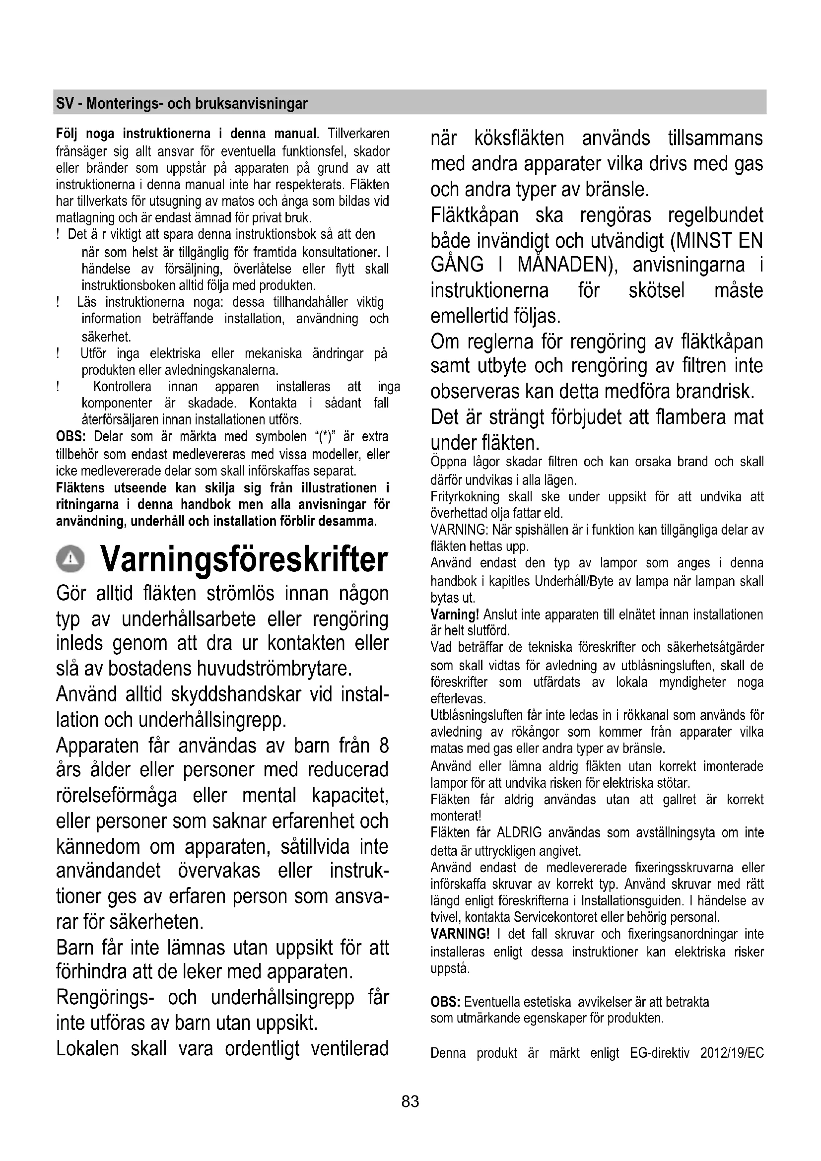 Για την αγορά του led που πρόκειται να αντικαταστήσετε απευθυνθείτε στην υπηρεσία τεχνικής υποστήριξης.83 SV - Monterings- och bruksanvisningar Följ noga instruktionerna i denna manual. Tillverkaren frånsäger sig allt ansvar för eventuella funktionsfel, skador eller bränder som uppstår på apparaten på grund av att instruktionerna i denna manual inte har respekterats. Fläkten har tillverkats för utsugning av matos och ånga som bildas vid matlagning och är endast ämnad för privat bruk. ! Det ä r viktigt att spara denna instruktionsbok så att den när som helst är tillgänglig för framtida konsultationer. I händelse av försäljning, överlåtelse eller flytt skall instruktionsboken alltid följa med produkten. ! Läs instruktionerna noga: dessa tillhandahåller viktig information beträffande installation, användning och säkerhet. ! Utför inga elektriska eller mekaniska ändringar på produkten eller avledningskanalerna. ! Kontrollera innan apparen installeras att inga komponenter är skadade. Kontakta i sådant fall återförsäljaren innan installationen utförs. OBS: Delar som är märkta med symbolen “(*)” är extra tillbehör som endast medlevereras med vissa modeller, eller icke medlevererade delar som skall införskaffas separat. Fläktens utseende kan skilja sig från illustrationen i ritningarna i denna handbok men alla anvisningar för användning, underhåll och installation förblir desamma. Varningsföreskrifter Gör alltid fläkten strömlös innan någon typ av underhållsarbete eller rengöring inleds genom att dra ur kontakten eller slå av bostadens huvudströmbrytare. Använd alltid skyddshandskar vid instal- lation och underhållsingrepp. Apparaten får användas av barn från 8 års ålder eller personer med reducerad rörelseförmåga eller mental kapacitet, eller personer som saknar erfarenhet och kännedom om apparaten, såtillvida inte användandet övervakas eller instruk- tioner ges av erfaren person som ansva- rar för säkerheten. Barn får inte lämnas utan uppsikt för att förhindra att de leker med apparaten. Rengörings- och underhållsingrepp får inte utföras av barn utan uppsikt. Lokalen skall vara ordentligt ventilerad när köksfläkten används tillsammans med andra apparater vilka drivs med gas och andra typer av bränsle. Fläktkåpan ska rengöras regelbundet både invändigt och utvändigt (MINST EN GÅNG I MÅNADEN), anvisningarna i instruktionerna för skötsel måste emellertid följas. Om reglerna för rengöring av fläktkåpan samt utbyte och rengöring av filtren inte observeras kan detta medföra brandrisk. Det är strängt förbjudet att flambera mat under fläkten. Öppna lågor skadar filtren och kan orsaka brand och skall därför undvikas i alla lägen. Frityrkokning skall ske under uppsikt för att undvika att överhettad olja fattar eld. VARNING: När spishällen är i funktion kan tillgängliga delar av fläkten hettas upp. Använd endast den typ av lampor som anges i denna handbok i kapitles Underhåll/Byte av lampa när lampan skall bytas ut. Varning! Anslut inte apparaten till elnätet innan installationen är helt slutförd. Vad beträffar de tekniska föreskrifter och säkerhetsåtgärder som skall vidtas för avledning av utblåsningsluften, skall de föreskrifter som utfärdats av lokala myndigheter noga efterlevas. Utblåsningsluften får inte ledas in i rökkanal som används för avledning av rökångor som kommer från apparater vilka matas med gas eller andra typer av bränsle. Använd eller lämna aldrig fläkten utan korrekt imonterade lampor för att undvika risken för elektriska stötar. Fläkten får aldrig användas utan att gallret är korrekt monterat! Fläkten får ALDRIG användas som avställningsyta om inte detta är uttryckligen angivet. Använd endast de medlevererade fixeringsskruvarna eller införskaffa skruvar av korrekt typ. Använd skruvar med rätt längd enligt föreskrifterna i Installationsguiden. I händelse av tvivel, kontakta Servicekontoret eller behörig personal. VARNING! I det fall skruvar och fixeringsanordningar inte installeras enligt dessa instruktioner kan elektriska risker uppstå. OBS: Eventuella estetiska avvikelser är att betrakta som utmärkande egenskaper för produkten. Denna produkt är märkt enligt EG-direktiv 2012/19/EC84 beträffande elektriskt och elektroniskt avfall (Waste Electrical and Electronic Equipment, WEEE). Genom att säkerställa en korrekt kassering av denna produkt bidrar du till att förhindra potentiella, negativa konsekvenser för vår miljö och vår hälsa, som annars kan bli följden om produkten inte hanteras på rätt sätt. Symbolen på produkten, eller i medföljande dokumentation, indikerar att denna produkt inte får behandlas som vanligt hushållsavfall. Den skall i stället lämnas in på en lämplig uppsamlingsplats för återvinning av elektrisk och elektronisk utrustning. Produkten måste kasseras enligt lokala miljöbestämmelser för avfallshantering. För mer information om hantering, återvinning och återanvändning av denna produkt, var god kontakta de lokala myndigheterna, ortens sophanteringstjänst eller butiken där produkten inhandlades. Apparat utformad, testad och tillverkad i enlighet med: