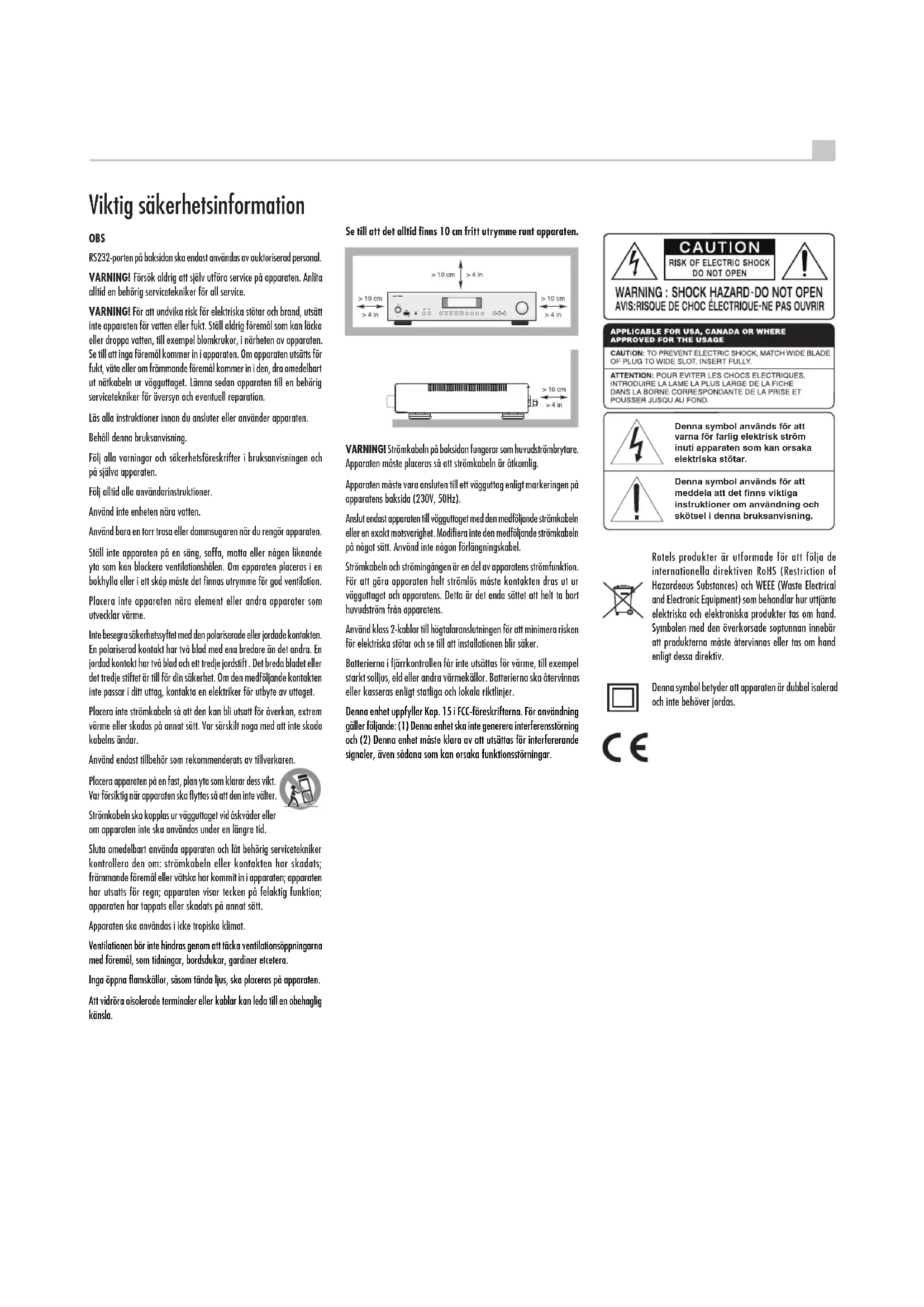 Inställningar .....................................................75 Felsökning ......................................................76 Strömindikatorn (POWER) lyser inte 76 Säkring 76 Inget ljud hörs 76 Kompatibla ljudformat 76 Kan inte ansluta via Bluetooth 76 Specikationer ...................................................7771 Svenska Förstärkarens viktigaste funktioner är enkla och lättbegripliga. Om du är van vid stereoanläggningar så bör du inte ha några problem med att börja använda förstärkaren. Koppla bara in resten av anläggningen, så kan du börja njuta av musiken. Att tänka på VARNING: För att undvika skador på din anläggning, stäng av ALLA komponenter i anläggningen innan du kopplar in eller tar bort högtalare eller andra komponenter. Slå inte på anläggningen förrän du är säker på att alla anslutningar är gjorda på rätt sätt. Var särskilt noga med högtalarkablarna. Det får inte nnas några lösa ledare som kan komma i kontakt med andra kablar eller förstärkarens chassi. Läs denna bruksanvisning noggrant. Den ger dig grundläggande instruktioner om hur du installerar och använder A12 i din anläggning, samt information om hur du får ett så bra ljud som möjligt. Om du har några frågor är du alltid välkommen att kontakta din Rotel-återförsäljare. Alla vi på Rotel uppskattar dina frågor och synpunkter. Spara kartongen och allt packmaterial så så att du kan använda detta vid ett senare tillfälle. Att skicka eller ytta förstärkaren i en annan förpackning kan skada den allvarligt. Om du ingår i rutan, fyll i ägarens registreringskort eller registrera dig på rad. Spara också ditt originalkvitto från köptillfället. Det är det bästa beviset för när du köpt apparaten, vilket kan vara viktigt om du behöver lämna in den för garantiservice. Placering Precis som alla elektriska komponenter som hanterar lågnivåsignaler påverkas den här enheten av sin omgivning. Undvik att ställa förstärkaren ovanpå andra komponenter. Dra inte heller signalkablar i närheten av nätkablar, eftersom sådana kan påverka ljudsignalen och orsaka störningar. Enheten alstrar värme vid normal användning. Kylflänsarna och ventilationshålen är utformade för att leda bort värme. Täck inte över ventilationshålen. Se till att det nns 10 cm fritt utrymme runt om förstärkaren och att det nns god ventilation, så att den inte överhettas. Tänk på förstärkarens vikt när du väljer placering. Se till att apparatens vikt kan bäras av hyllan eller bänken den ställs på. Vi rekommenderar att du placerar enheten i en möbel som är utformad för stereokomponenter. Sådana möbler är byggda för att minimera eller eliminera vibrationer som kan påverka ljudkvaliteten. Kontakta din Rotel-återförsäljare om du vill ha hjälp med installationen och med att välja hi-möbel. Kablar Se till att nätkablar, högtalarkablar, digitalkablar och vanliga signalkablar inte ligger i närheten av varandra. Det minimerar risken för att signalkablarna påverkas av störningar eller förvrängningar från andra kablar. Om du använder avskärmade kablar av hög kvalitet så förhindrar du också att ljudkvaliteten störs från andra kablar. Om du har några frågor om vilka kablar du bör använda är du välkommen att kontakta din Rotel-återförsäljare. Fjärrkontroll RR-AX1400 Vissa funktioner kan skötas med antingen kontrollerna på fronten eller på fjärrkontrollen RR-AX1400. I bruksanvisningen anger ett nummer i en ruta att funktionen nns på förstärkaren och en bokstav i en cirkel att den nns på fjärrkontrollen. Ändra fjärrkontrollens kod Från början är A12 och fjärrkontrollen inställd på att använda fjärrkontrollkod