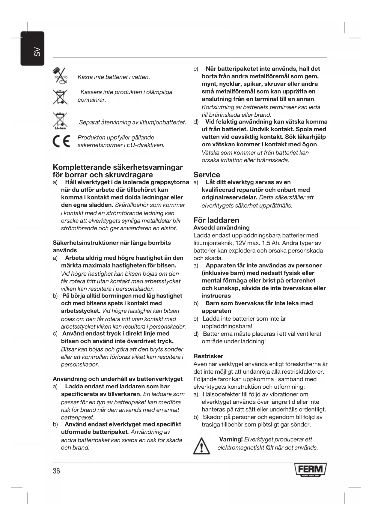 Kasta inte batteriet i vatten. Kassera inte produkten i olämpliga containrar. Separat återvinning av litiumjonbatteriet. Produkten uppfyller gällande säkerhetsnormer i EU-direktiven. Kompletterande säkerhetsvarningar för borrar och skruvdragare a) Håll elverktyget i de isolerade greppsytorna när du utför arbete där tillbehöret kan komma i kontakt med dolda ledningar eller den egna sladden. Skärtillbehör som kommer i kontakt med en strömförande ledning kan orsaka att elverktygets synliga metalldelar blir strömförande och ger användaren en elstöt. Säkerhetsinstruktioner när långa borrbits används a) Arbeta aldrig med högre hastighet än den märkta maximala hastigheten för bitsen. Vid högre hastighet kan bitsen böjas om den får rotera fritt utan kontakt med arbetsstycket vilken kan resultera i personskador. b) På börja alltid borrningen med låg hastighet och med bitsens spets i kontakt med arbetsstycket. Vid högre hastighet kan bitsen böjas om den får rotera fritt utan kontakt med arbetsstycket vilken kan resultera i personskador. c) Använd endast tryck i direkt linje med bitsen och använd inte överdrivet tryck. Bitsar kan böjas och göra att den bryts sönder eller att kontrollen förloras vilket kan resultera i personskador. Användning och underhåll av batteriverktyget a) Ladda endast med laddaren som har specificerats av tillverkaren. En laddare som passar för en typ av batteripaket kan medföra risk för brand när den används med en annat batteripaket. b) Använd endast elverktyget med specifikt utformade batteripaket. Användning av andra batteripaket kan skapa en risk för skada och brand. c) När batteripaketet inte används, håll det borta från andra metallföremål som gem, mynt, nycklar, spikar, skruvar eller andra små metallföremål som kan upprätta en anslutning från en terminal till en annan. Kortslutning av batteriets terminaler kan leda till brännskada eller brand. d) Vid felaktig användning kan vätska komma ut från batteriet. Undvik kontakt. Spola med vatten vid oavsiktlig kontakt. Sök läkarhjälp om vätskan kommer i kontakt med ögon. Vätska som kommer ut från batteriet kan orsaka irritation eller brännskada. Service a) Låt ditt elverktyg servas av en kvalificerad reparatör och enbart med originalreservdelar. Detta säkerställer att elverktygets säkerhet upprätthålls. För laddaren Avsedd användning Ladda endast uppladdningsbara batterier med litiumjonteknik, 12V max. 1,5 Ah. Andra typer av batterier kan explodera och orsaka personskada och skada. a) Apparaten får inte användas av personer (inklusive barn) med nedsatt fysisk eller mental förmåga eller brist på erfarenhet och kunskap, såvida de inte övervakas eller instrueras b) Barn som övervakas får inte leka med apparaten c) Ladda inte batterier som inte är uppladdningsbara! d) Batterierna måste placeras i ett väl ventilerat område under laddning! Restrisker Även när verktyget används enligt föreskrifterna är det inte möjligt att undanröja alla restriskfaktorer. Följande faror kan uppkomma i samband med elverktygets konstruktion och utformning: a) Hälsodefekter till följd av vibrationer om elverktyget används över längre tid eller inte hanteras på rätt sätt eller underhålls ordentligt. b) Skador på personer och egendom till följd av trasiga tillbehör som plötsligt går sönder. Varning! Elverktyget producerar ett elektromagnetiskt fält när det används.37