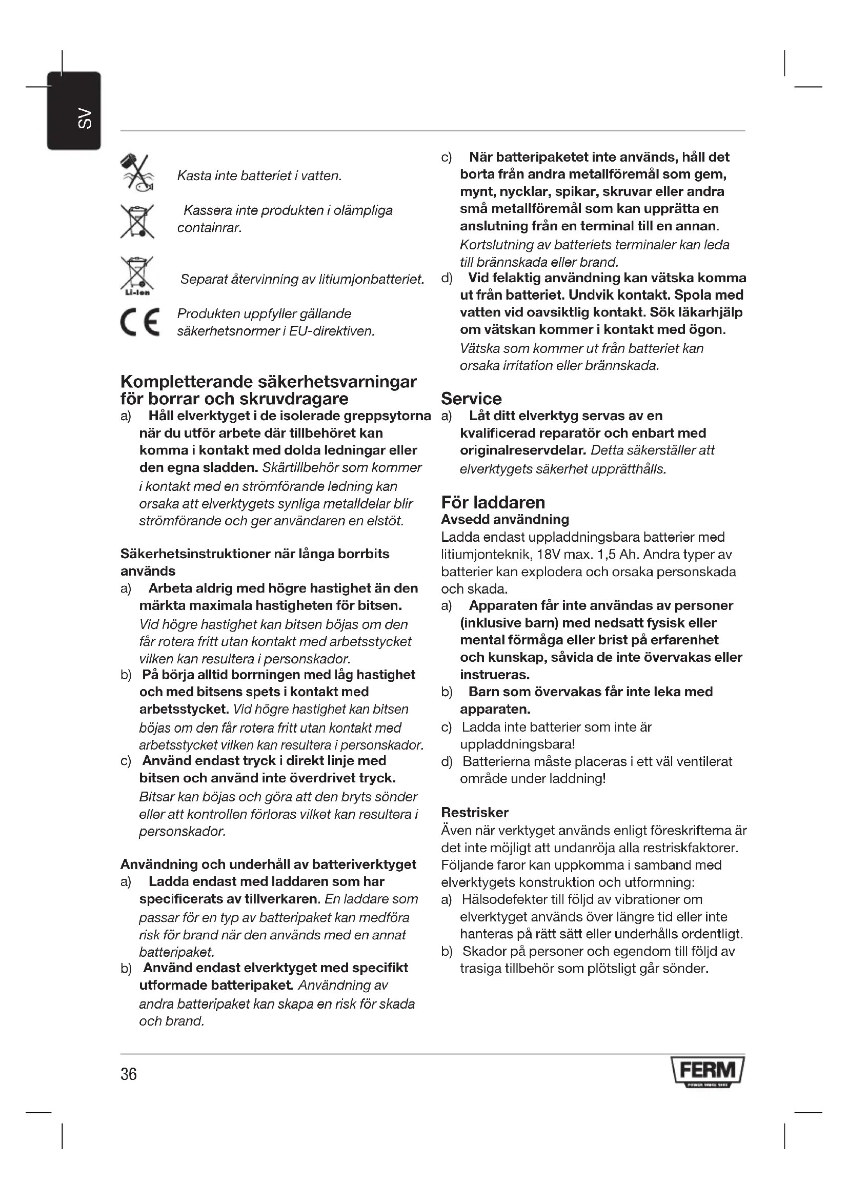 Kasta inte batteriet i vatten. Kassera inte produkten i olämpliga containrar. Separat återvinning av litiumjonbatteriet. Produkten uppfyller gällande säkerhetsnormer i EU-direktiven. Kompletterande säkerhetsvarningar för borrar och skruvdragare a) Håll elverktyget i de isolerade greppsytorna när du utför arbete där tillbehöret kan komma i kontakt med dolda ledningar eller den egna sladden. Skärtillbehör som kommer i kontakt med en strömförande ledning kan orsaka att elverktygets synliga metalldelar blir strömförande och ger användaren en elstöt. Säkerhetsinstruktioner när långa borrbits används a) Arbeta aldrig med högre hastighet än den märkta maximala hastigheten för bitsen. Vid högre hastighet kan bitsen böjas om den får rotera fritt utan kontakt med arbetsstycket vilken kan resultera i personskador. b) På börja alltid borrningen med låg hastighet och med bitsens spets i kontakt med arbetsstycket. Vid högre hastighet kan bitsen böjas om den får rotera fritt utan kontakt med arbetsstycket vilken kan resultera i personskador. c) Använd endast tryck i direkt linje med bitsen och använd inte överdrivet tryck. Bitsar kan böjas och göra att den bryts sönder eller att kontrollen förloras vilket kan resultera i personskador. Användning och underhåll av batteriverktyget a) Ladda endast med laddaren som har specificerats av tillverkaren. En laddare som passar för en typ av batteripaket kan medföra risk för brand när den används med en annat batteripaket.