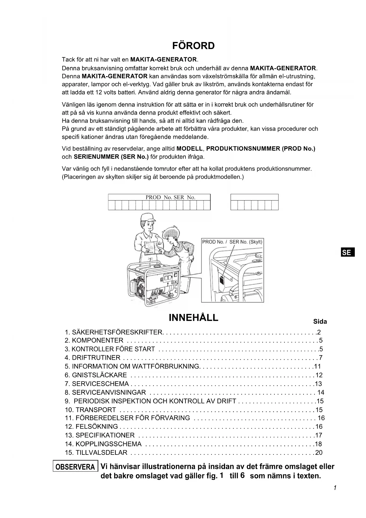 FÖRORD INNEHÅLL Tack för att ni har valt en MAKITA-GENERATOR. Denna bruksanvisning omfattar korrekt bruk och underhåll av denna MAKITA-GENERATOR. Denna MAKITA-GENERATOR kan användas som växelströmskälla för allmän el-utrustning, apparater, lampor och el-verktyg. Vad gäller bruk av likström, används kontakterna endast för att ladda ett 12 volts batteri. Använd aldrig denna generator för några andra ändamål.Vänligen läs igenom denna instruktion för att sätta er in i korrekt bruk och underhållsrutiner för att på så vis kunna använda denna produkt effektivt och säkert.Ha denna bruksanvisning till hands, så att ni alltid kan rådfråga den.På grund av ett ständigt pågående arbete att förbättra våra produkter, kan vissa procedurer och speci kationer ändras utan föregående meddelande. Vid beställning av reservdelar, ange alltid MODELL, PRODUKTIONSNUMMER (PROD No.) och SERIENUMMER (SER No.) för produkten ifråga.Var vänlig och fyll i nedanstående tomrutor efter att ha kollat produktens produktionsnummer. (Placeringen av skylten skiljer sig åt beroende på produktmodellen.) OBSERVERA Vi hänvisar illustrationerna på insidan av det främre omslaget eller det bakre omslaget vad gäller fig.