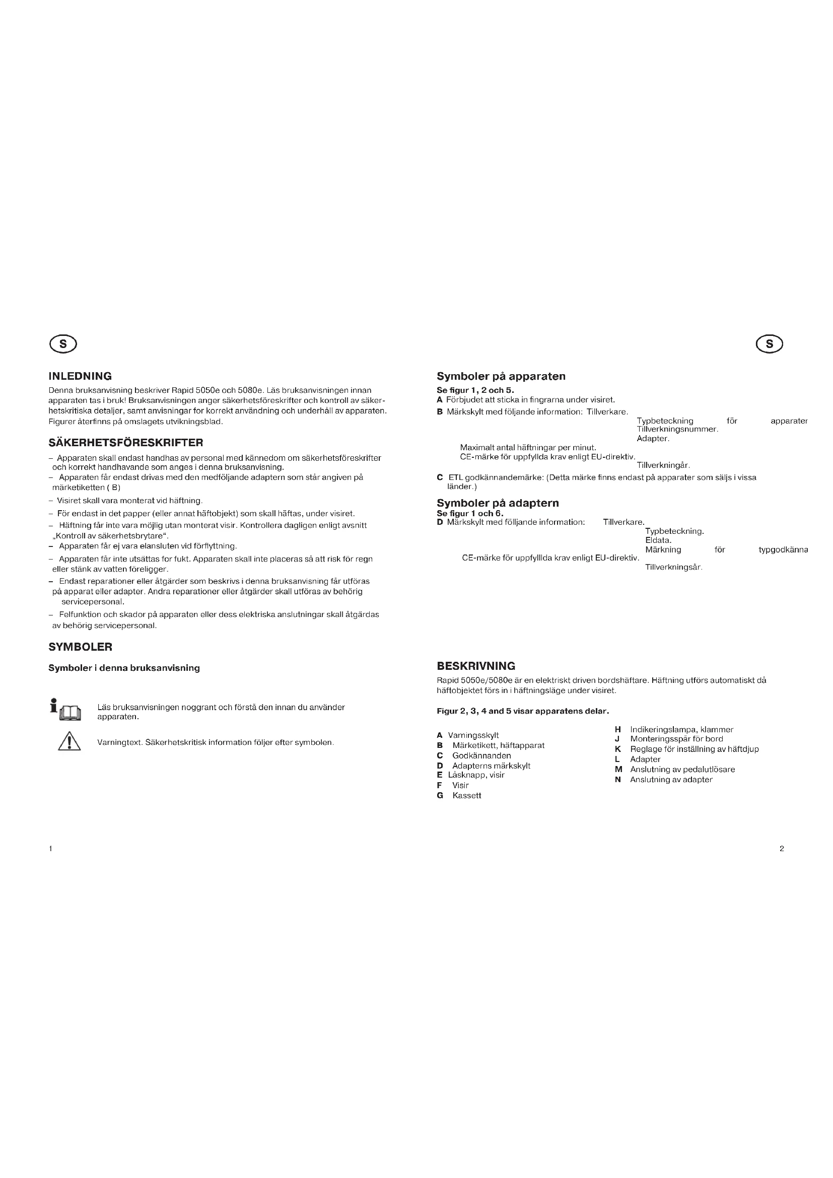 Symboler på apparaten Se figur 1, 2 och 5. A Förbjudet att sticka in fingrarna under visiret. B Märkskylt med följande information: Tillverkare. Typbeteckning för apparaten. Tillverkningsnummer. Adapter. Maximalt antal häftningar per minut. CE-märke för uppfyllda krav enligt EU-direktiv. Tillverkningår. C ETL godkännandemärke: (Detta märke finns endast på apparater som säljs i vissa länder.) Symboler på adaptern Se figur 1 och 6. D Märkskylt med fölljande information: Tillverkare. Typbeteckning. Eldata. Märkning för typgodkännande. CE-märke för uppfylllda krav enligt EU-direktiv. Tillverkningsår. BESKRIVNING Rapid 5050e/5080e är en elektriskt driven bordshäftare. Häftning utförs automatiskt då häftobjektet förs in i häftningsläge under visiret. Figur 2, 3, 4 and 5 visar apparatens delar. A Varningsskylt B Märketikett, häftapparat C Godkännanden D Adapterns märkskylt E Låsknapp, visir F Visir G Kassett H Indikeringslampa, klammer J Monteringsspår för bord K Reglage för inställning av häftdjup L Adapter M Anslutning av pedalutlösare N Anslutning av adapter