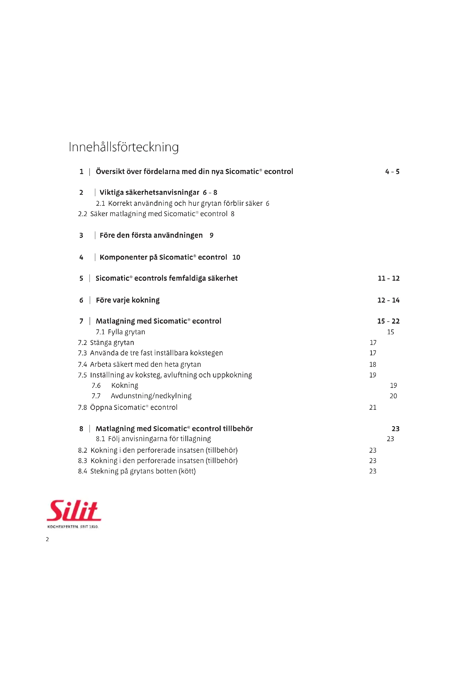3 | Före den första användningen 9 4 | Komponenter på Sicomatic® econtrol 10 5 | Sicomatic® econtrols femfaldiga säkerhet 11 - 12 6 | Före varje kokning 12 - 14 7 | Matlagning med Sicomatic® econtrol 15 - 22