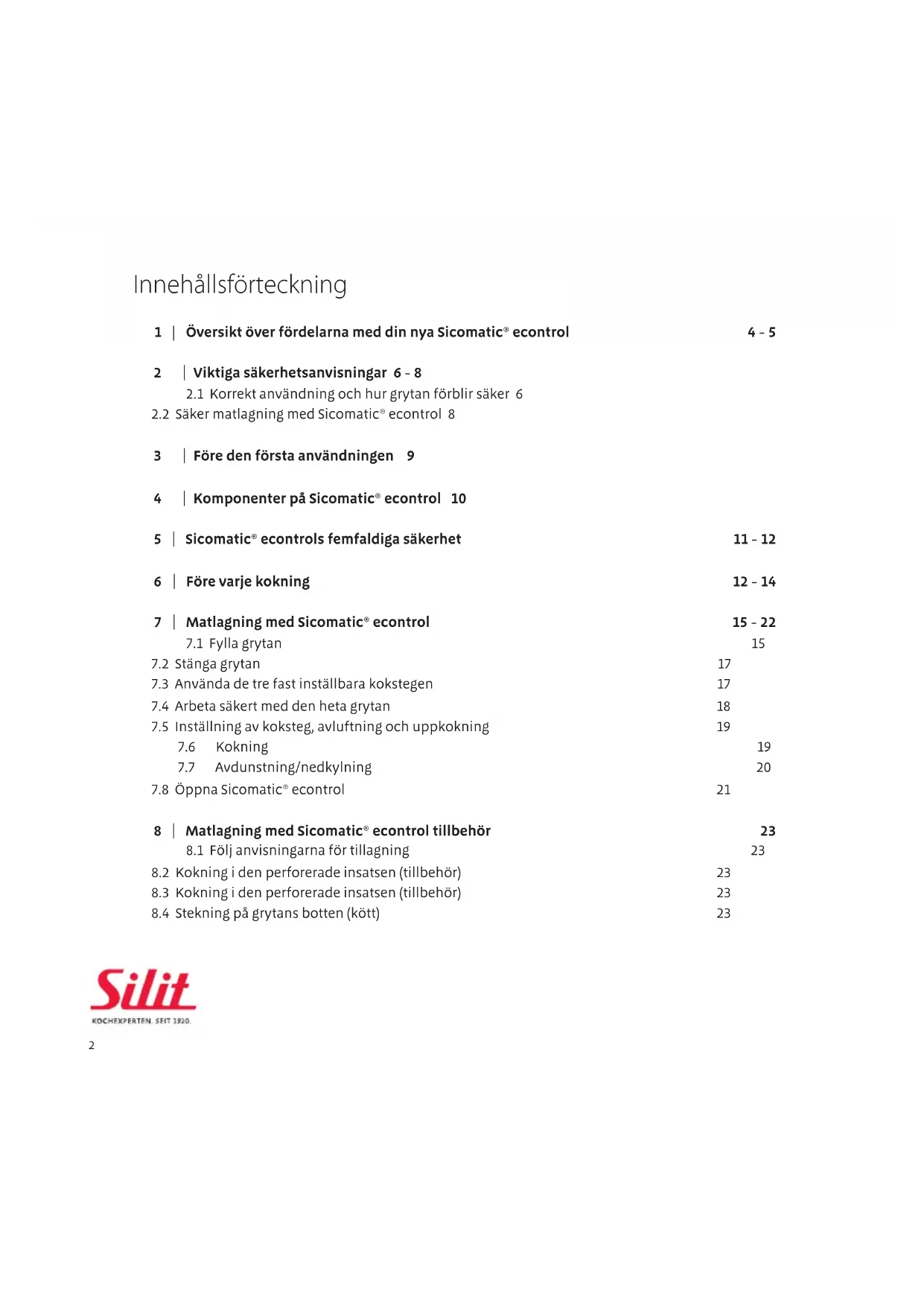 3 | Före den första användningen 9 4 | Komponenter på Sicomatic® econtrol 10 5 | Sicomatic® econtrols femfaldiga säkerhet 11 - 12 6 | Före varje kokning 12 - 14 7 | Matlagning med Sicomatic® econtrol 15 - 22