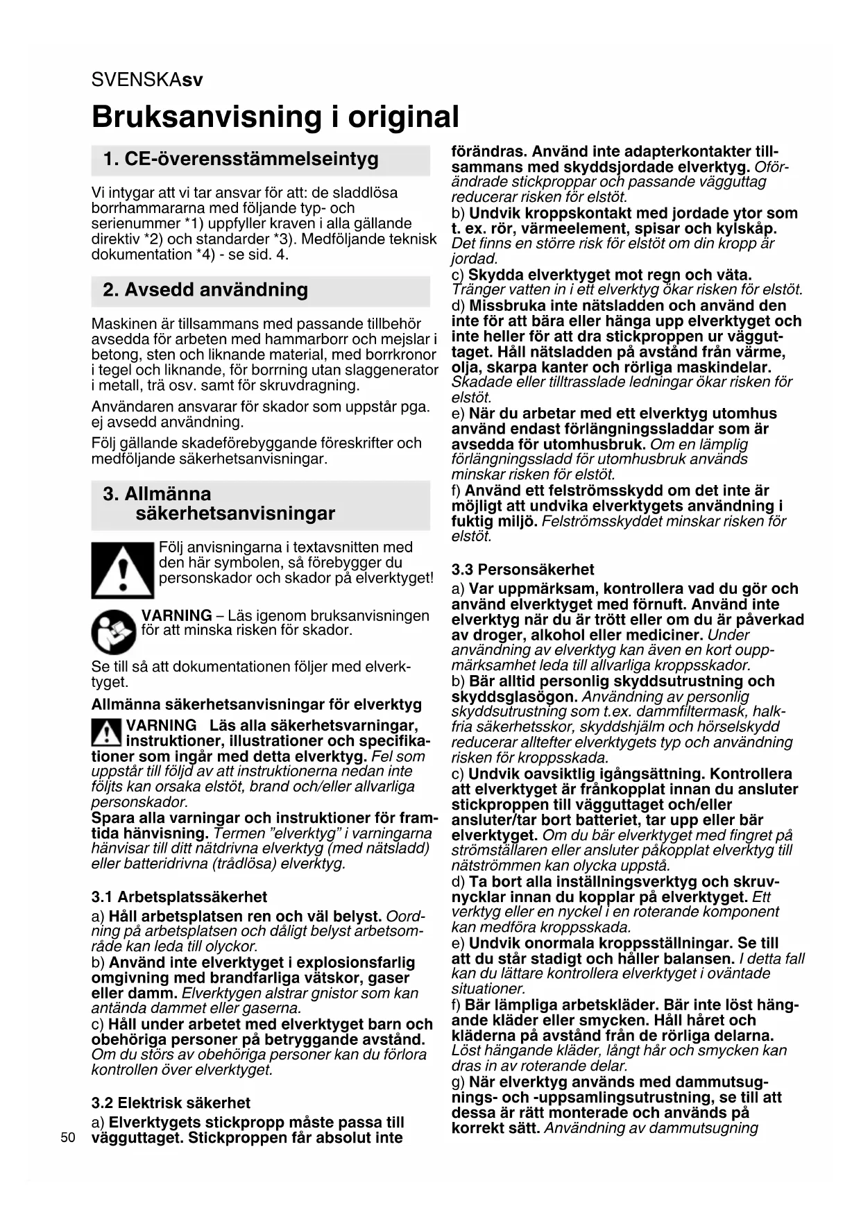 Vi intygar att vi tar ansvar för att: de sladdlösa borrhammararna med följande typ- och serienummer *1) uppfyller kraven i alla gällande direktiv *2) och standarder *3). Medföljande teknisk dokumentation *4) - se sid. 4. Maskinen är tillsammans med passande tillbehör avsedda för arbeten med hammarborr och mejslar i betong, sten och liknande material, med borrkronor i tegel och liknande, för borrning utan slaggenerator i metall, trä osv. samt för skruvdragning. Användaren ansvarar för skador som uppstår pga. ej avsedd användning. Följ gällande skadeförebyggande föreskrifter och medföljande säkerhetsanvisningar. Följ anvisningarna i textavsnitten med den här symbolen, så förebygger du personskador och skador på elverktyget! VARNING – Läs igenom bruksanvisningen för att minska risken för skador. Se till så att dokumentationen följer med elverk- tyget. Allmänna säkerhetsanvisningar för elverktyg VARNING Läs alla säkerhetsvarningar, instruktioner, illustrationer och specifika- tioner som ingår med detta elverktyg. Fel som uppstår till följd av att instruktionerna nedan inte följts kan orsaka elstöt, brand och/eller allvarliga personskador. Spara alla varningar och instruktioner för fram- tida hänvisning. Termen ”elverktyg” i varningarna hänvisar till ditt nätdrivna elverktyg (med nätsladd) eller batteridrivna (trådlösa) elverktyg.