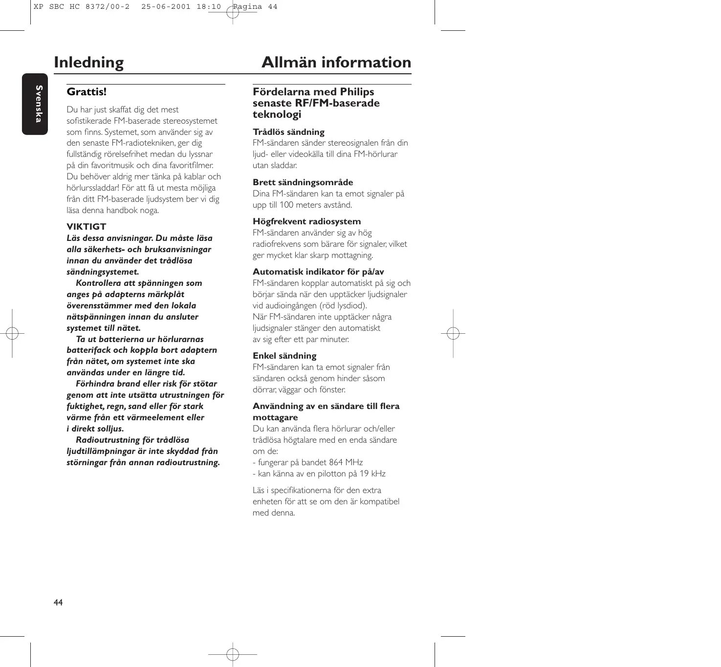 25-06-2001 18:10 Inledning Svenska Grattis! Du har just skaffat dig det mest sofistikerade FM-baserade stereosystemet som finns. Systemet, som använder sig av den senaste FM-radiotekniken, ger dig fullständig rörelsefrihet medan du lyssnar på din favoritmusik och dina favoritfilmer. Du behöver aldrig mer tänka på kablar och hörlurssladdar! För att få ut mesta möjliga från ditt FM-baserade ljudsystem ber vi dig läsa denna handbok noga. VIKTIGT Läs dessa anvisningar. Du måste läsa alla säkerhets- och bruksanvisningar innan du använder det trådlösa sändningsystemet. Kontrollera att spänningen som anges på adapterns märkplåt överensstämmer med den lokala nätspänningen innan du ansluter systemet till nätet. Ta ut batterierna ur hörlurarnas batterifack och koppla bort adaptern från nätet, om systemet inte ska användas under en längre tid. Förhindra brand eller risk för stötar genom att inte utsätta utrustningen för fuktighet, regn, sand eller för stark värme från ett värmeelement eller i direkt solljus. Radioutrustning för trådlösa ljudtillämpningar är inte skyddad från störningar från annan radioutrustning. Pagina 44 Allmän information Fördelarna med Philips senaste RF/FM-baserade teknologi Trådlös sändning FM-sändaren sänder stereosignalen från din ljud- eller videokälla till dina FM-hörlurar utan sladdar. Brett sändningsområde Dina FM-sändaren kan ta emot signaler på upp till 100 meters avstånd. Högfrekvent radiosystem FM-sändaren använder sig av hög radiofrekvens som bärare för signaler, vilket ger mycket klar skarp mottagning. Automatisk indikator för på/av FM-sändaren kopplar automatiskt på sig och börjar sända när den upptäcker ljudsignaler vid audioingången (röd lysdiod). När FM-sändaren inte upptäcker några ljudsignaler stänger den automatiskt av sig efter ett par minuter. Enkel sändning FM-sändaren kan ta emot signaler från sändaren också genom hinder såsom dörrar, väggar och fönster. Användning av en sändare till flera mottagare Du kan använda flera hörlurar och/eller trådlösa högtalare med en enda sändare om de: - fungerar på bandet 864 MHz - kan känna av en pilotton på 19 kHz Läs i specifikationerna för den extra enheten för att se om den är kompatibel med denna.