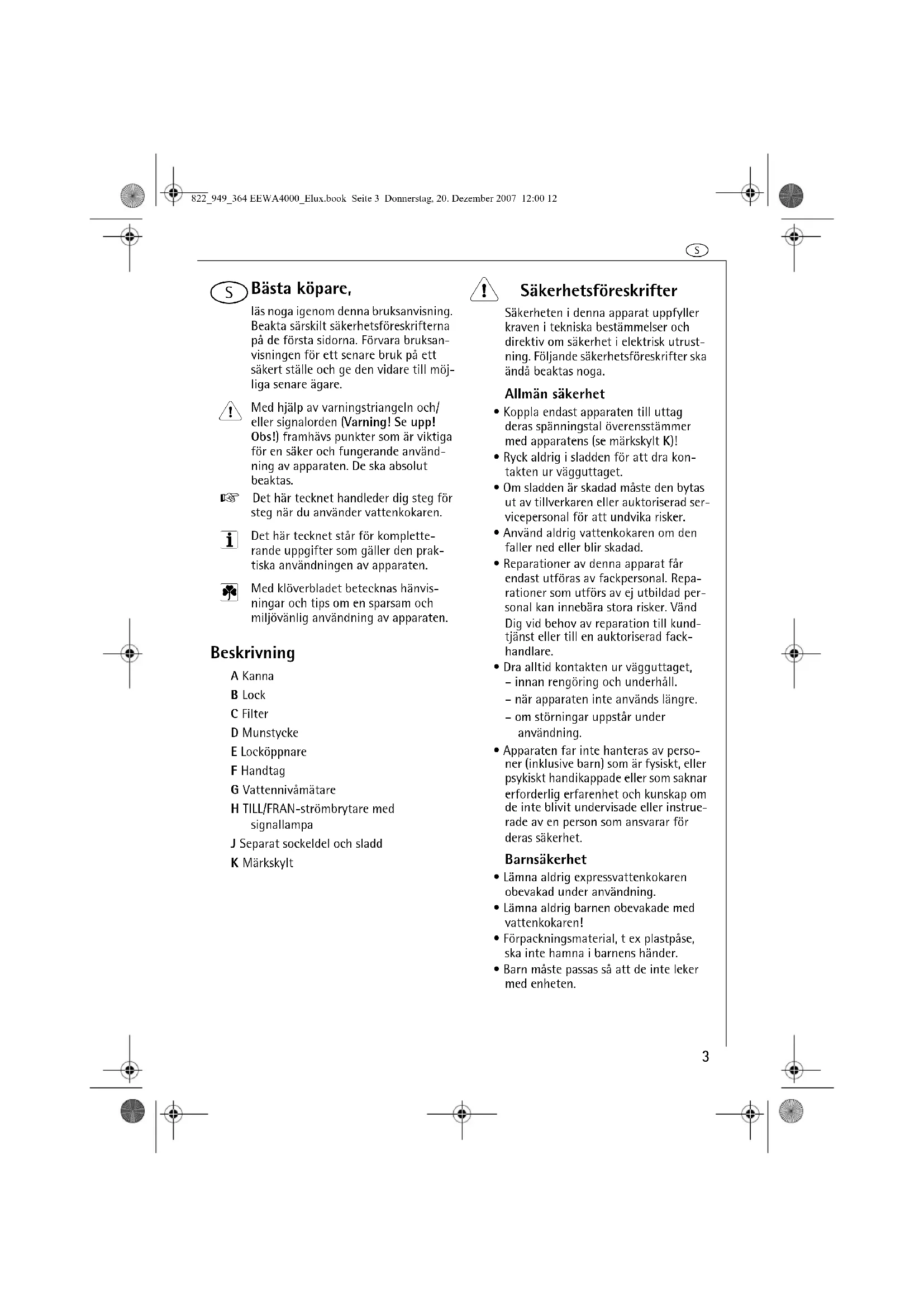 Bästa köpare, läs noga igenom denna bruksanvisning. Beakta särskilt säkerhetsföreskrifterna på de första sidorna. Förvara bruksan-visningen för ett senare bruk på ett säkert ställe och ge den vidare till möj-liga senare ägare. Med hjälp av varningstriangeln och/eller signalorden (Varning! Se upp! Obs!) framhävs punkter som är viktiga för en säker och fungerande använd-ning av apparaten. De ska absolut beaktas. 0 Det här tecknet handleder dig steg för steg när du använder vattenkokaren. Det här tecknet står för komplette-rande uppgifter som gäller den prak-tiska användningen av apparaten. Med klöverbladet betecknas hänvis-ningar och tips om en sparsam och miljövänlig användning av apparaten. Beskrivning A KannaB LockC FilterD MunstyckeE LocköppnareF HandtagG VattennivåmätareH TILL/FRAN-strömbrytare med signallampaJ Separat sockeldel och sladdK Märkskylt 1 Säkerhetsföreskrifter Säkerheten i denna apparat uppfyller kraven i tekniska bestämmelser och direktiv om säkerhet i elektrisk utrust-ning. Följande säkerhetsföreskrifter ska ändå beaktas noga.Allmän säkerhet• Koppla endast apparaten till uttag deras spänningstal överensstämmer med apparatens (se märkskylt K)!• Ryck aldrig i sladden för att dra kon-takten ur vägguttaget.• Om sladden är skadad måste den bytas ut av tillverkaren eller auktoriserad ser-vicepersonal för att undvika risker.• Använd aldrig vattenkokaren om den faller ned eller blir skadad.• Reparationer av denna apparat får endast utföras av fackpersonal. Repa-rationer som utförs av ej utbildad per-sonal kan innebära stora risker. Vänd Dig vid behov av reparation till kund-tjänst eller till en auktoriserad fack-handlare.• Dra alltid kontakten ur vägguttaget,– innan rengöring och underhåll.– när apparaten inte används längre.– om störningar uppstår under användning.• Apparaten far inte hanteras av perso-ner (inklusive barn) som är fysiskt, eller psykiskt handikappade eller som saknar erforderlig erfarenhet och kunskap om de inte blivit undervisade eller instrue-rade av en person som ansvarar för deras säkerhet.Barnsäkerhet• Lämna aldrig expressvattenkokaren obevakad under användning.• Lämna aldrig barnen obevakade med vattenkokaren!• Förpackningsmaterial, t ex plastpåse, ska inte hamna i barnens händer.• Barn måste passas så att de inte leker med enheten.822_949_364 EEWA4000_Elux.book Seite 3 Donnerstag, 20. Dezember 2007 12:00 12s