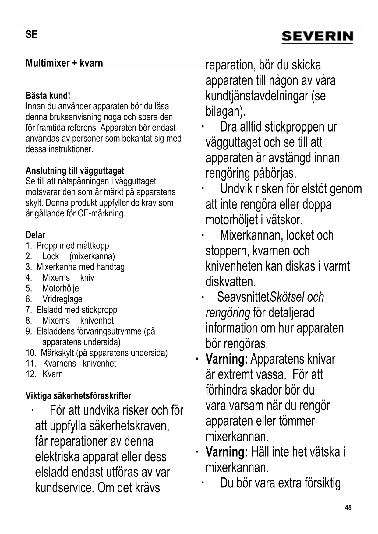 Viktiga säkerhetsföreskrifter ∙ För att undvika risker och för att uppfylla säkerhetskraven, får reparationer av denna elektriska apparat eller dess elsladd endast utföras av vår kundservice. Om det krävs reparation, bör du skicka apparaten till någon av våra kundtjänstavdelningar (se bilagan). ∙ Dra alltid stickproppen ur vägguttaget och se till att apparaten är avstängd innan rengöring påbörjas. ∙ Undvik risken för elstöt genom att inte rengöra eller doppa motorhöljet i vätskor. ∙ Mixerkannan, locket och stoppern, kvarnen och knivenheten kan diskas i varmt diskvatten. ∙ Se avsnittet Skötsel och rengöring för detaljerad information om hur apparaten bör rengöras. ∙ Varning: Apparatens knivar är extremt vassa. För att förhindra skador bör du vara varsam när du rengör apparaten eller tömmer mixerkannan. ∙ Varning: Häll inte het vätska i mixerkannan. ∙ Du bör vara extra försiktig SE46 när du häller heta vätskor i mixerkannan eftersom ånga kan strömma ur apparaten. ∙ Sätt endast små mängder vätska (t ex olja för pesto) i kvarnen. ∙ Varning: Felaktig användning kan orsaka svåra personskador. ∙ Stäng alltid av mixern och dra stickproppen ur vägguttaget, - när apparaten inte övervakas, - innan du öppnar locket, - innan du avlägsnar eller monterar på mixerkannan eller kvarnen, - om mixern skulle krångla under användningen, - innan du påbörjar rengöring, - efter användning. ∙ Ta stickproppen ur vägguttaget genom att dra i stickproppen, aldrig i sladden. ∙ Apparaten är avsedd för hemmabruk eller liknande användning, såsom - i personalkök, kontor och andra kommersiella miljöer, - i företag inom jordbrukssektorn, - för gäster i hotell, motell och liknande inkvarteringsställen, - för gäster i bed-and-breakfast hus. ∙ Denna apparat kan användas av personer som har minskad fysisk rörelseförmåga, reducerat sinnes- eller mentaltillstånd, eller som har bristfällig erfarenhet och kunskap, förutsatt att dessa personer är under uppsyn eller har fått tillräckliga instruktioner beträffande apparatens användning och vet vilka risker och säkerhetsåtgärder som användningen innefattar. ∙ Barn får inte använda denna apparat. Apparaten och dess elsladd bör ställas utom räckhåll för barn. ∙ Barn bör inte tillåtas leka med apparaten. ∙ Varning: Håll barn på avstånd från apparatens förpackningsmaterial eftersom fara eventuellt kan uppstå. Det fi nns t.ex. risk för kvävning. ∙ Innan varje användning bör apparaten47 samt dess elsladd och monterade tillbehör inspekteras noga så att de inte har några skador. Om apparaten t ex har tappats på en hård yta, eller om elsladden har utsatts för alltför hård kraft, bör den inte längre användas: Även osynliga skador kan försämra apparatens driftsäkerhet. ∙ Apparaten bör endast placeras på en jämn yta. Låt inte höljet eller elsladden komma i kontakt med öppen eld eller heta ytor såsom spisplattor. ∙ Låt inte sladden hänga fritt. ∙ Rör inte de rörliga delarna av matberedaren när den är i användning - detta kan vara ytterst farligt. ∙ Inget ansvar godtas om skada uppkommer till följd av felaktig användning, eller om dessa instruktioner inte följts. Innan första användningen Innan apparaten används för första gången, bör mixerkannan, locket och stopparen, kvarnen och knivenheten rengöras grundligt enligt avsnittet Skötsel och rengöring. Funktionsknappens lägen Följande inställningar fi nns: P Apparaten används med maximal effekt så länge vridreglaget hålls i denna position. 0 Apparaten är avstängd I Låg effekt II Maximal effekt Kortvarig användning Apparaten är konstruerad för att bereda normala kvantiteter mat i hemmet. Den kan användas utan paus i max 3 minuter med mixerkannan, eller max 30 sekunder med kvarnen, varefter den bör låtas svalna till rumstemperatur. Säkerhetsknapp En säkerhetsanordning i motorhöljet ser till att mixern endast kan startas om mixerkannan eller kvarnen är ordentligt på plats (låst position). Innan du avlägsnar någon av dem måste du vara säker på att vridreglaget är ställt på 0. Detta gäller också när du placerar mixerkannan eller kvarnen på motorhöljet. Om reglaget inte är i dess av-läge (0) startar motorn omedelbart. Multimixerns användning ∙ Placera mixerkannan på motorhöljet med dess handtag åt höger och se till att de två triangelsymbolerna kommer i rät linje. ∙ Sätt de fl ytande ingredienserna i mixerkannan. Kannan har en maximal kapacitet på 1000 ml. För att undvika eventuellt skum eller spill när du använder skummande eller tunna vätskor såsom mjölk, bör du inte fylla kannan över 700 ml märket. ∙ Sätt locket på plats så att pipen är helt täckt. ∙ Locket bör alltid vara på sin plats då mixern är i gång. ∙ För att tillsätta ingredienser medan apparaten är i gång tar du bort proppen i mitten av locket. Placera inga föremål i mixerkannan medan apparaten är i användning. ∙ Sätt stickproppen i ett eluttag och använd48 vridreglaget för att välja den önskade effektinställningen. ∙ Varning: Starta inte apparaten när mixerkannan är tom. Fyll den inte enbart med torra varor såsom nötter, mandlar osv. ∙ Efter det att mixern använts, stänger du av apparaten och drar stickproppen ur vägguttaget. Vänta tills motorn har stannat helt innan du avlägsnar mixerkannan. Så använder du multimixern för att krossa is Iskuber kan lätt krossas i mixerkannan: Fyll kannan till en fjärdedel med iskuber, montera kannan på motorhöljet enligt beskrivningen i avsnittet Multimixerns användning. Lägg locket med stoppern på plats, och använd pulsfunktionen (P) i ca 2 sekunder. Vänta tills iskuberna har samlats i kannans botten igen och upprepa processen tills kuberna har minskats till önskad storlek. Så använder du kvarnen ∙ Kvarnen är behändig när du vill fi nfördela 