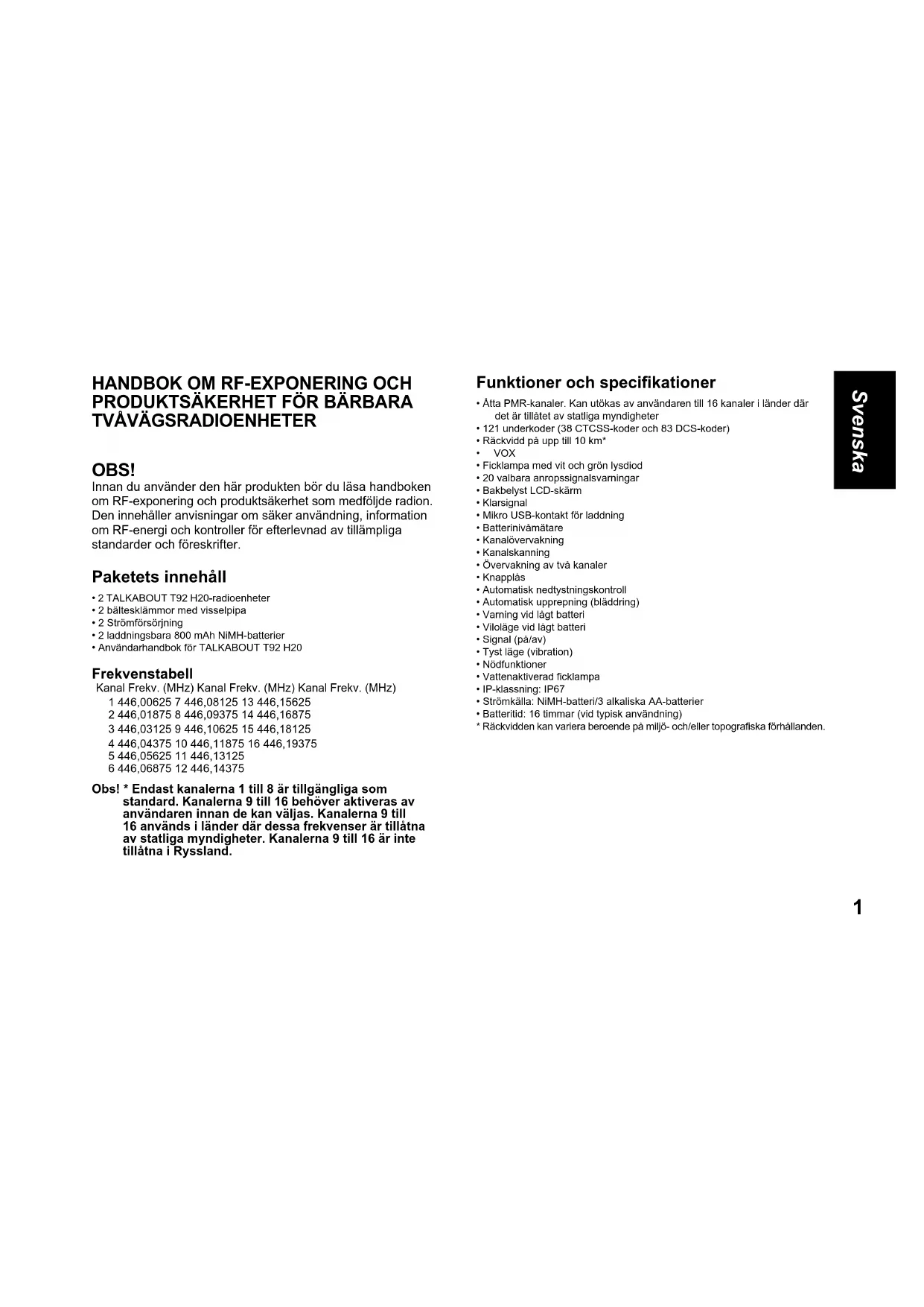 - 2 TALKABOUT T92 H20-radioenheter• 2 bältesklämmor med visselpipa• 2 Strömförsörjning• 2 laddningsbara 800 mAh NiMH-batterier• Användarhandbok för TALKABOUT T92 H20 Frekvenstabell Obs! * Endast kanalerna 1 till 8 är tillgängliga som standard. Kanalerna 9 till 16 behöver aktiveras av användaren innan de kan väljas. Kanalerna 9 till 16 används i länder där dessa frekvenser är tillåtna av statliga myndigheter. Kanalerna 9 till 16 är inte tillåtna i Ryssland. Funktioner och specifikationer