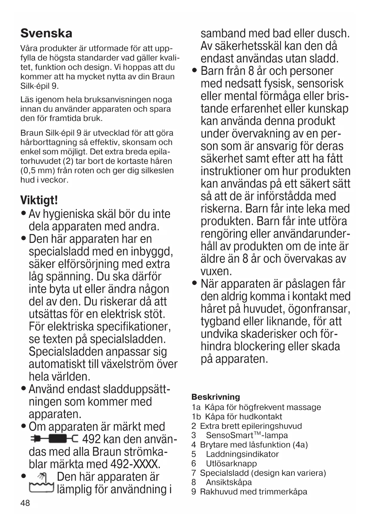 For varer kjøpt i Norge har kunden garanti i henhold til NEL’s Leveringsbetingelser. 91392809_SES_9890_9880_9870_9700_JUNO_S6-124.indd 4791392809_SES_9890_9880_9870_9700_JUNO_S6-124.indd 47 30.05.17 08:2630.05.17 08:26 CSS APPROVED Effective Date 2Jun2017 GMT - Printed 30Aug2017 Page 47 of 12448 Svenska Våra produkter är utformade för att upp- fylla de högsta standarder vad gäller kvali- tet, funktion och design. Vi hoppas att du kommer att ha mycket nytta av din Braun Silk·épil 9. Läs igenom hela bruksanvisningen noga innan du använder apparaten och spara den för framtida bruk. Braun Silk·épil 9 är utvecklad för att göra hårborttagning så effektiv, skonsam och enkel som möjligt. Det extra breda epila- torhuvudet (2) tar bort de kortaste håren (0,5 mm) från roten och ger dig silkeslen hud i veckor. Viktigt!