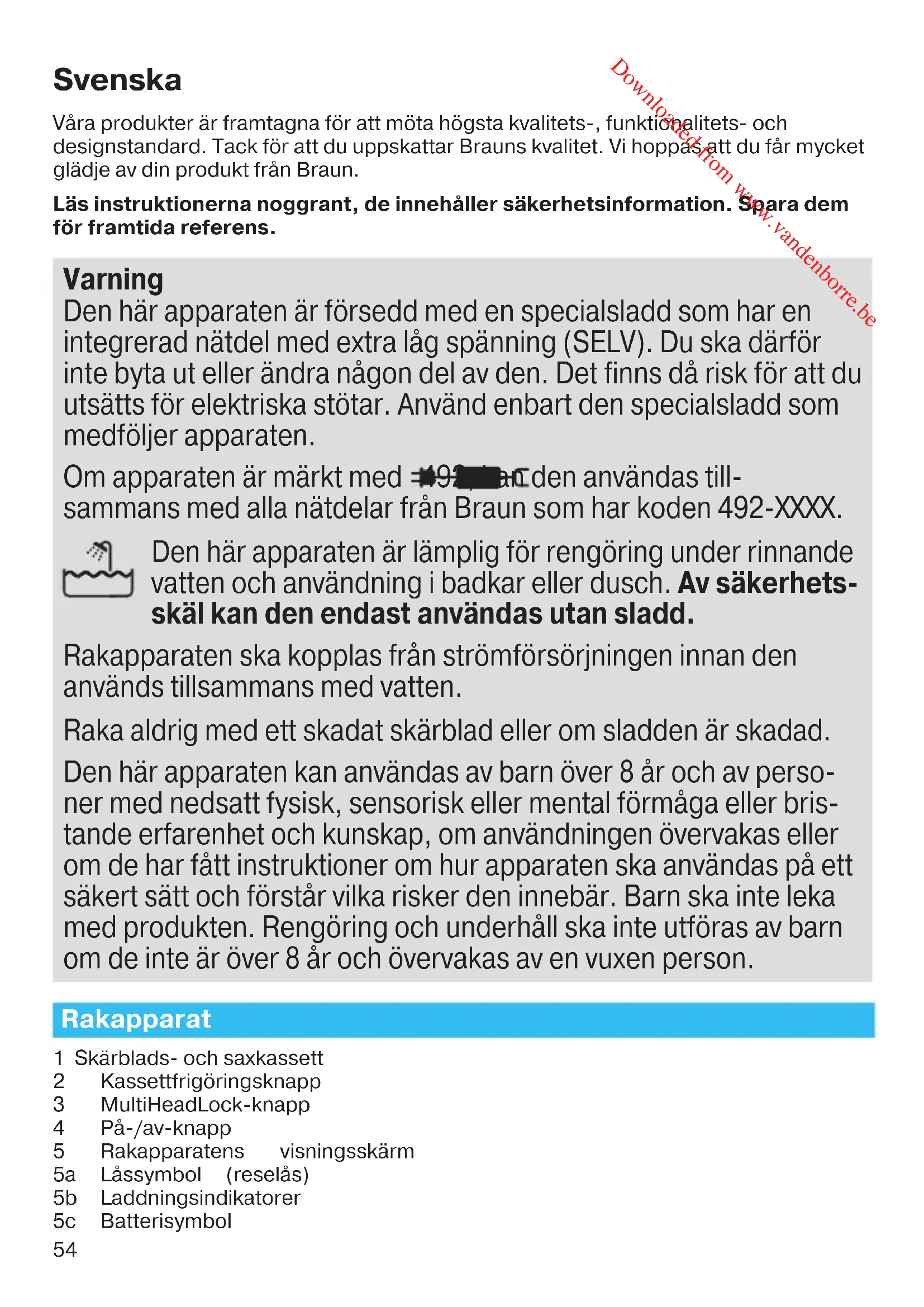 For varer kjøpt i Norge har kunden garanti i henhold til NEL’s Leveringsbetingelser. 91092670_Series_5-2_SOLO_Euro_S6-140.indd 5391092670_Series_5-2_SOLO_Euro_S6-140.indd 53 05.12.16 13:2205.12.16 13:22 CSS APPROVED Effective Date 8Dec2016 GMT - Printed 05Apr2017 Page 52 of 139 Downloaded from www.vandenborre.be54 Svenska Våra produkter är framtagna för att möta högsta kvalitets-, funktionalitets- och designstandard. Tack för att du uppskattar Brauns kvalitet. Vi hoppas att du får mycket glädje av din produkt från Braun. Läs instruktionerna noggrant, de innehåller säkerhetsinformation. Spara dem för framtida referens. Varning Den här apparaten är försedd med en specialsladd som har en integrerad nätdel med extra låg spänning (SELV). Du ska därför inte byta ut eller ändra någon del av den. Det finns då risk för att du utsätts för elektriska stötar. Använd enbart den specialsladd som medföljer apparaten. Om apparaten är märkt med 492, kan den användas till- sammans med alla nätdelar från Braun som har koden 492-XXXX. Den här apparaten är lämplig för rengöring under rinnande vatten och användning i badkar eller dusch. Av säkerhets- skäl kan den endast användas utan sladd. Rakapparaten ska kopplas från strömförsörjningen innan den används tillsammans med vatten. Raka aldrig med ett skadat skärblad eller om sladden är skadad. Den här apparaten kan användas av barn över 8 år och av perso- ner med nedsatt fysisk, sensorisk eller mental förmåga eller bris- tande erfarenhet och kunskap, om användningen övervakas eller om de har fått instruktioner om hur apparaten ska användas på ett säkert sätt och förstår vilka risker den innebär. Barn ska inte leka med produkten. Rengöring och underhåll ska inte utföras av barn om de inte är över 8 år och övervakas av en vuxen person. Rakapparat 1 Skärblads- och saxkassett 2 Kassettfrigöringsknapp 3 MultiHeadLock-knapp 4 På-/av-knapp 5 Rakapparatens visningsskärm 5a Låssymbol (reselås) 5b Laddningsindikatorer 5c Batterisymbol 91092670_Series_5-2_SOLO_Euro_S6-140.indd 5491092670_Series_5-2_SOLO_Euro_S6-140.indd 54 05.12.16 13:2205.12.16 13:22 CSS APPROVED Effective Date 8Dec2016 GMT - Printed 05Apr2017 Page 53 of 139 Downloaded from www.vandenborre.be55 6 Trimmer för långa hårstrån 7 Rakapparatens kontakter mot stationen 8 Lossningsknapp för trimmer för långa hårstrån 9 Rakapparatens eluttag 10 Specialsladd (utformning kan skifta) 11 Laddningsstation* 12 Skyddskåpa* 13 Resefodral*