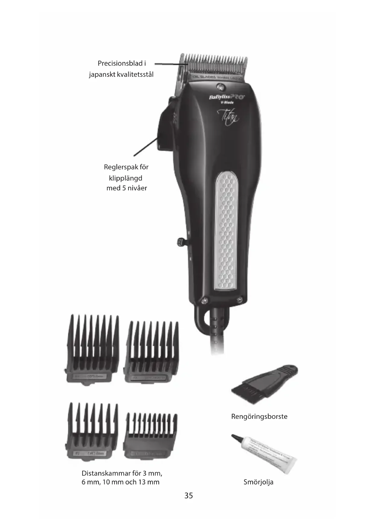 lame mobile 1mm 1mm35 Smörjolja Rengöringsborste Reglerspak för klipplängd med 5 nivåer Precisionsblad i japanskt kvalitetsstål Distanskammar för 3 mm, 6 mm, 10 mm och 13 mm36 SVENSKA FX685E PRECISIONSTRIMMERN V-BLADE Trimmern V-Blade från BaBylissPRO
