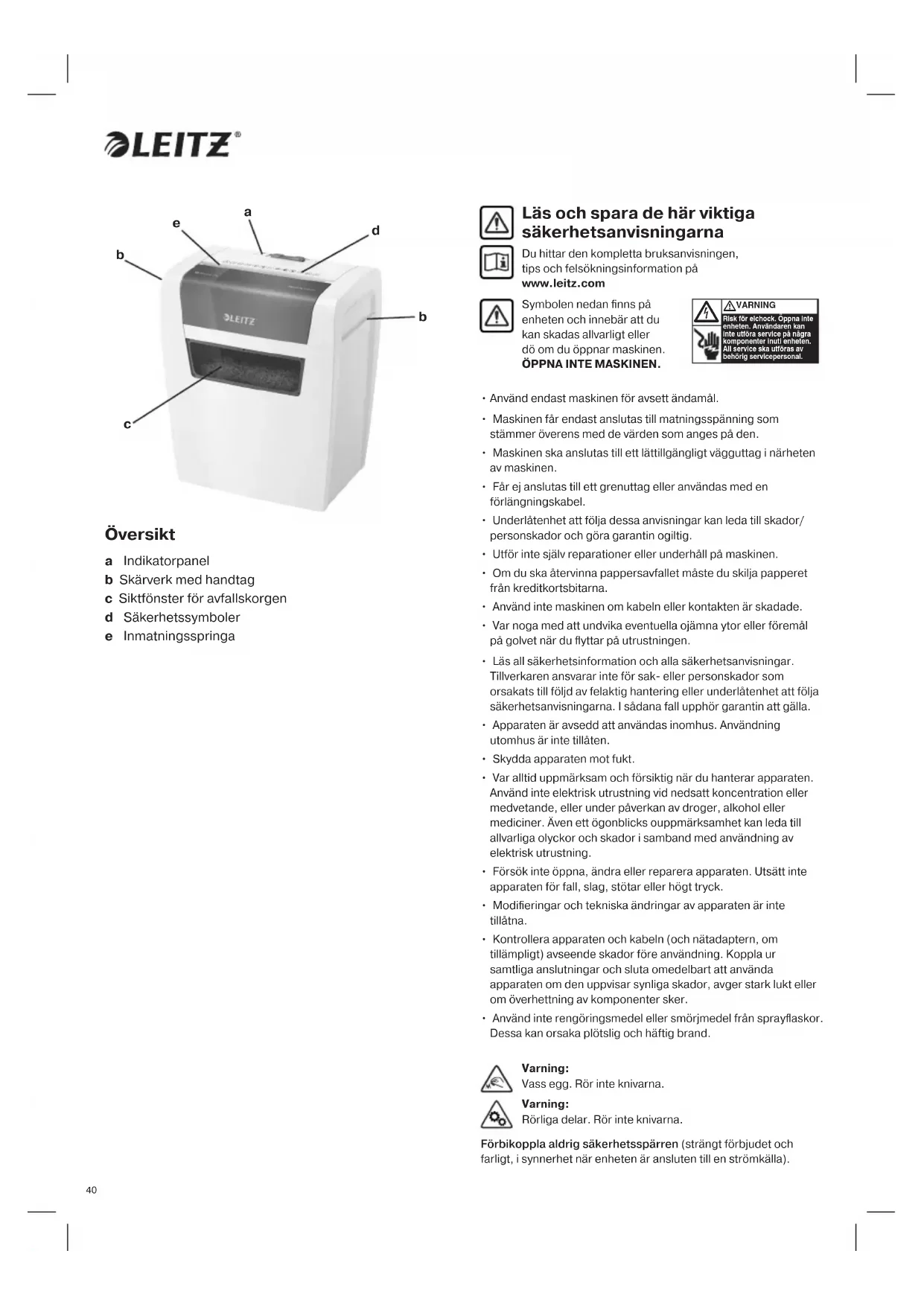 - Använd inte rengöringsmedel eller smörjmedel från sprayflaskor. Dessa kan orsaka plötslig och häftig brand. Läs och spara de här viktiga säkerhetsanvisningarna Du hittar den kompletta bruksanvisningen, tips och felsökningsinformation på www.leitz.com Symbolen nedan finns på enheten och innebär att du kan skadas allvarligt eller dö om du öppnar maskinen. ÖPPNA INTE MASKINEN. Risk för elchock. Öppna inte enheten. Användaren kan inte utföra service på några komponenter inuti enheten. All service ska utföras av behörig servicepersonal. VARNING