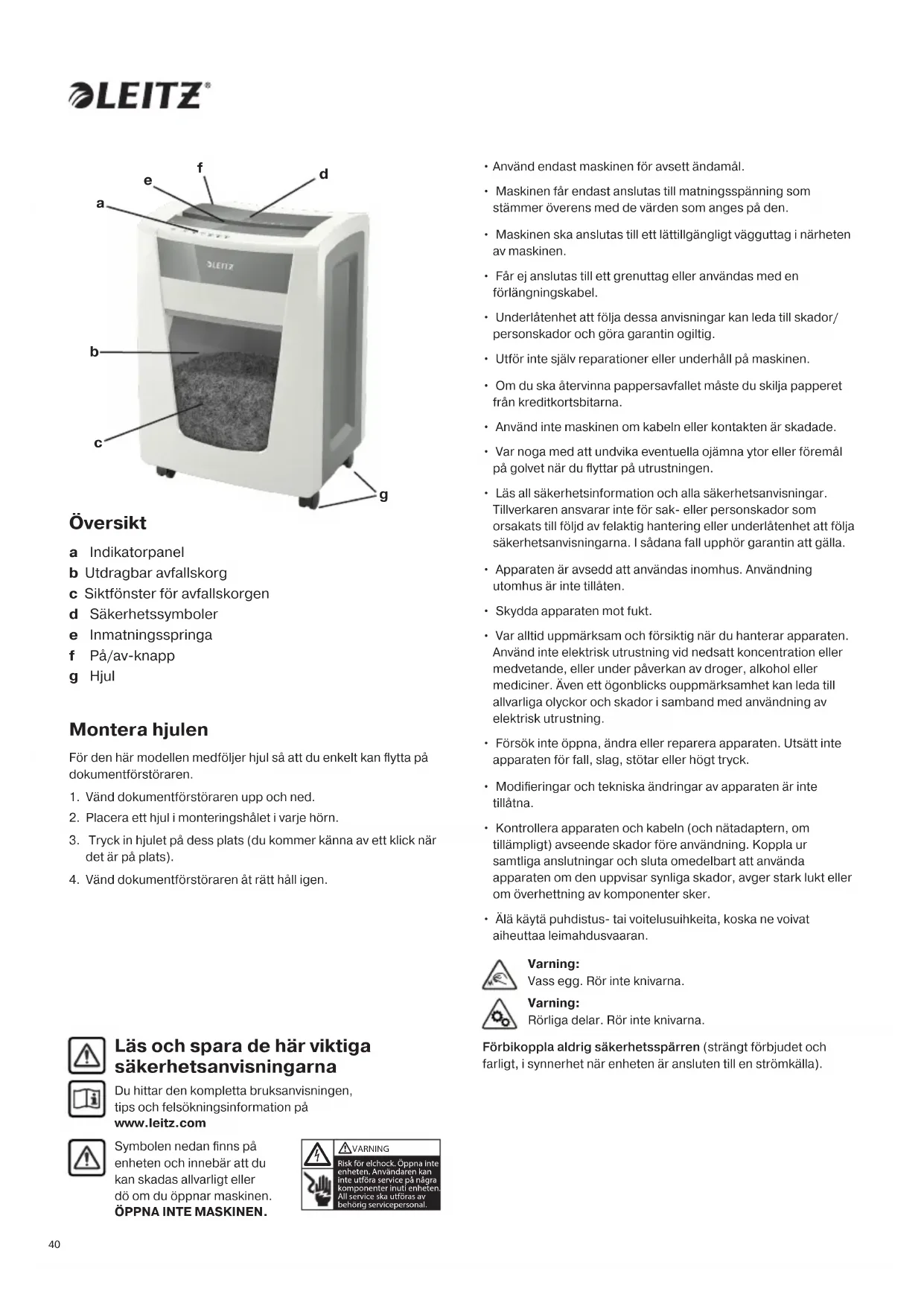 Förbikoppla aldrig säkerhetsspärren (strängt förbjudet och farligt, i synnerhet när enheten är ansluten till en strömkälla). Varning: Vass egg. Rör inte knivarna. Varning: Rörliga delar. Rör inte knivarna. Översikt a Indikatorpanel b Utdragbar avfallskorg c Siktfönster för avfallskorgen d Säkerhetssymboler e Inmatningsspringa f På/av-knapp g Hjul Montera hjulen För den här modellen medföljer hjul så att du enkelt kan flytta på dokumentförstöraren.